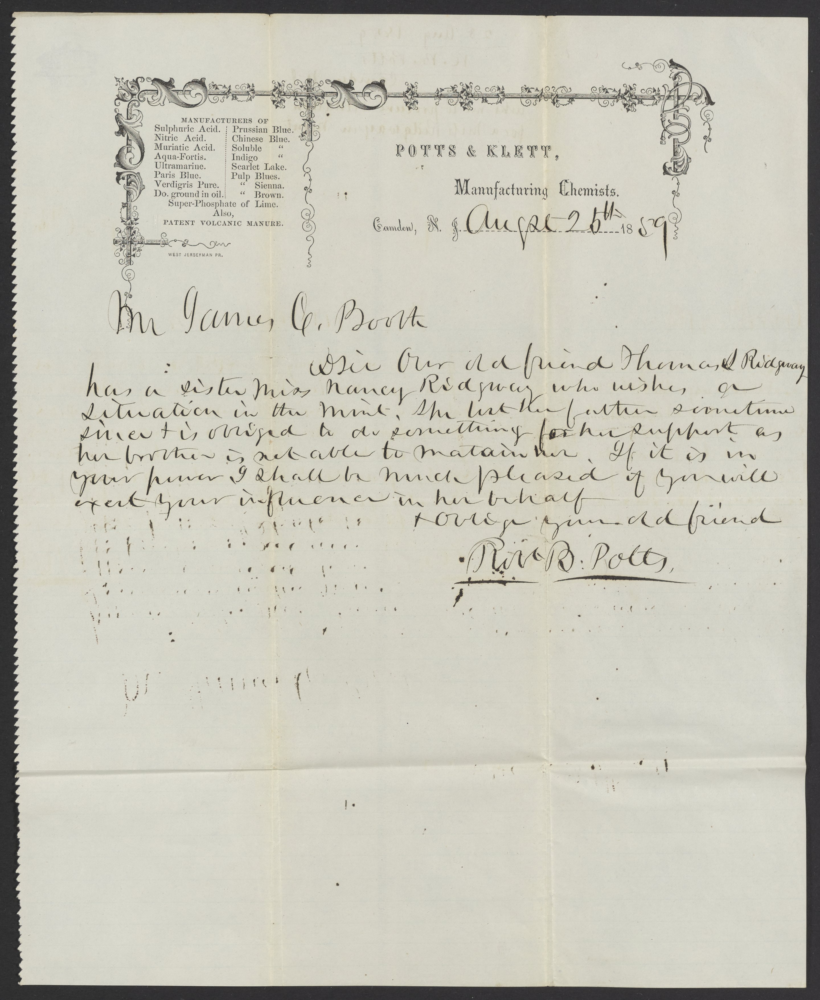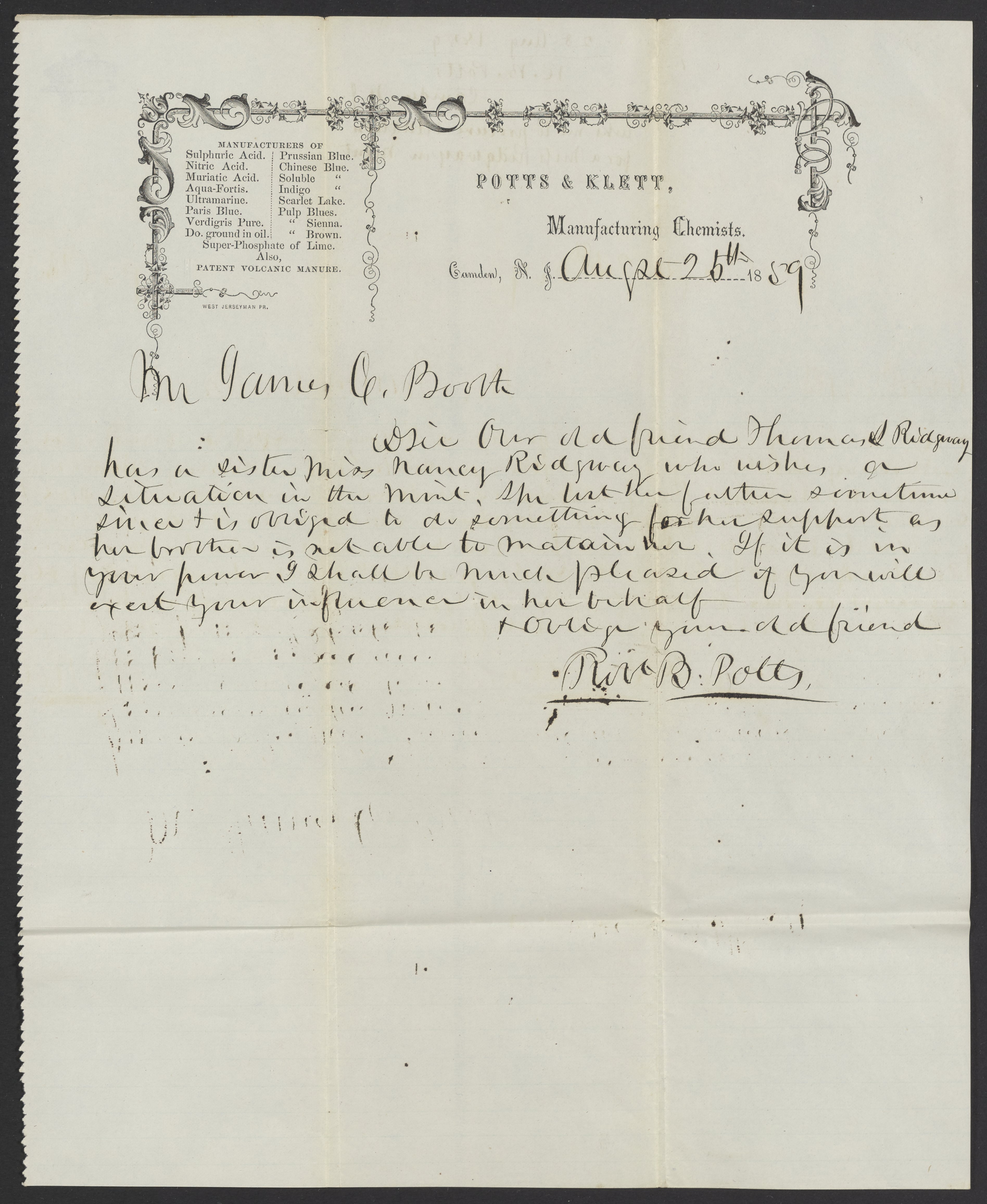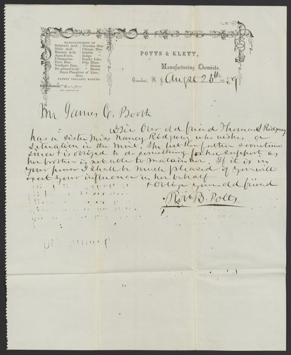 Letter from Robert B. Potts to James Curtis Booth, August 25, 1859