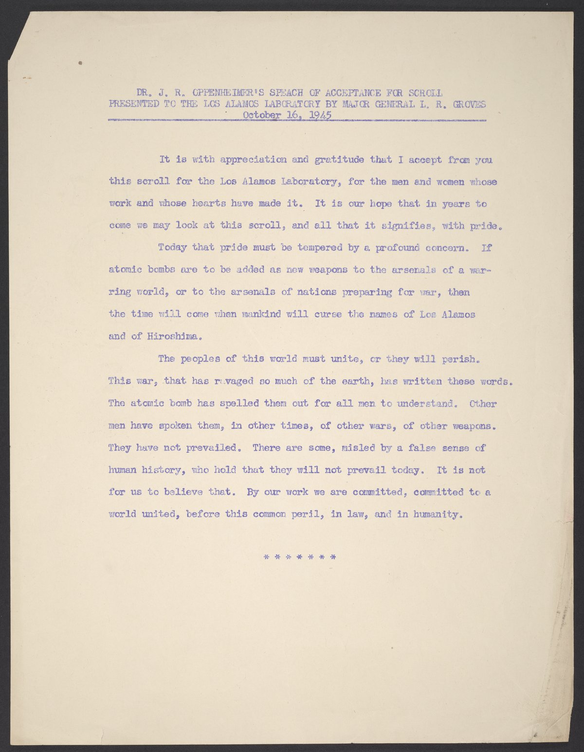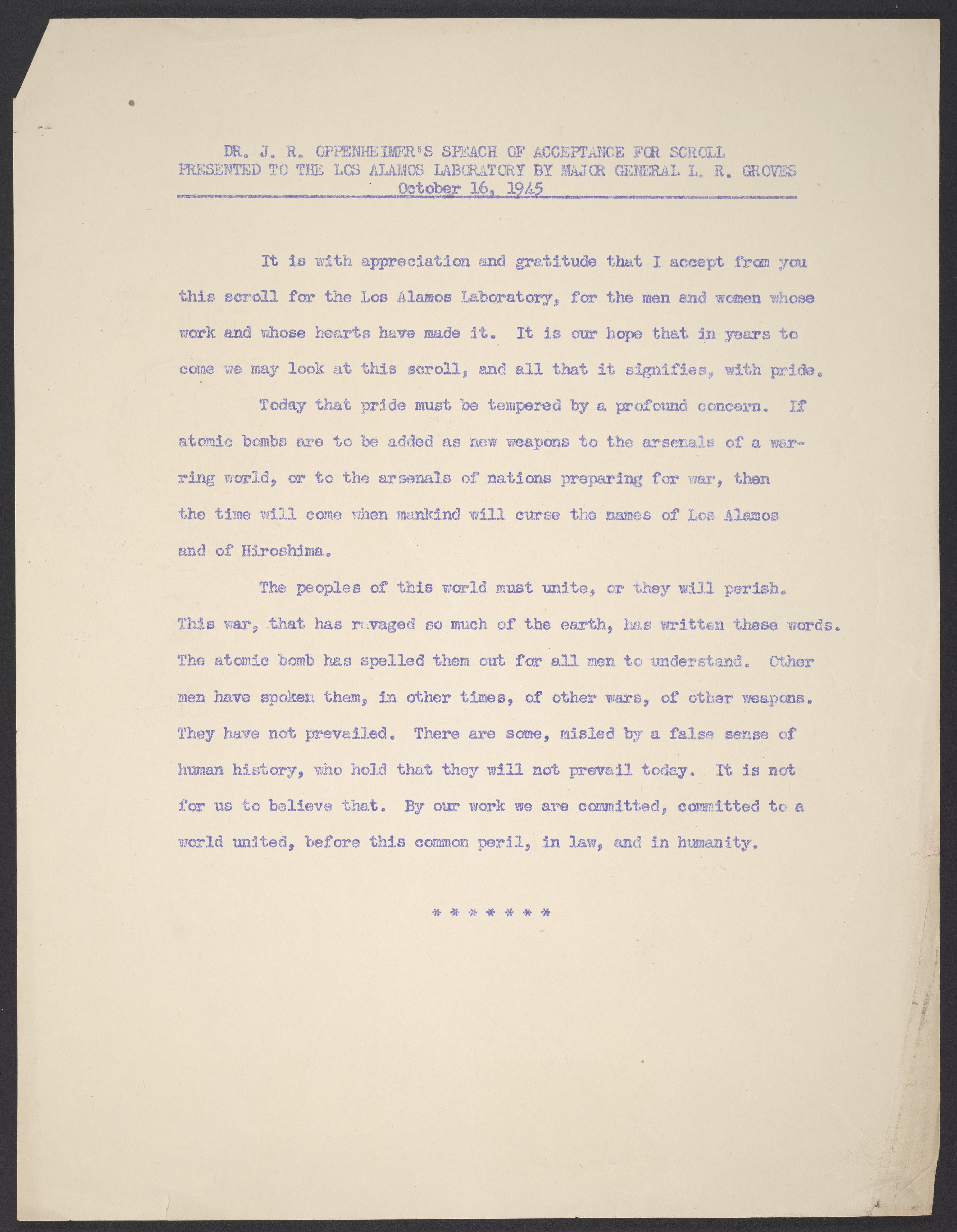 Oppenheimer, J. Robert. “Dr. J. R.Oppenheimer's Speech of Acceptance for Scroll Presented to the Los Alamos National Laboratory by Major General L. R. Groves, October 16, 1945,” October 16, 1945. Richard W. Dodson Papers, Box 5, Folder 11. Science History Institute. Philadelphia. https://digital.sciencehistory.org/works/pzxy817.