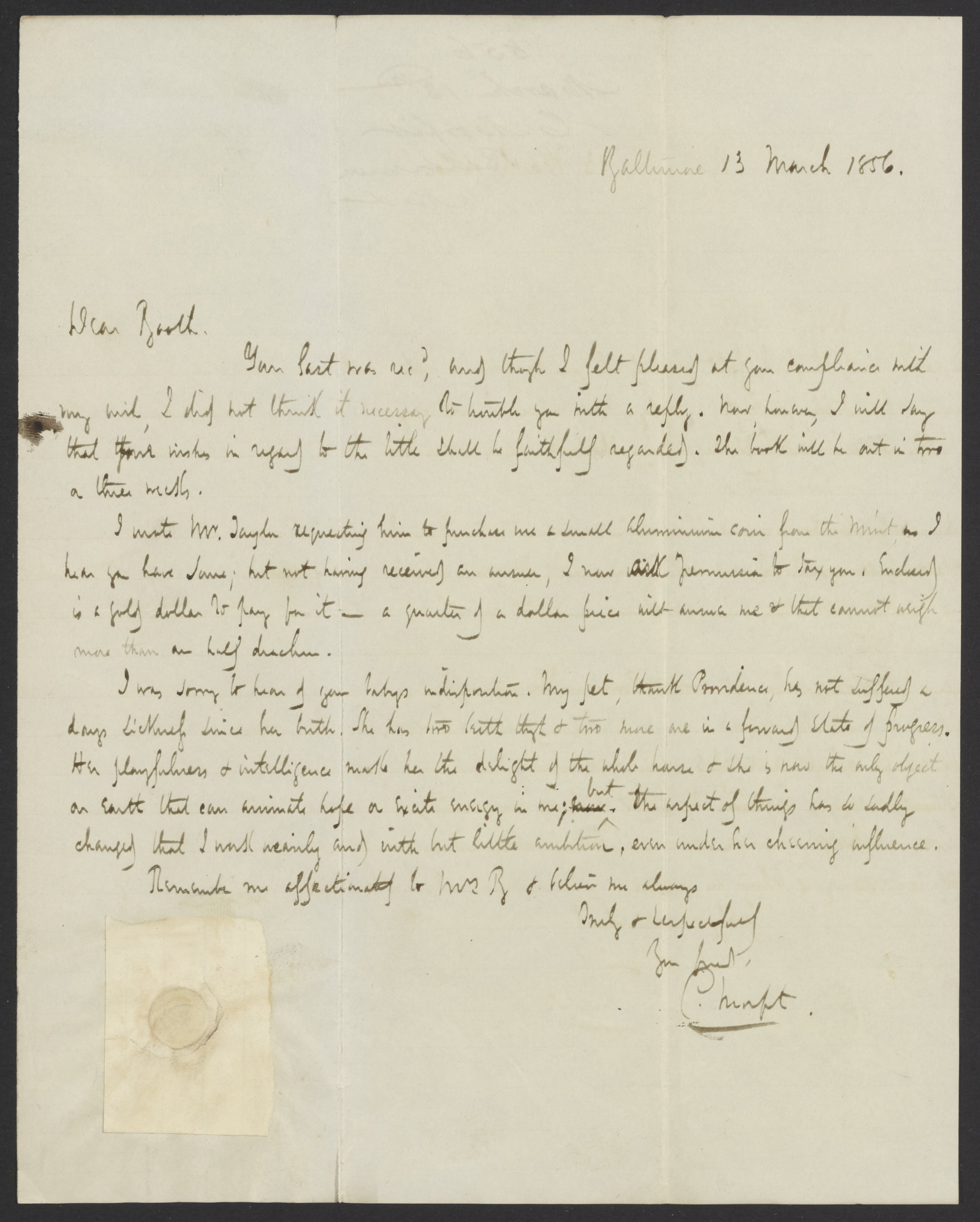 Morfit, Campbell. “Letter from Campbell Morfit to James Curtis Booth, March 13, 1856,” March 13, 1856. Papers of James Curtis Booth, Box 1, Folder 10. Science History Institute. Philadelphia. https://digital.sciencehistory.org/works/q0bxgb8.