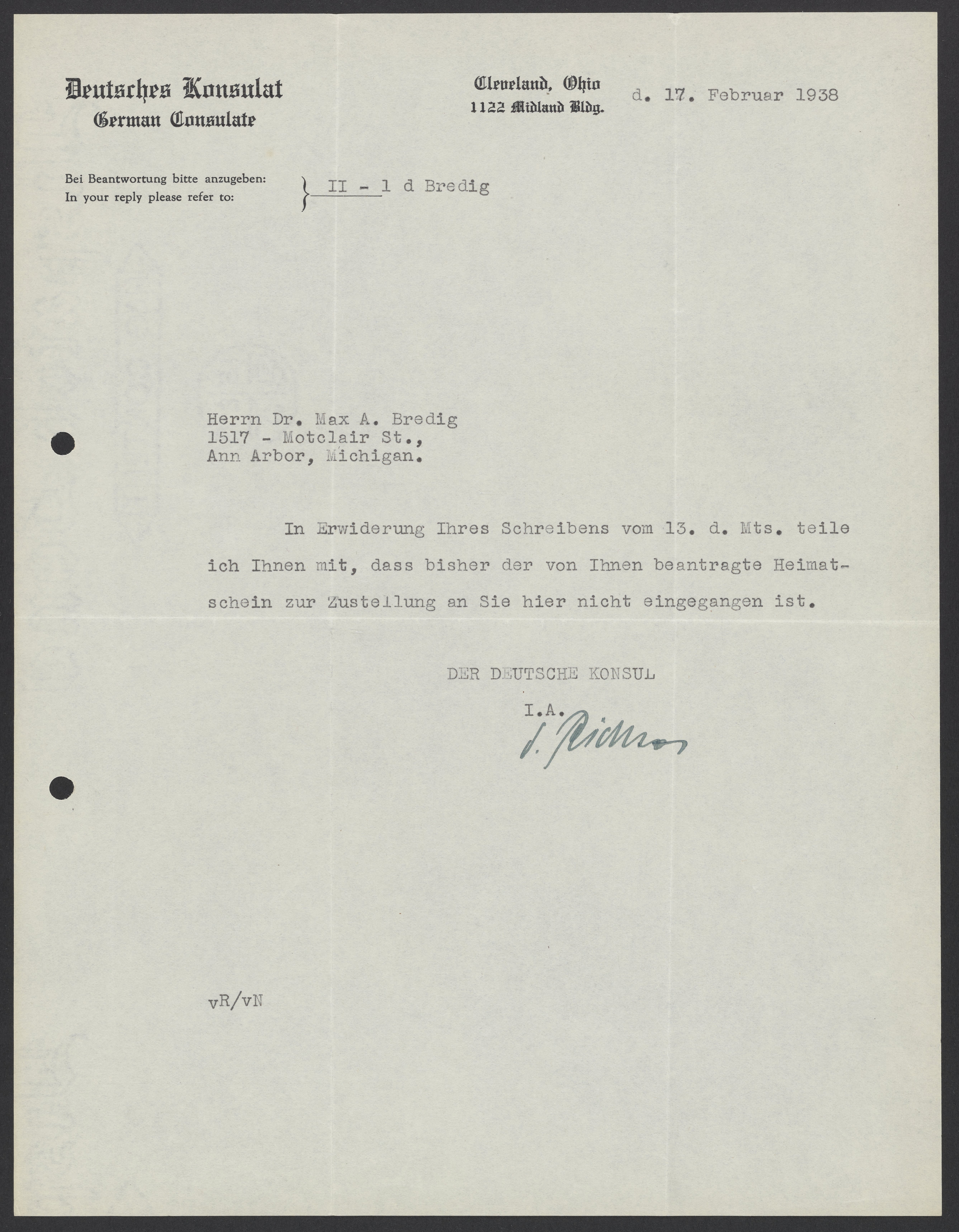 Diplomatic. “Letter from the German Consul to Max Bredig, February 17, 1938,” February 17, 1938. Papers of Georg and Max Bredig, Box 7, Folder 37. Science History Institute. Philadelphia. https://digital.sciencehistory.org/works/q0dja60.