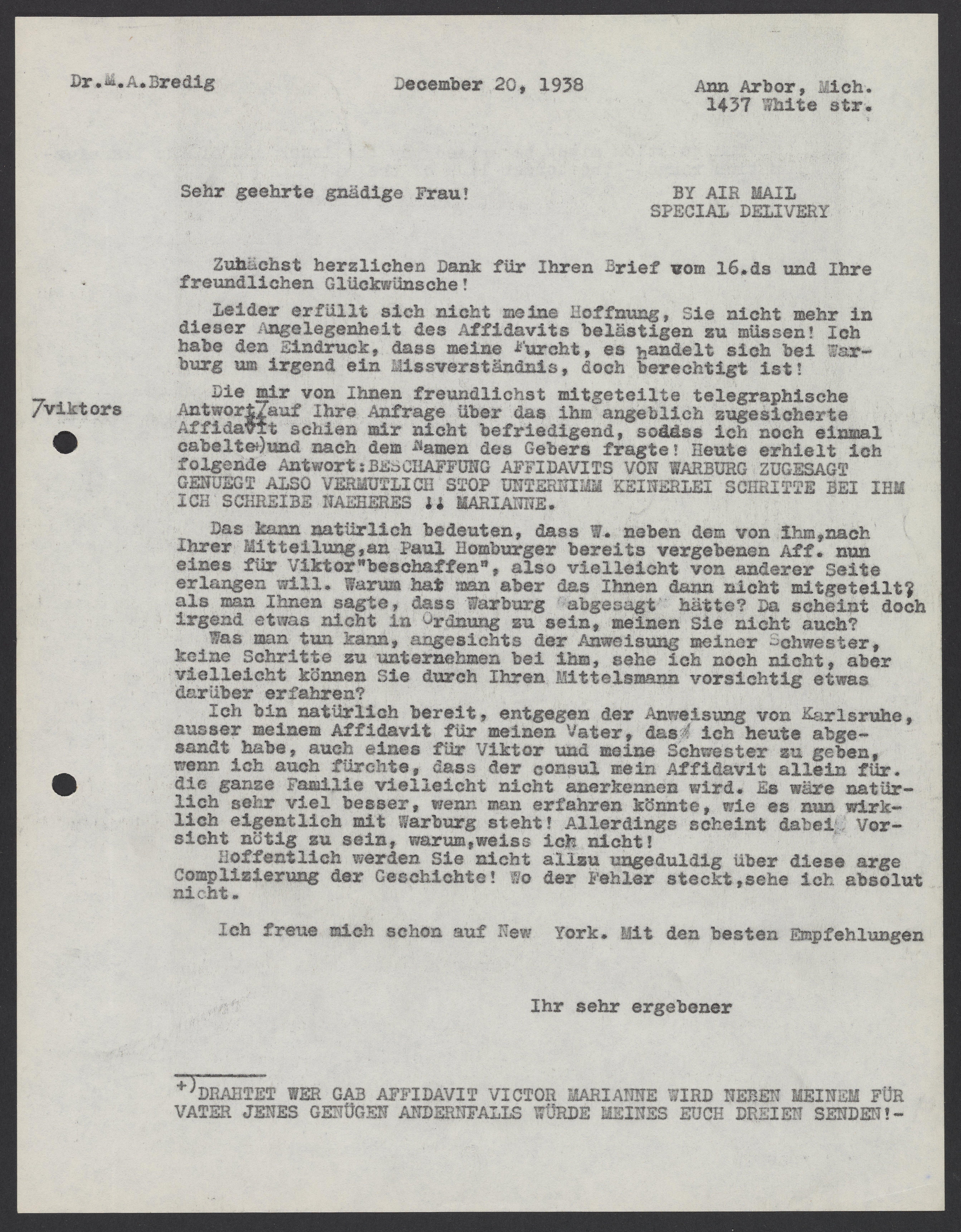 Die mir von Ihnen freundlichst mitgeteilte telegraphische Antwort Viktors auf Ihre Anfrage über das ihm angeblich zugesicherte Affidavit schien mir nicht befriedigend, sodass ich noch einmal cabelte, und nach dem Namen des Gebers fragte! Heute erhielt ich folgende Antwort: BESCHAFFUNG AFFIDAVITS VON WARBURG ZUGESAGT GNEUEGT ALSO VERMUTLICH STOP UNTERNIMM KEINERLEI SCHRITTE BEI IHM ICH SCHREIBE NAEHERES!! MARIANNE