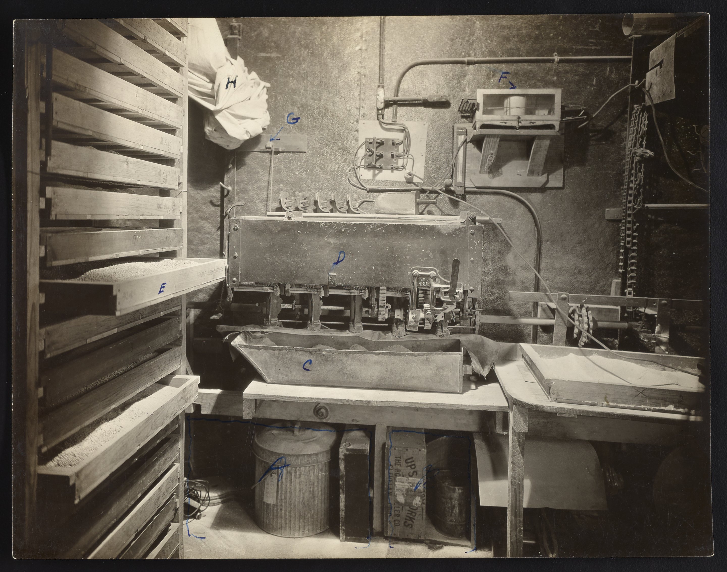 General view of assorted equipment and apparatus in the Constant Humidity Room at the the U.S. Department of Agriculture's Fertilizer Machinery Laboratory located at the Arlington Experimental Farm in Rosslyn [Arlington], Virginia. Various pieces of equipment have been labelled with letters to create an identification key. Per the key, the equipment is identified as follows: C) Receiving tray; D) Fertilizer distributor; E) Fertilizer drawer; F) Hygrothermograph; G) Revolution or speed counter; H) Dust curtain.