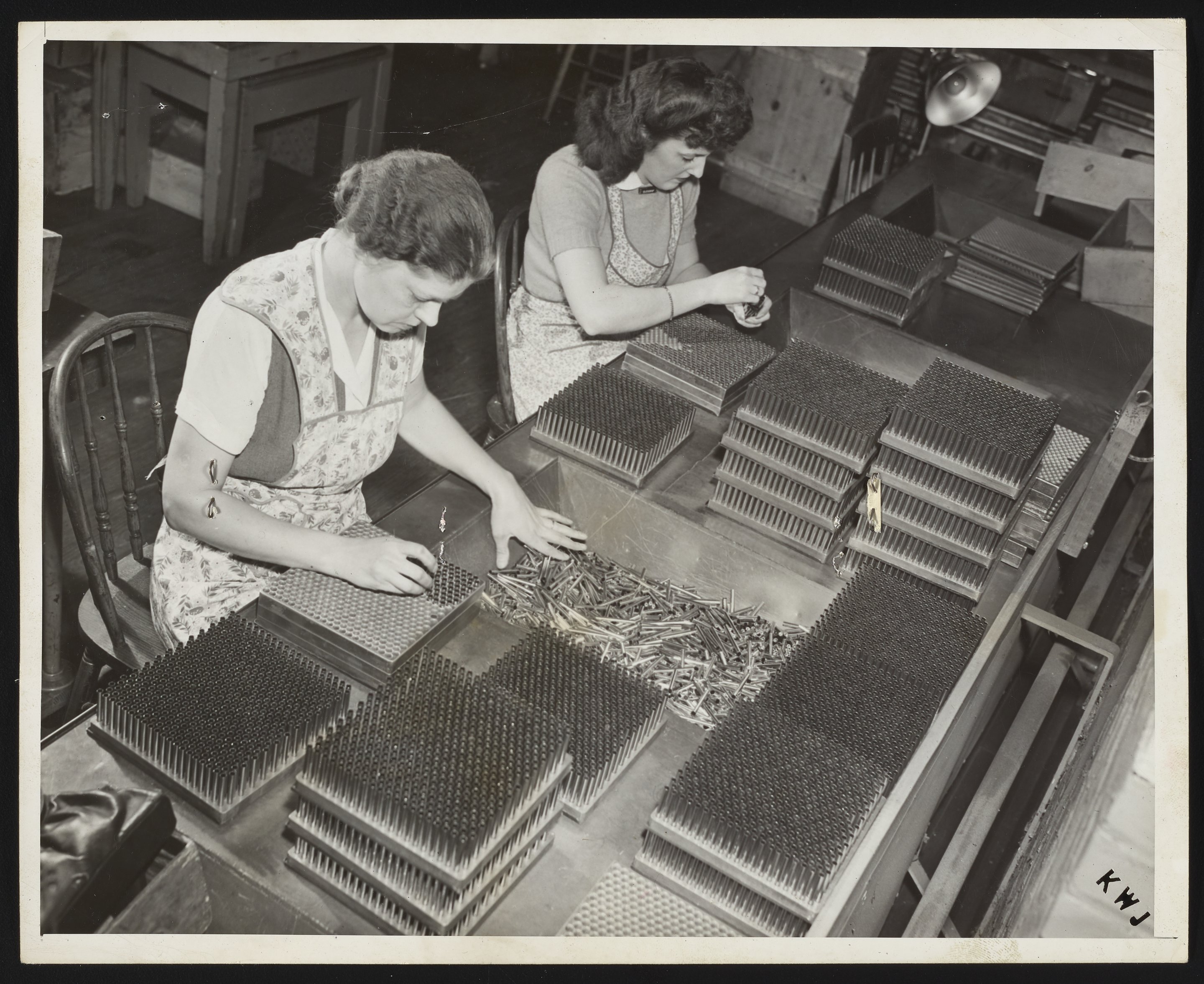 General view of Clara Kellerman and another unidentified employee inspecting electric blasting cap shells at the Hercules Powder Company plant in Port Ewen, New York. Formed in 1912 as part of an anti-trust settlement with DuPont, the Hercules Powder Company (later Hercules Inc.) specialized in the manufacture of explosives and smokeless powders. During World War II, the company's Port Ewen plant produced a range of special detonators designed for military use.