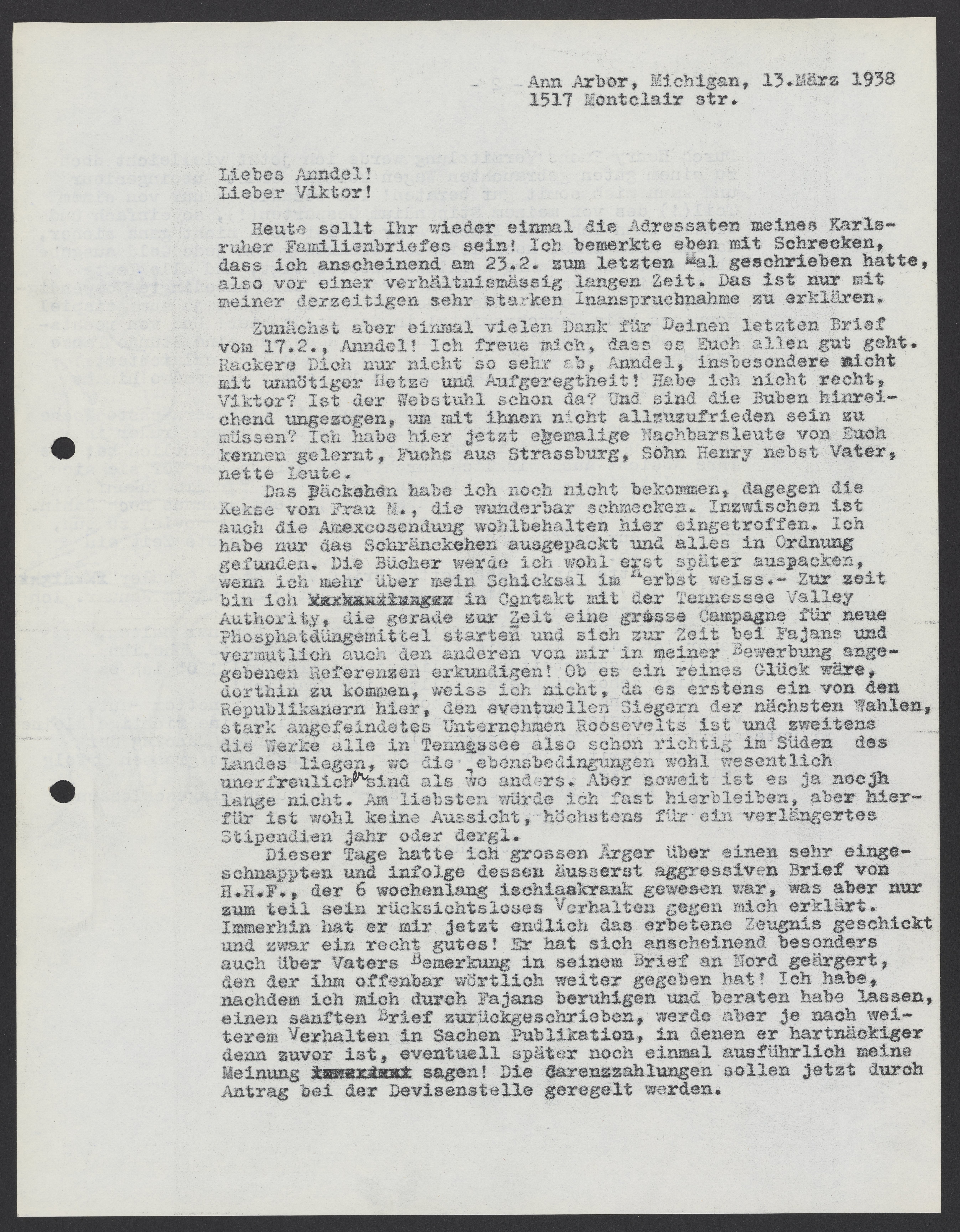 I have not yet received the package, but I did receive the cookies from Mrs. M., which taste wonderful. In the meantime, the Amexco shipment arrived here safely. I just unpacked the cupboard and found everything in order. I will probably not unpack the books until later, when I know more about my plans for the fall. I am currently in touch with the Tennessee Valley Authority, which is planning a large campaign for new phosphate fertilizers. They are currently talking to Fajans and checking the other references that I provided in my application. I don't know whether I would be lucky enough to work there. On the one hand, Roosevelt is frowned upon by the Republicans here, who will eventually win in the next elections. On the other hand, the factories are all in Tennessee, which is in the deep south of the country. The living conditions there are probably very unpleasant compared to anywhere else. Yet my application isn’t that far along. I would really like to stay here, but there is probably no prospect for this. At most, I could receive an extension to my scholarship for one year.