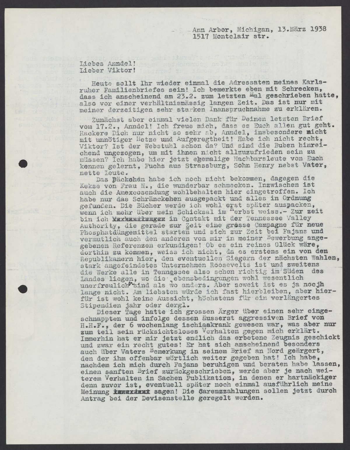 Small JPG1200 x 1541px — 379 KBLarge JPG2880 x 3698px — 2.0 MBFull-sized JPG5389 x 6919px — 6.2 MBOriginal fileTIFF — 5389 x 6919px — 107 MBMax Bredig (1902-1977) updates his family in Germany on his social and professional life at the University of Michigan in Ann Arbor, Michigan in the spring of 1938. He plans to buy a new car and give his first lecture at the university in English.