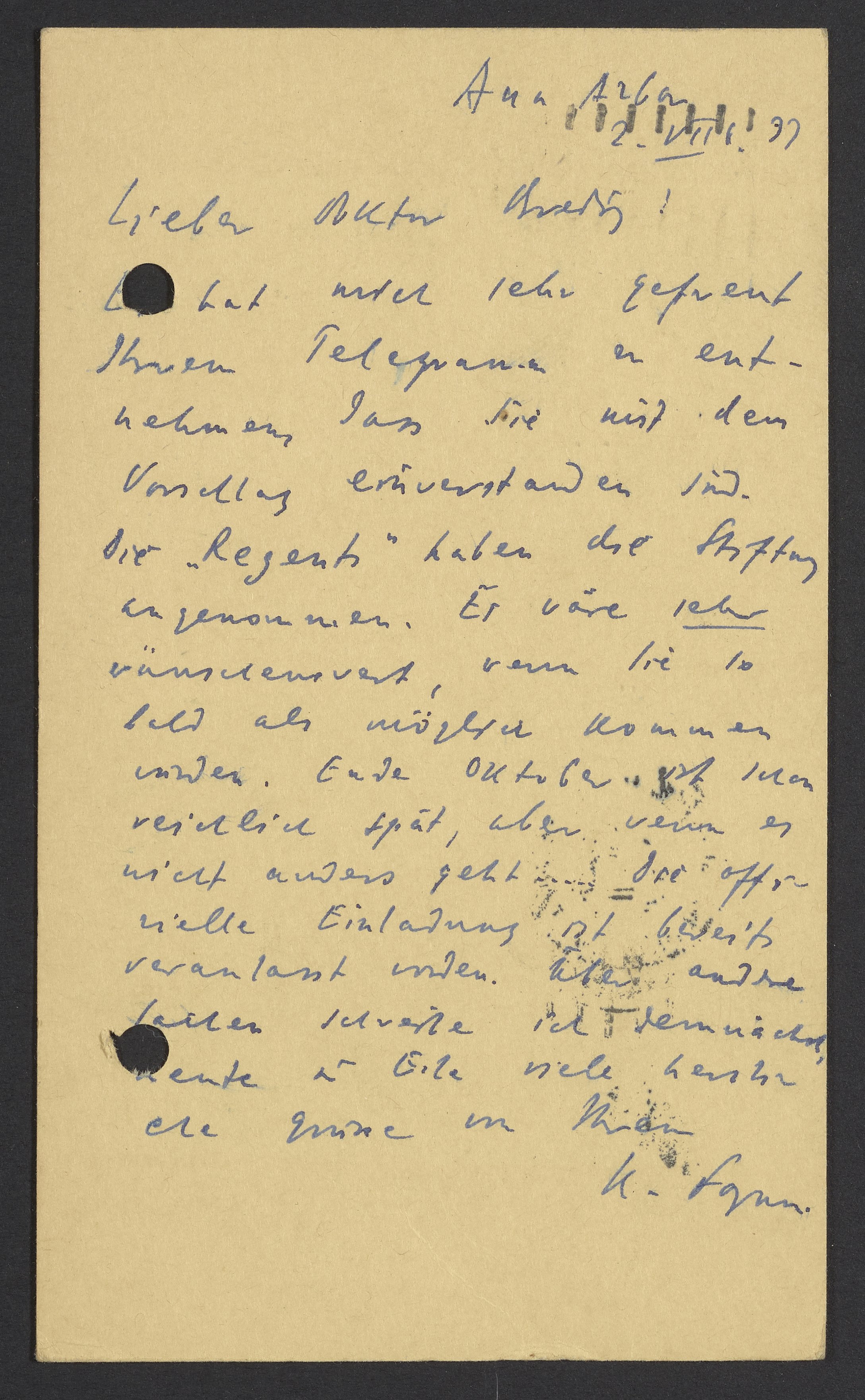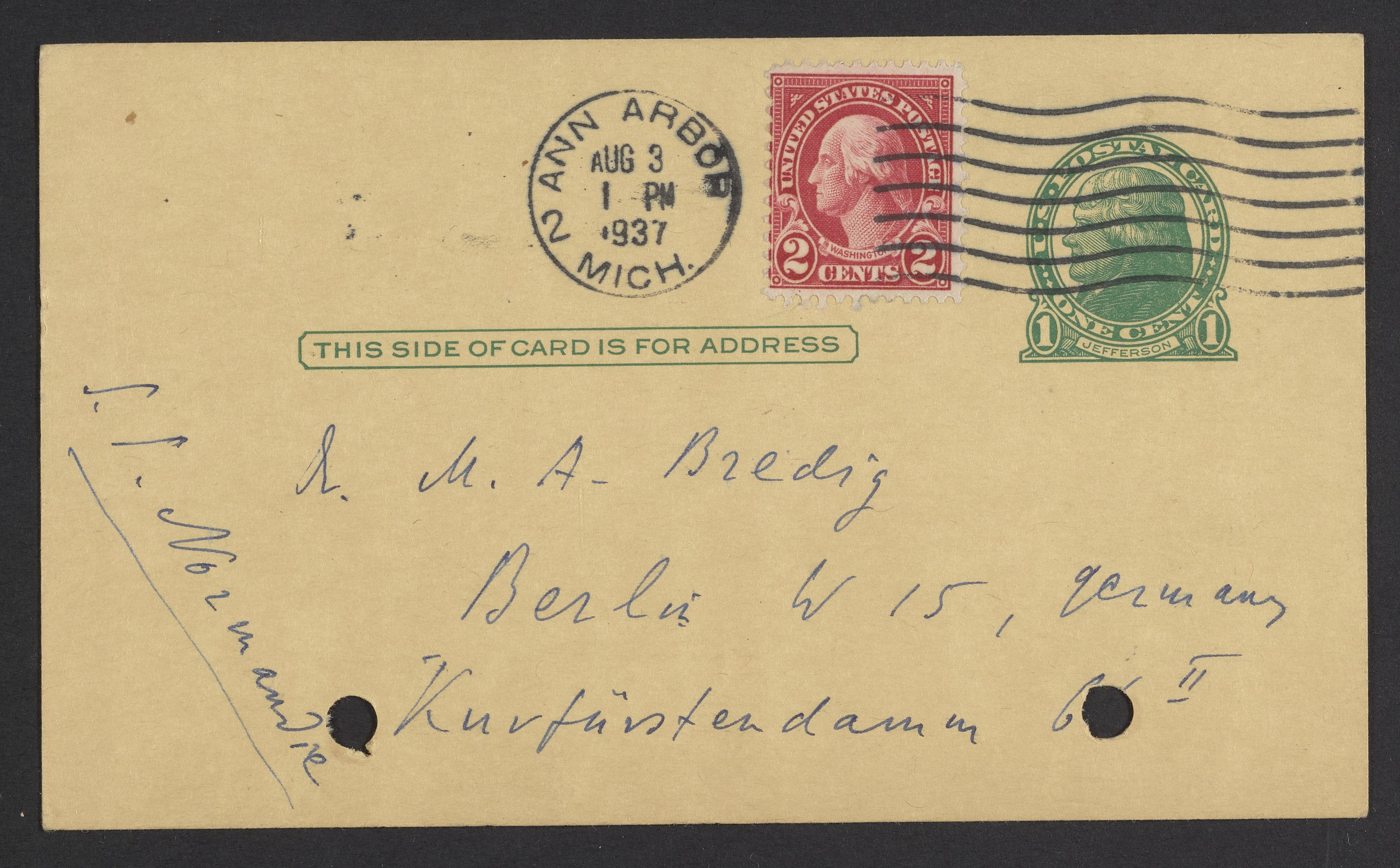 Postcard from Kasimir Fajans to Max Bredig, August 2, 1937
