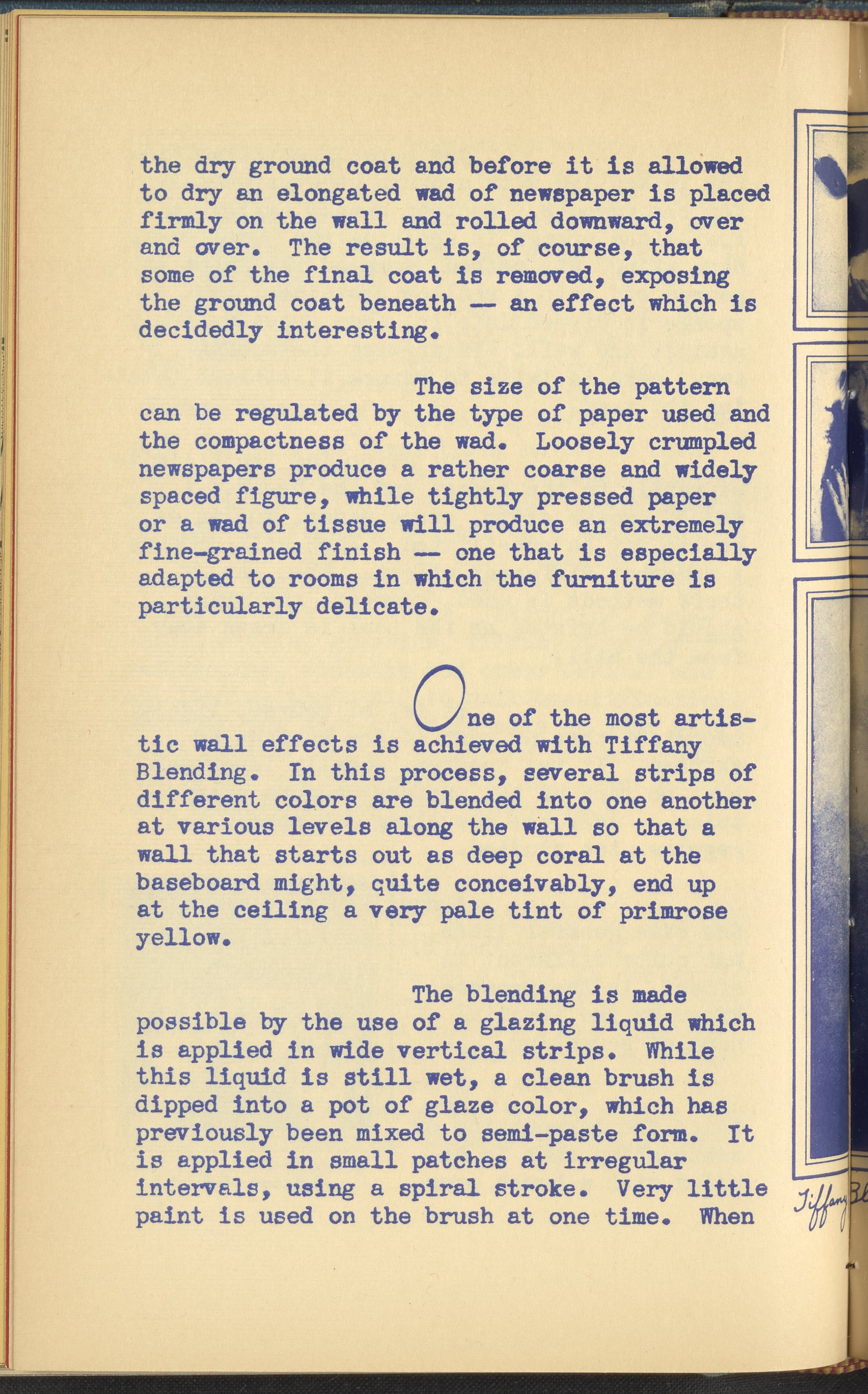 Booklet corresponding to a radio broadcast program created by the National Paint, Varnish, and Lacquer Association. The booklet discusses various methods to decorate one's walls. These methods include stippling, scumbling, murals, plastics, pasterettes, and stenciling. Describes each technique and where it is most effectively employed. Includes small stylized illustrations throughout and decorated covers.