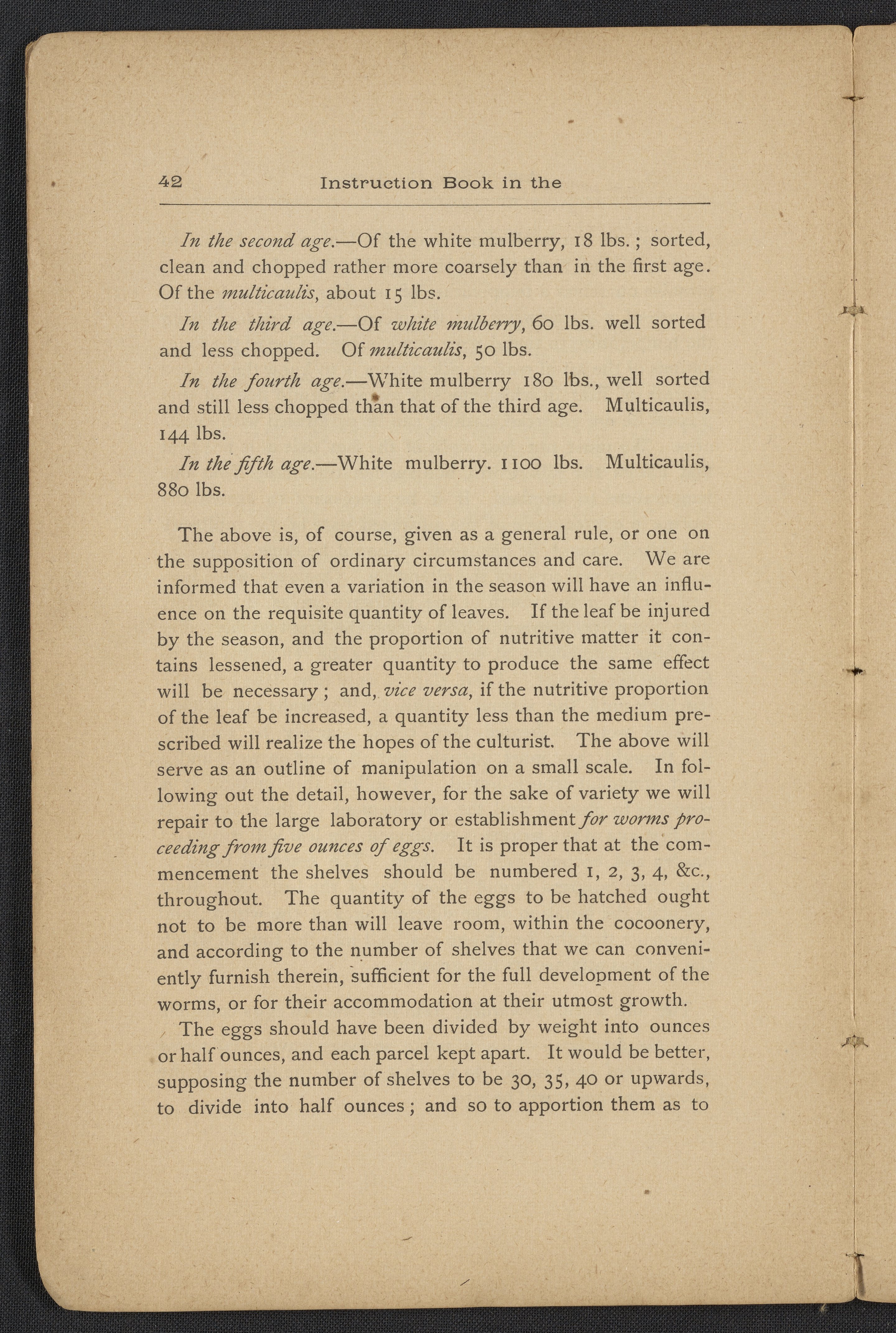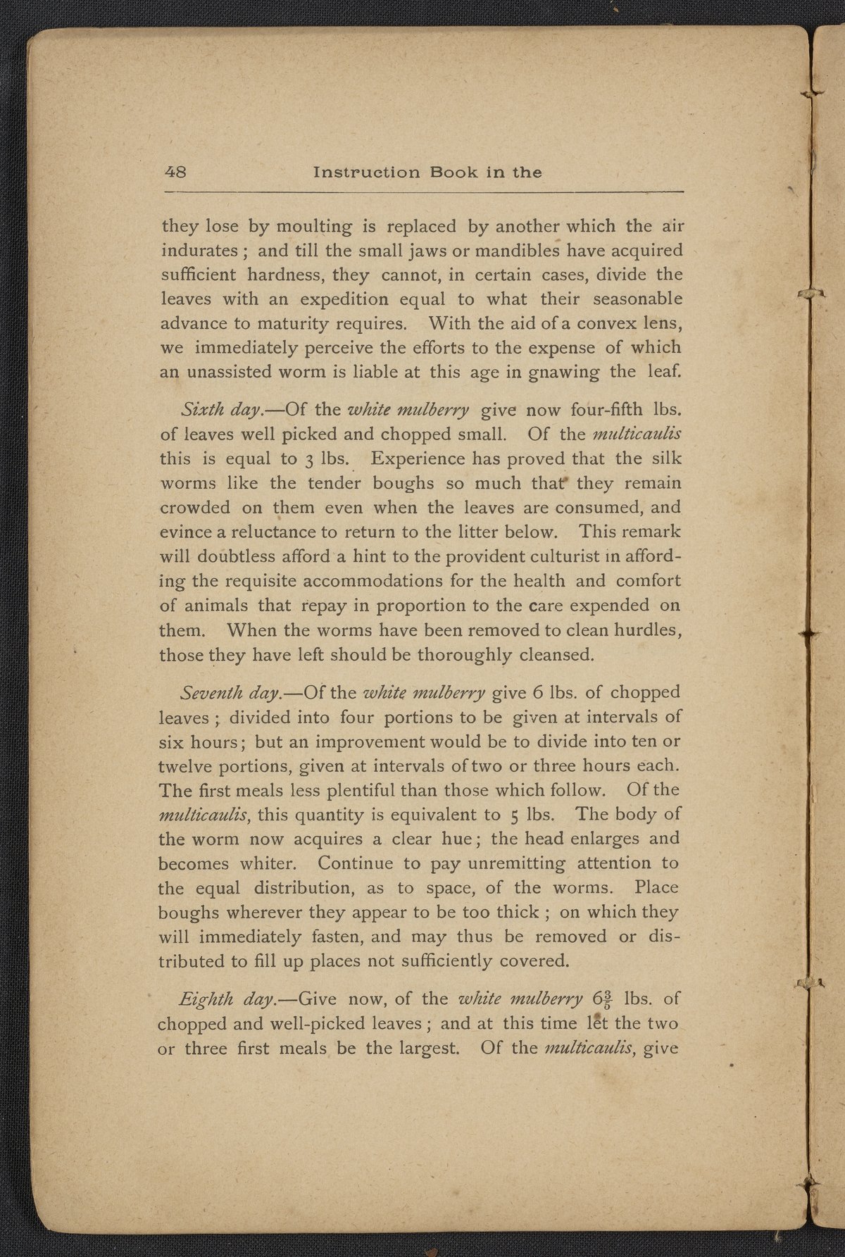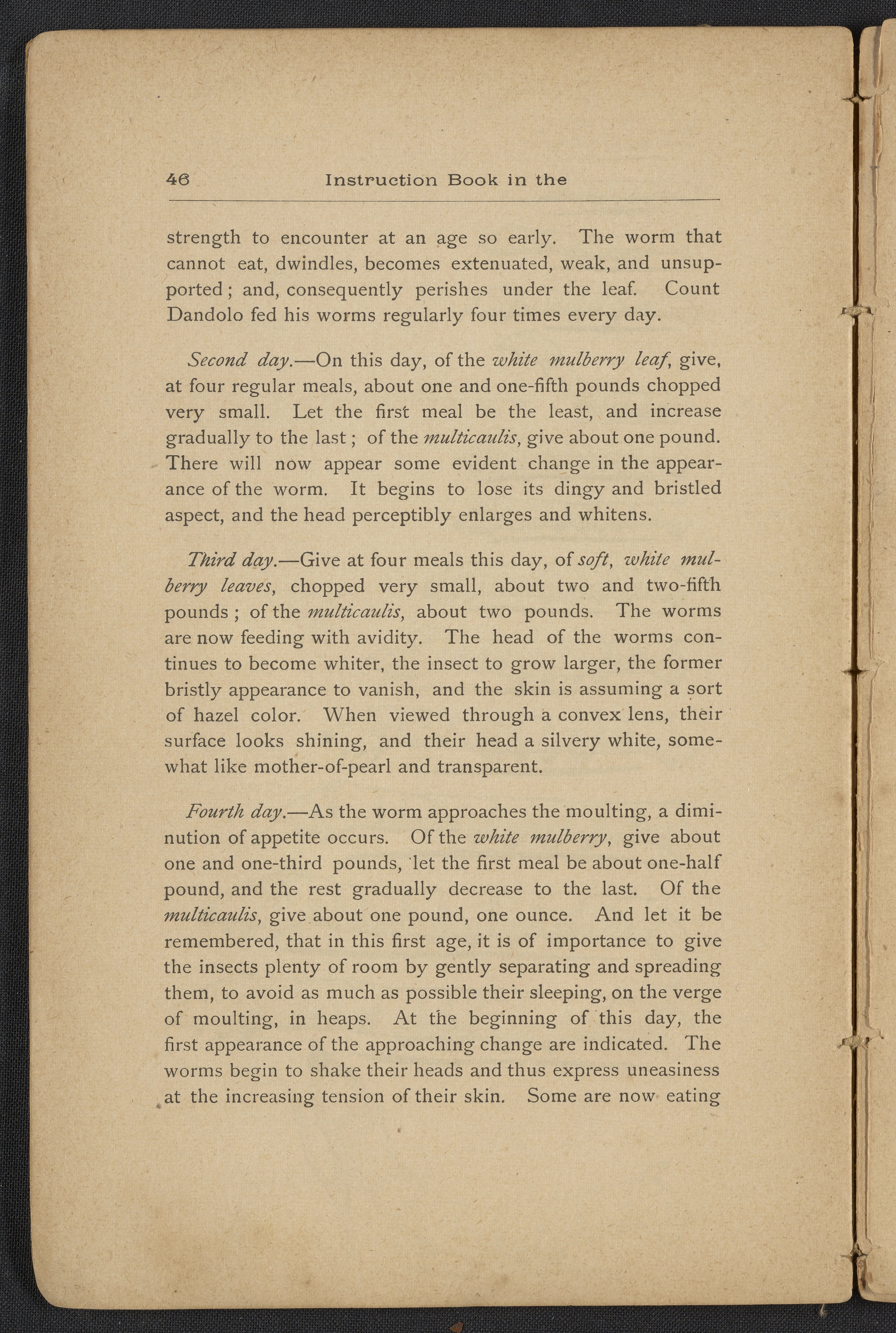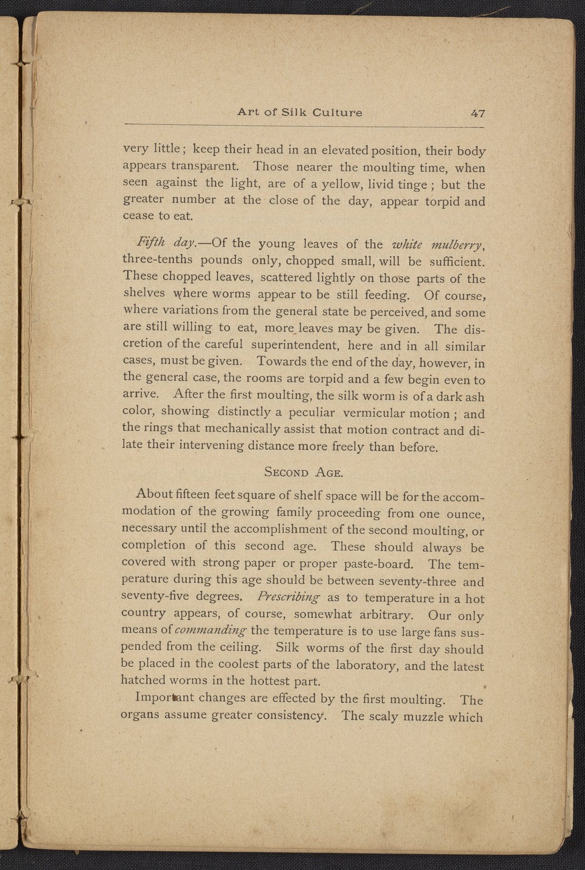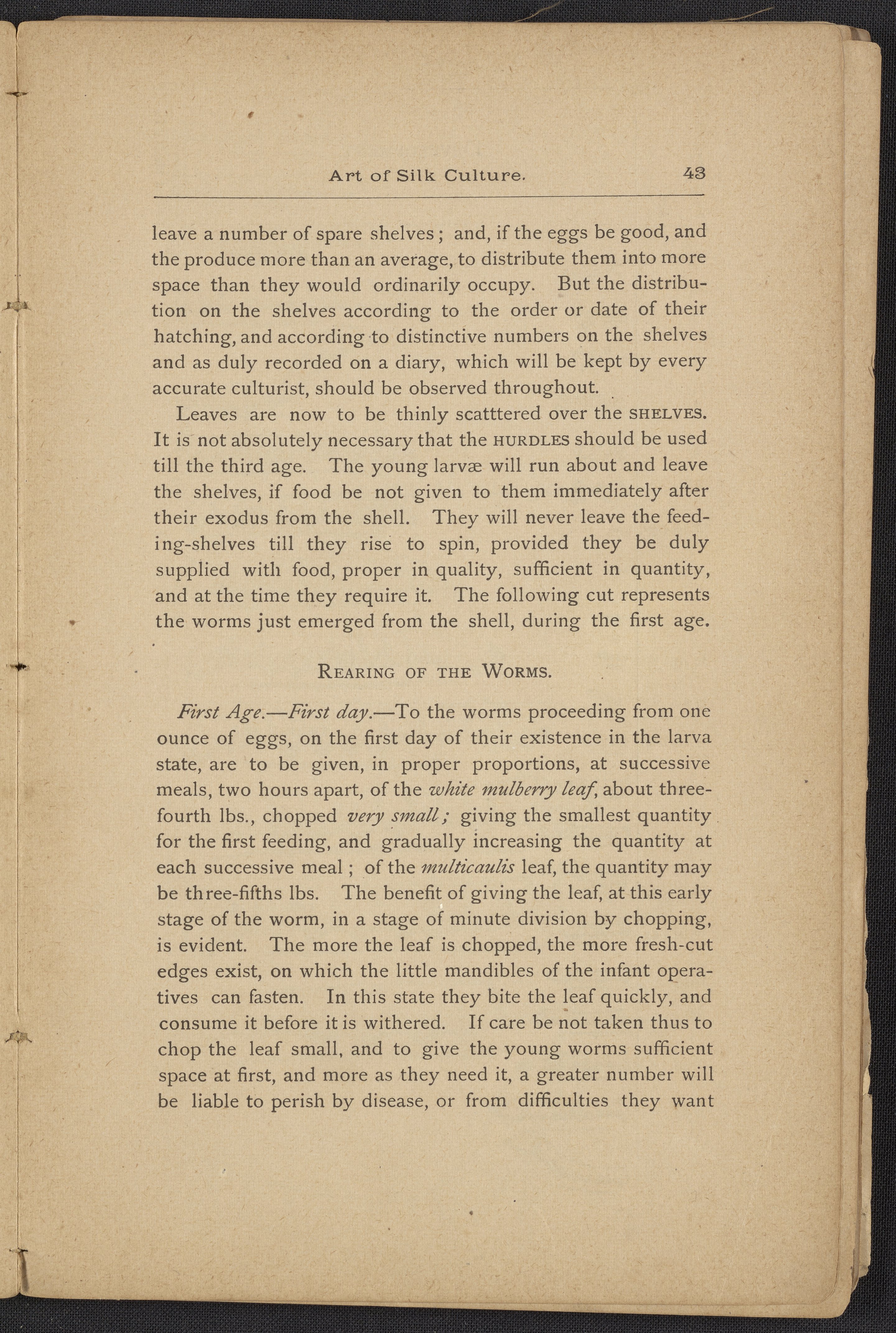 Small JPG1200 x 1795px — 406 KBLarge JPG2880 x 4308px — 2.3 MBFull-sized JPG3806 x 5693px — 3.8 MBOriginal fileTIFF — 3806 x 5693px — 62.0 MBAn instruction book compiled by the Women's Silk Culture Association to encourage the development of an industry in the United States for the culture of raw silk. The book was compiled from various authorities on sericulture, such as Felix Gillet, John Clarke, Prof. H. C. Kerr, and Ira Dinock. The Women's Silk Culture Association was founded in Philadelphia, Pennsylvania in 1880 and partially funded by the United States Department of Agriculture. The U.S. silk industry employed many women and girls. The book includes many illustrations of silk worm cultivation and their life cycles.