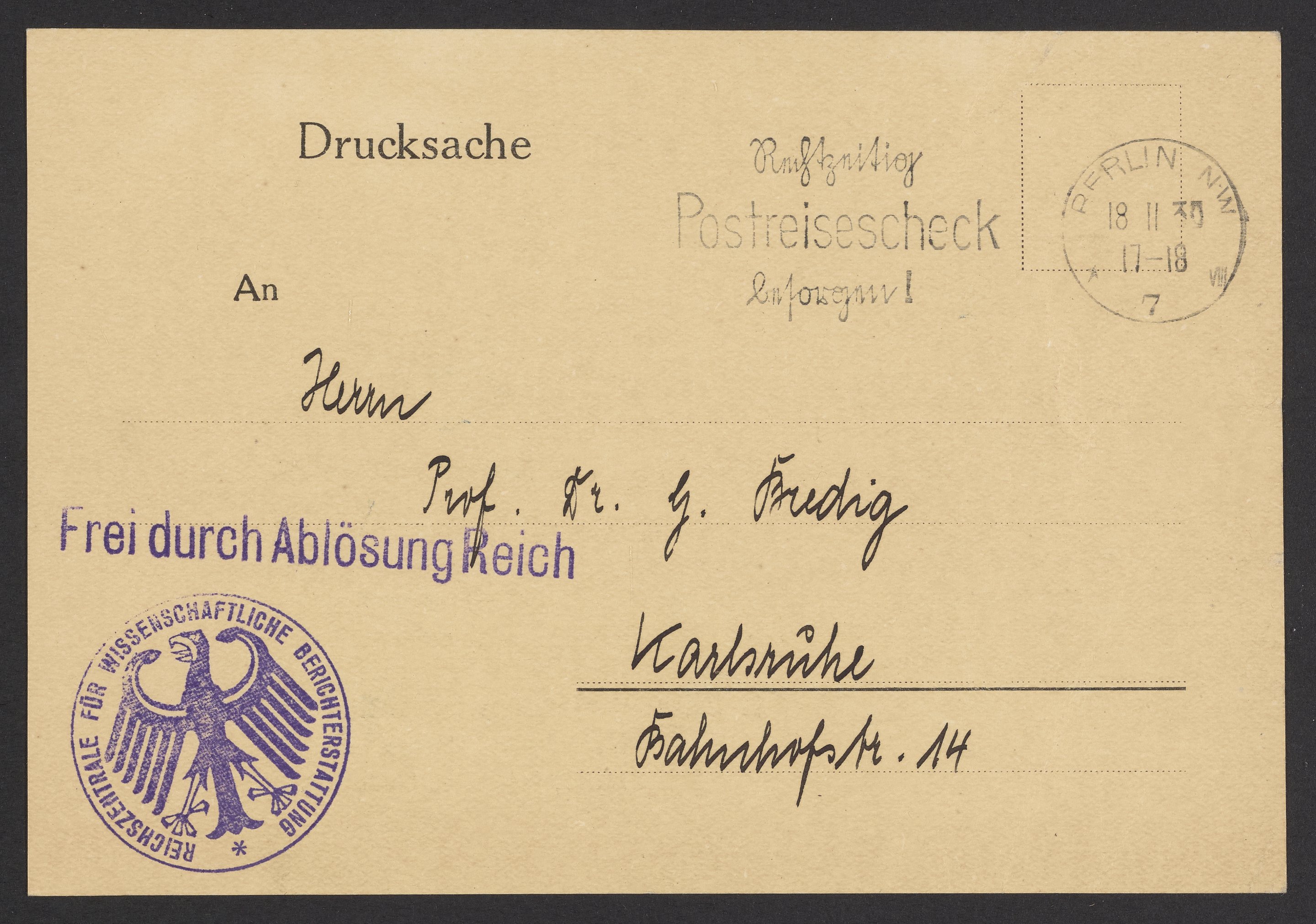 Postcard from the Imperial Center for Scientific Reporting to Georg Bredig, November 1930