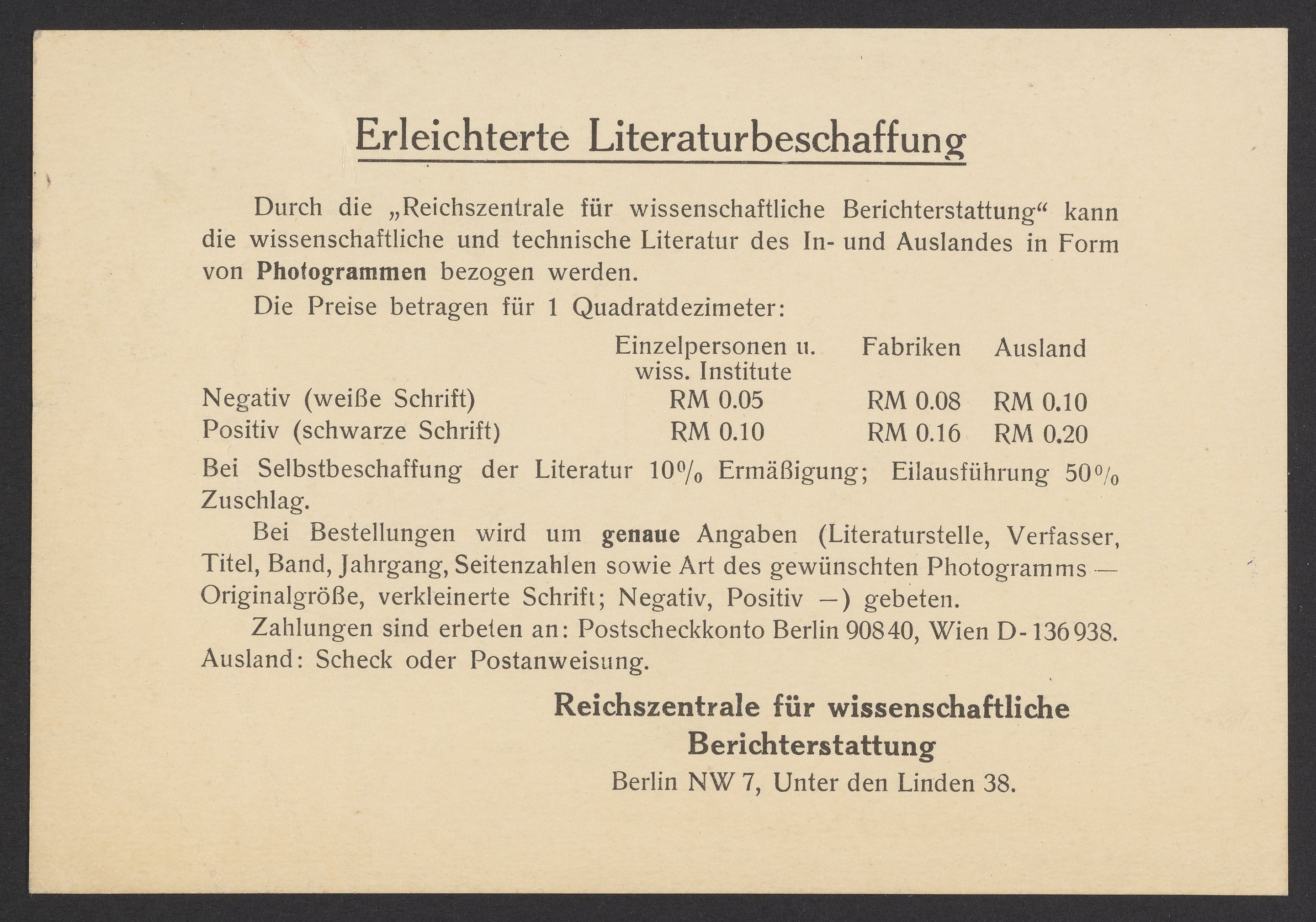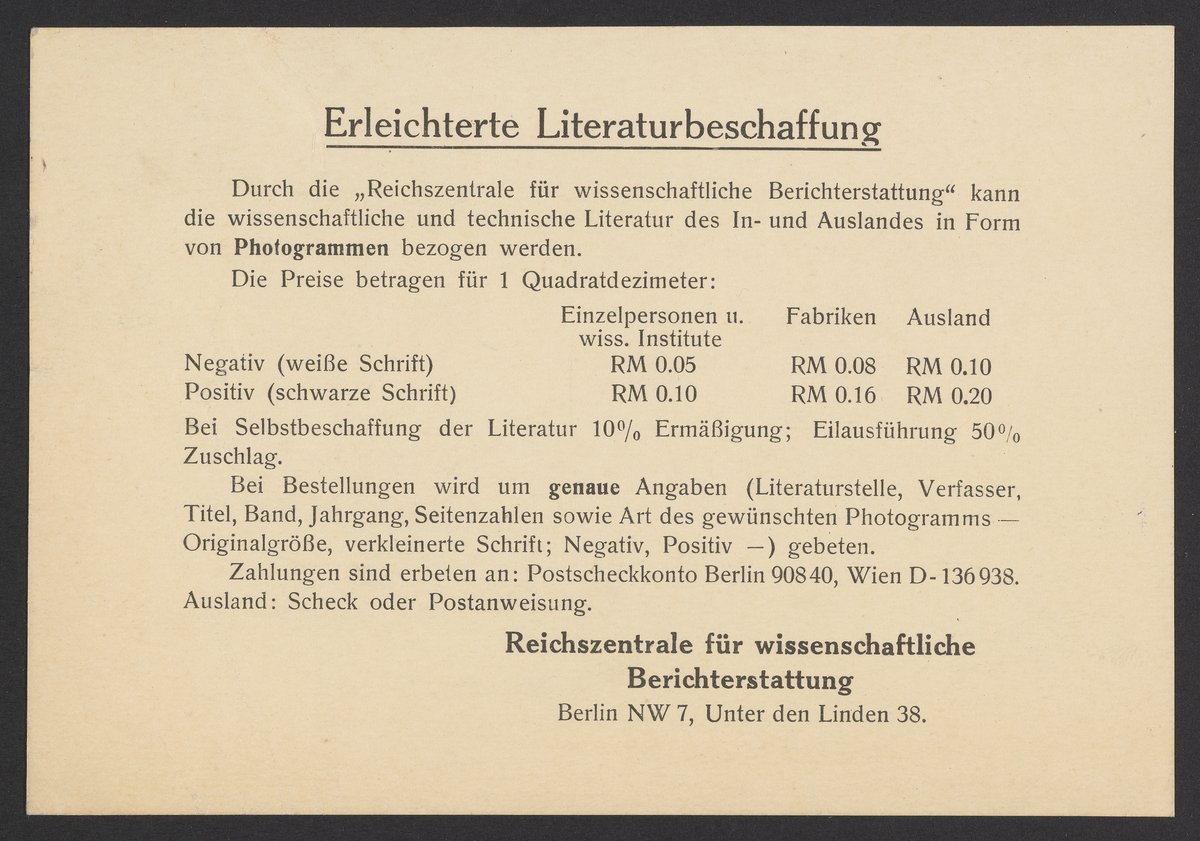 Durch die „Reichzentrale für wissenschaftliche Berichterstattung“ kann die wissenschaftliche und technische Literatur des In-und-Auslandes in Form von Photogrammen bezogen werden.