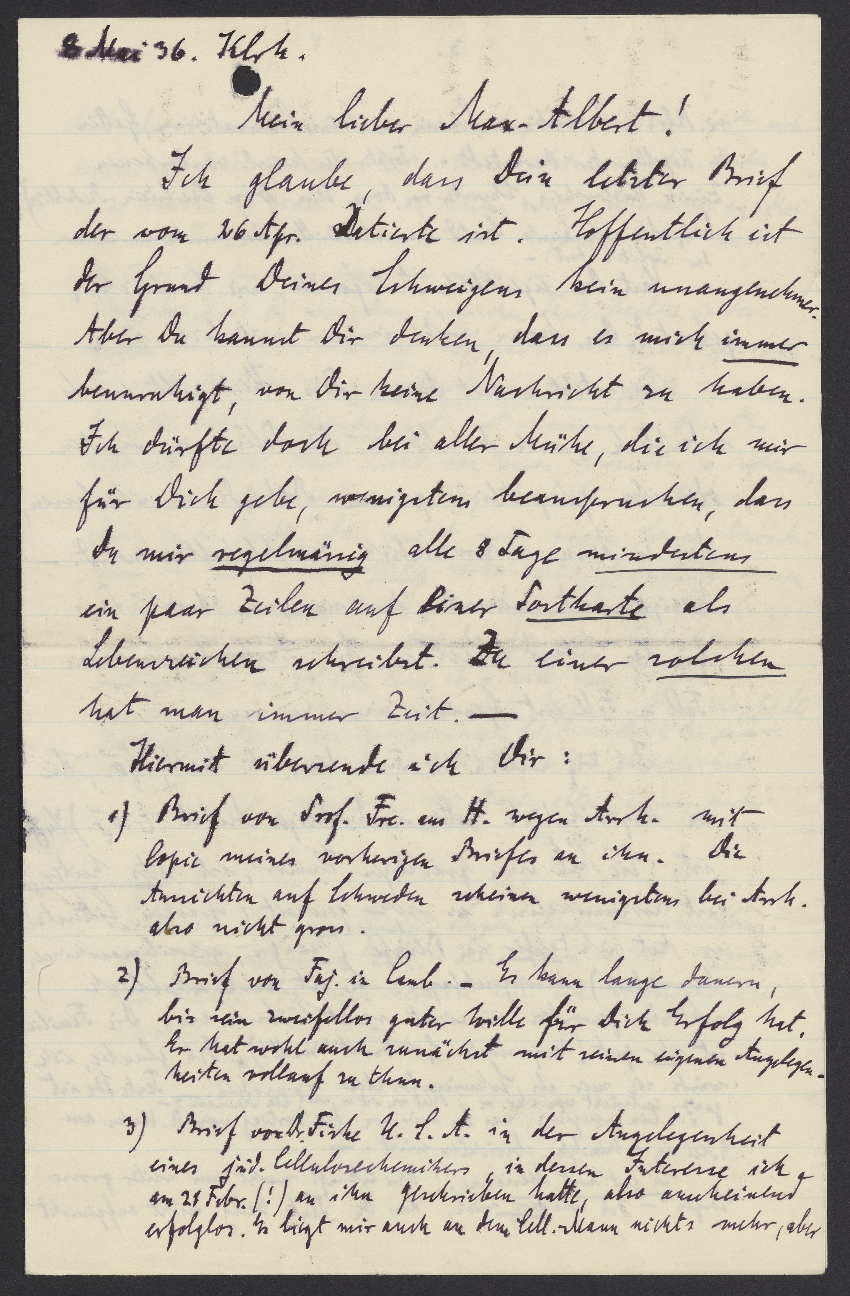 I recently met Maidy Go., at Mrs. Marx's, who is an remarkably nice and efficient girl (30 years old) (3/4 Jew). She has a wonderful sense of humor, is always cheerful, is very musical, and very clever (languages, literature). She has courageously tried out different professions (commercial sector, typing, housekeeping). She has also become considerably slimmer and looks quite pretty. The family is very good (her great-grandfather was Privy Councilor Wendt!). I think I would want her as a daughter-in-law. Aunt Ida is impressed by her. And how about Eta Neumann? I am curious what you will tell me about Kuhn’s lecture on May 9th at the Chemical Society.