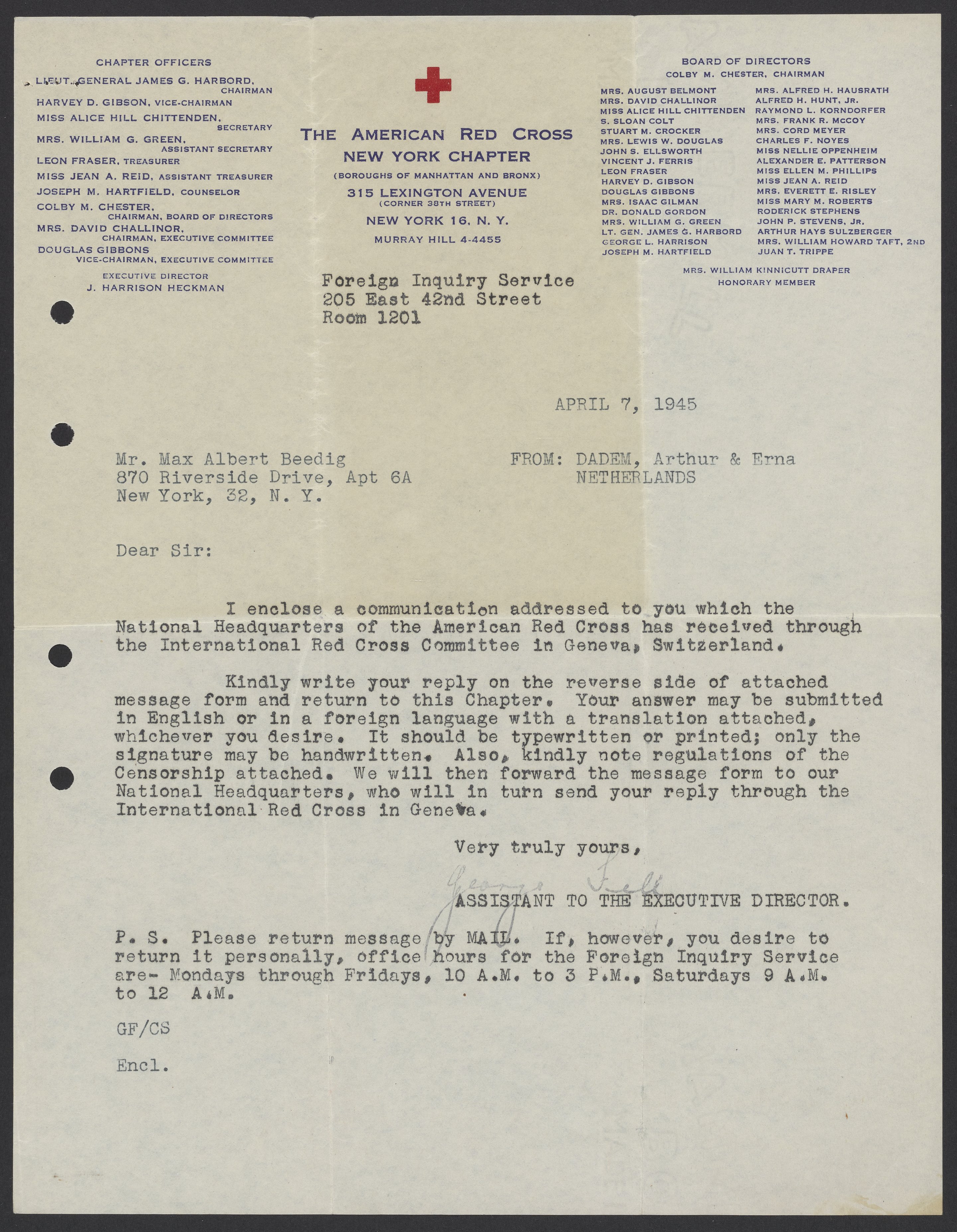 Letters from the American Red Cross to Max Bredig and Liselotte Zadek, 1942-1945
