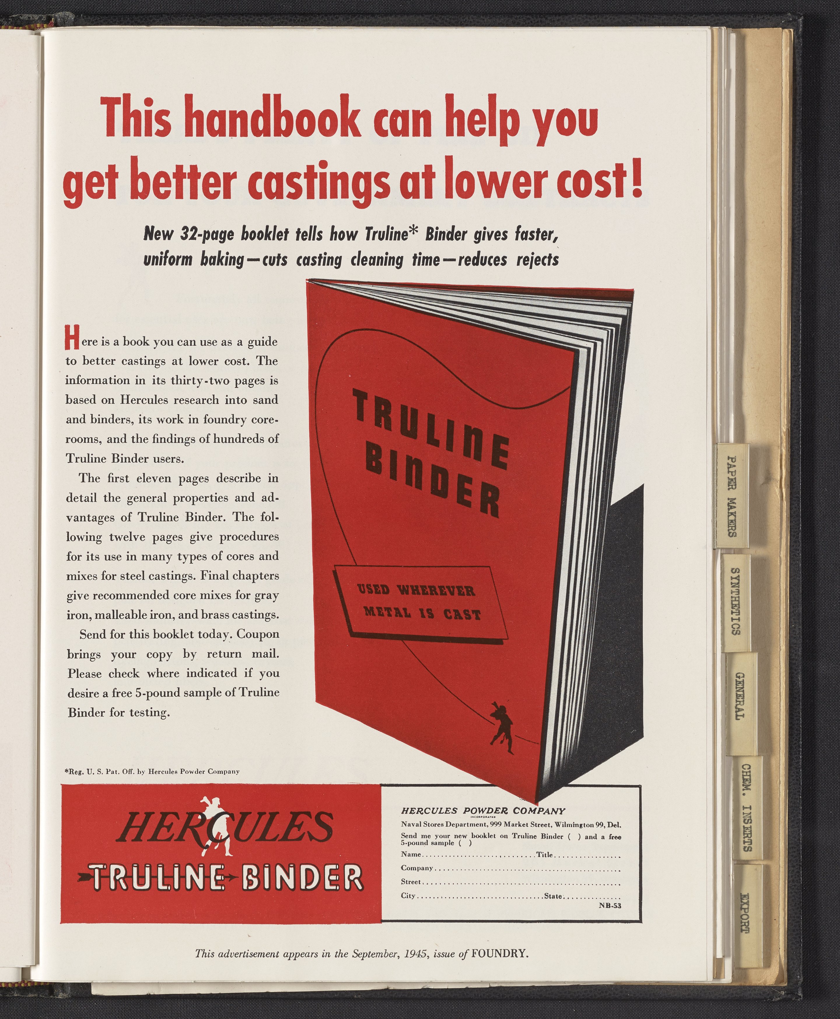 Hercules Incorporated. “This Handbook Can Help You Get Better Castings at Lower Cost!” 1945 Hercules Advertisements, 1945. Records of Hercules Incorporated, Volume 1945. Science History Institute. Philadelphia. https://digital.sciencehistory.org/works/q811kk40x.