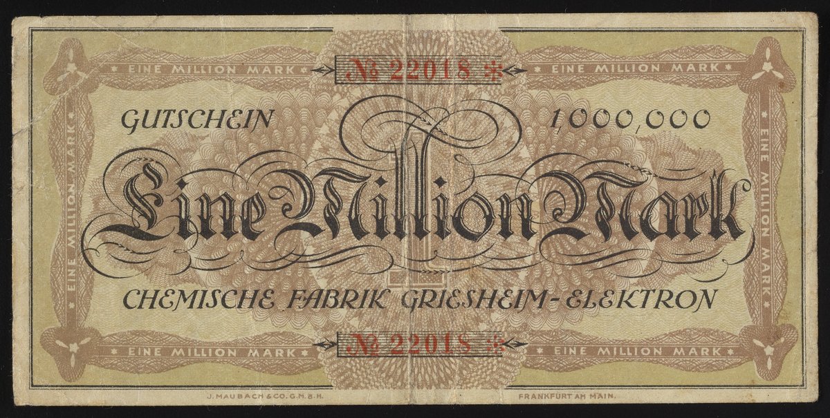 Small JPG1200 x 605px — 219 KBLarge JPG2880 x 1452px — 1.1 MBFull-sized JPG4196 x 2116px — 2.0 MBOriginal fileTIFF — 4196 x 2116px — 25.4 MBThis Eine Million Mark Gutschein, or one million Mark voucher, was issued by Chemische Fabrik Griesheim-Elektron. Styled after a banknote, the verso of this company scrip includes the company logo and terms of the scrip. Paper features a watermark design.