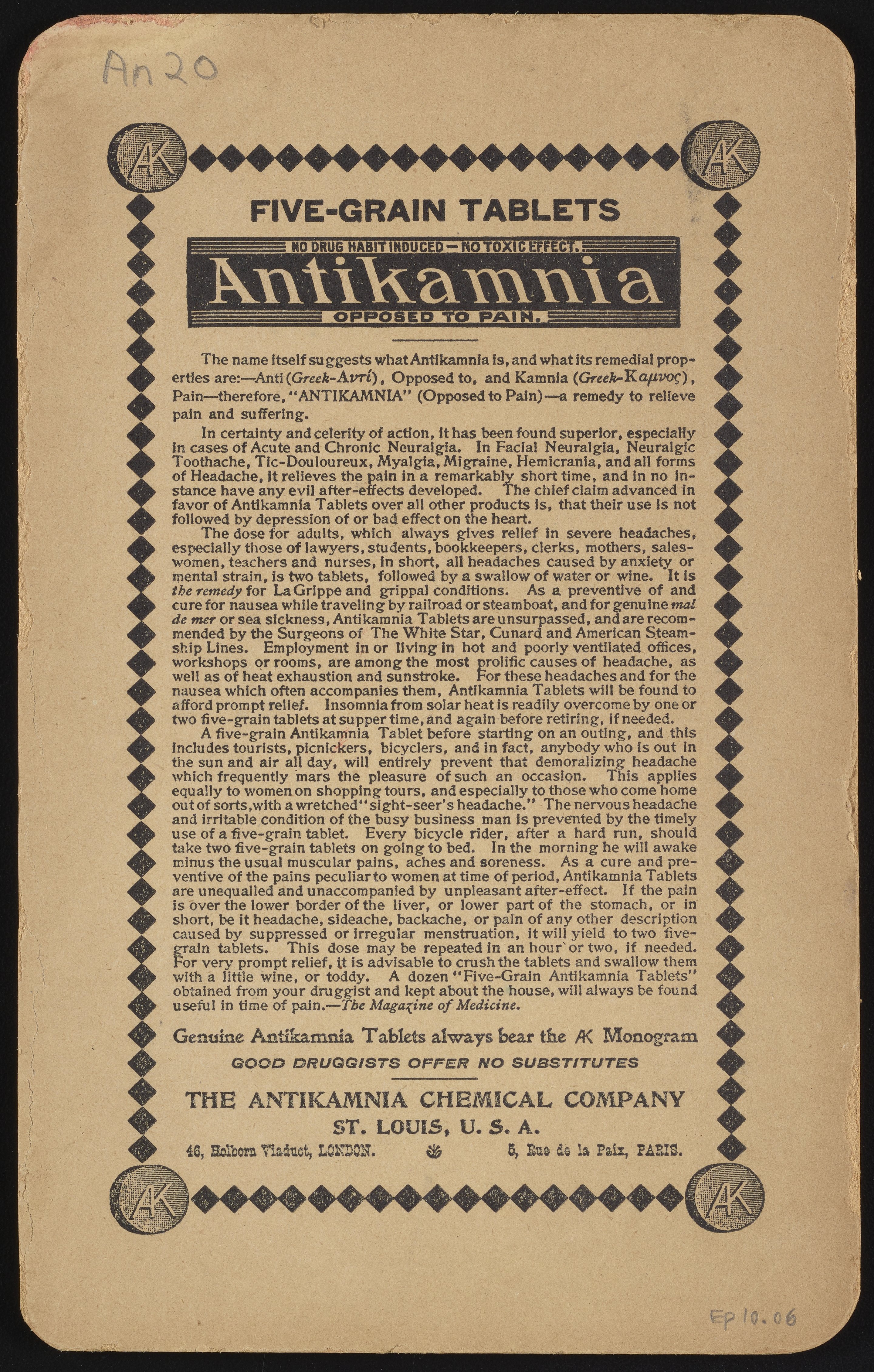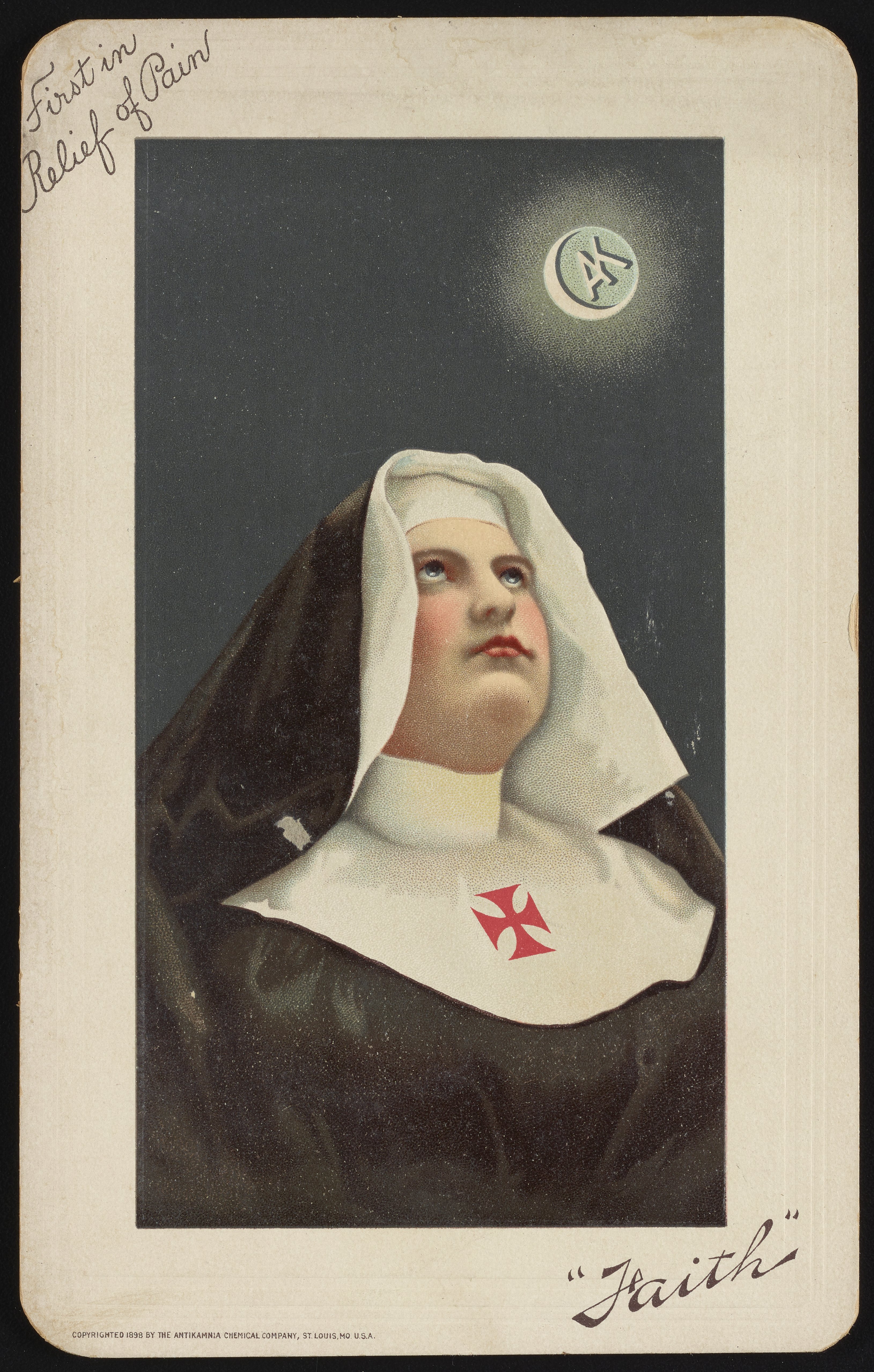 Trade Card for the Antikamnia Chemical Company's pain relief product with nun