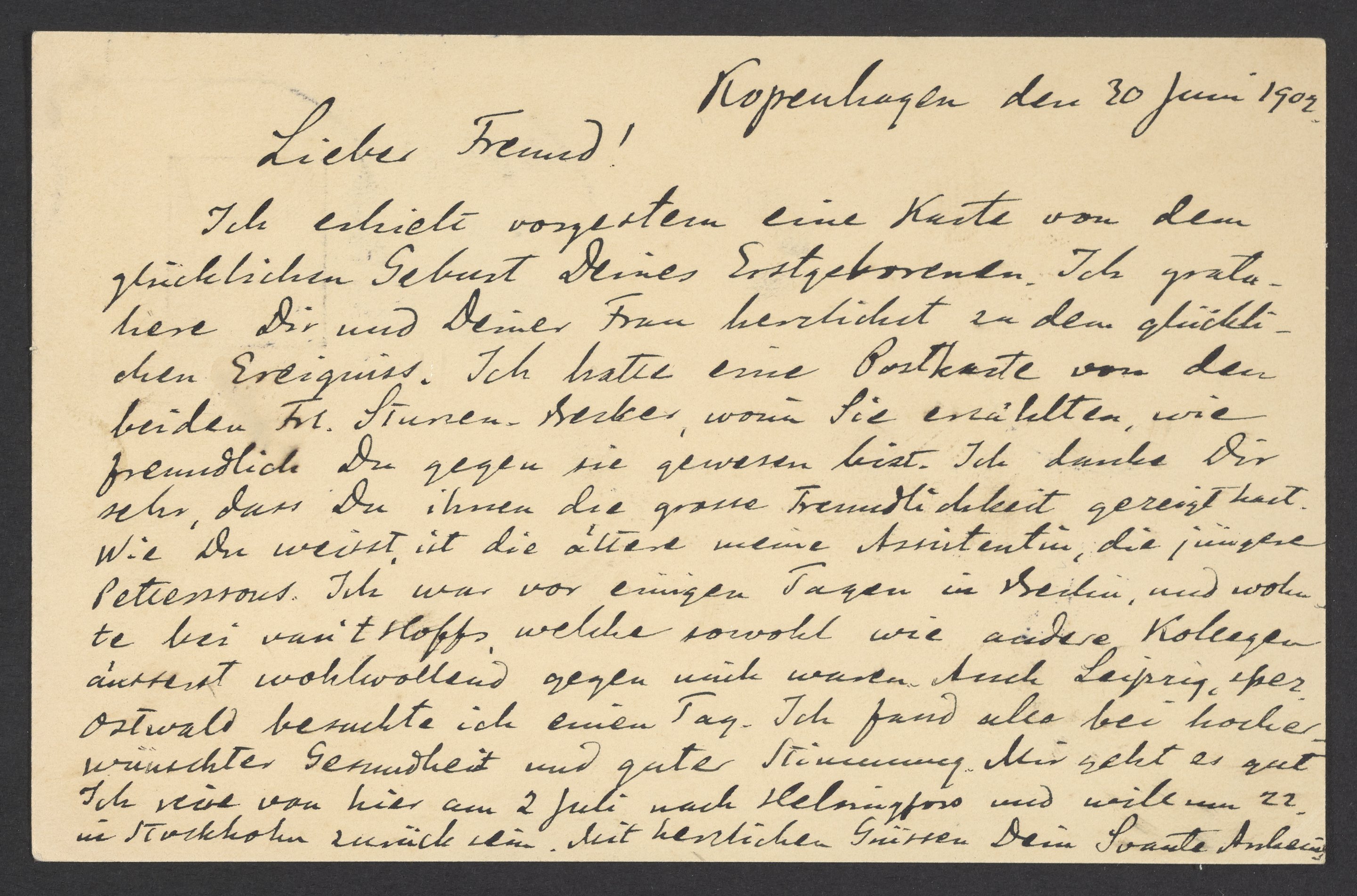 Ich erhielt vorgestern eine Karte von dem glücklichen Geburt Deines Erstgeborenen. Ich gratuliere Dir und Deiner Frau herzlichst zu dem glücklichen Ereigniss. Ich hatte eine Postkarte von den beiden Frl. Sturzen-Becker, worin sie erzählten, wie freundlich Du gegen sie gewesen bist. Ich danke Dir sehr, dass Du ihnen die grosse Freundlichkeit gezeigt hast. Wie Du weisst, ist die ältere meine Assistentin, die jüngere Petterssons. Ich war vor einigen Tagen in Berlin und wohnte bei van’t Hoffs, welche sowohl wie andere Kollegen äusserst wohlwollend gegen mich waren. Auch Leipzig per Ostwald besuchte ich einen Tag. Ich fand alles bei hocherwünschte Gesundheit und guter Stimmung. Man geht es gut. Ich reise von hier am 2 Juli nach Helsingfors und will am 22. in Stockholm zurück sein. Mit herzlichen Grüssen Dein Svante Arrhenius