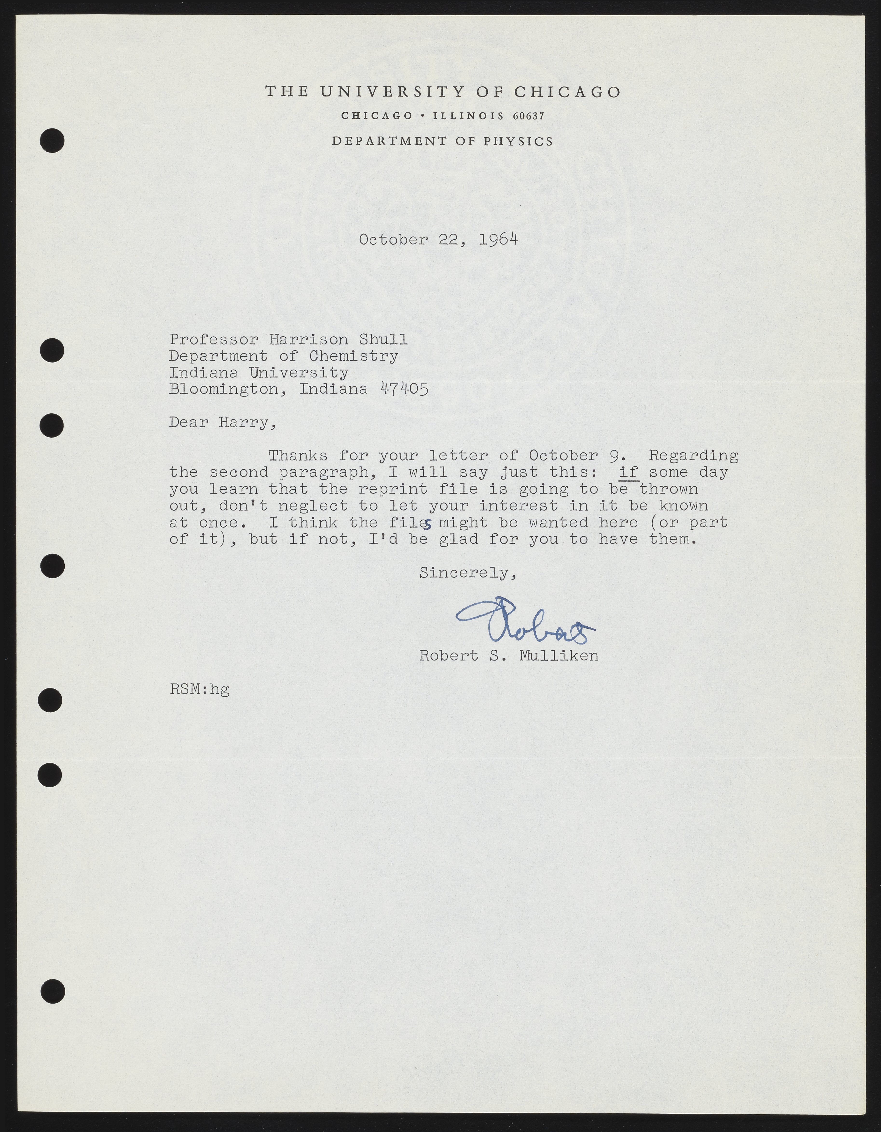 Mulliken, Robert Sanderson. “Letter from Robert S. Mulliken to Harrison Shull, 1964,” October 22, 1964. Robert S. Mulliken & Harrison Shull Correspondence, Box 1. Science History Institute. Philadelphia. https://digital.sciencehistory.org/works/qb98mf50f.