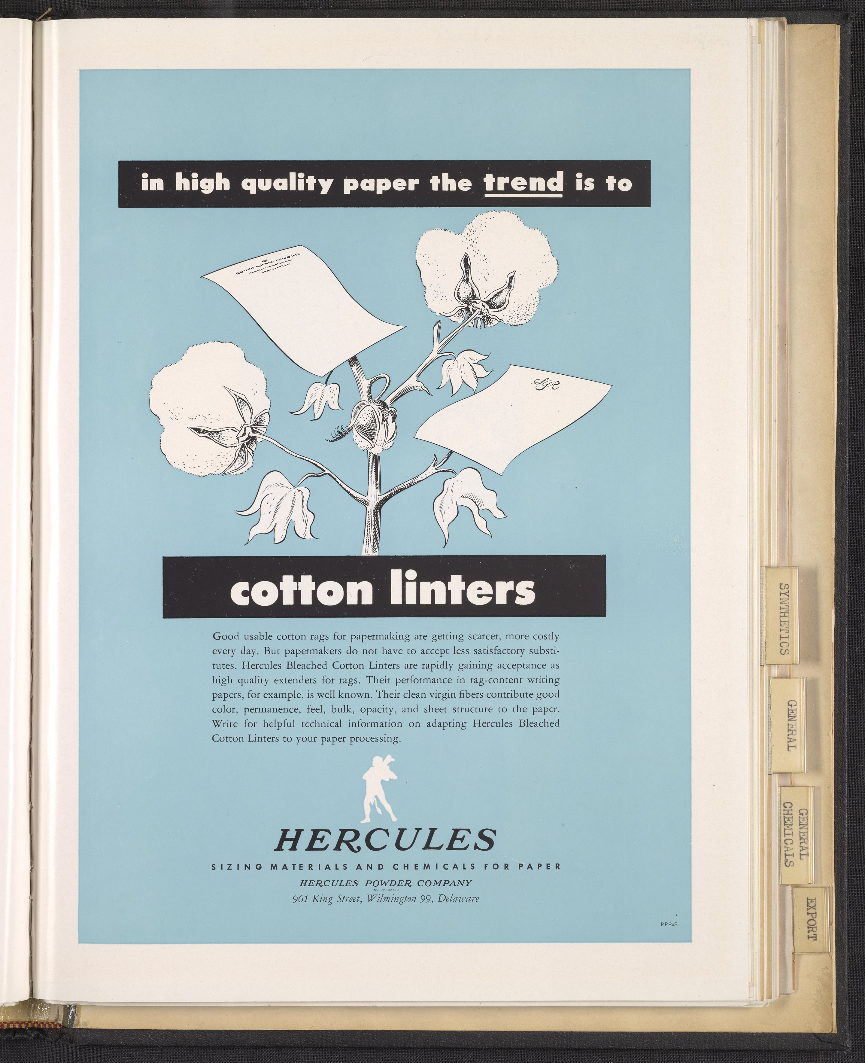Hercules Incorporated. “In High Quality Paper the Trend Is to Cotton Linters.” 1948 Hercules Advertisements, 1948. Records of Hercules Incorporated, Volume 1948. Science History Institute. Philadelphia. https://digital.sciencehistory.org/works/qbdqsen.