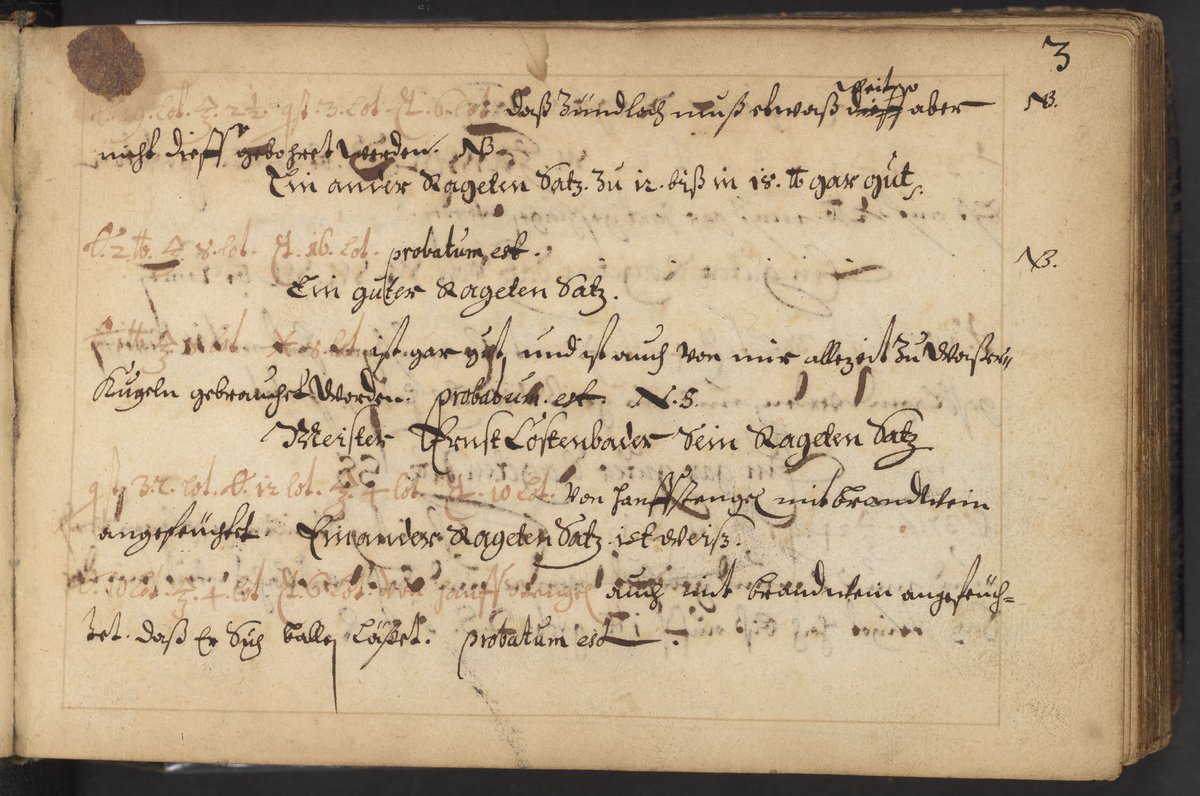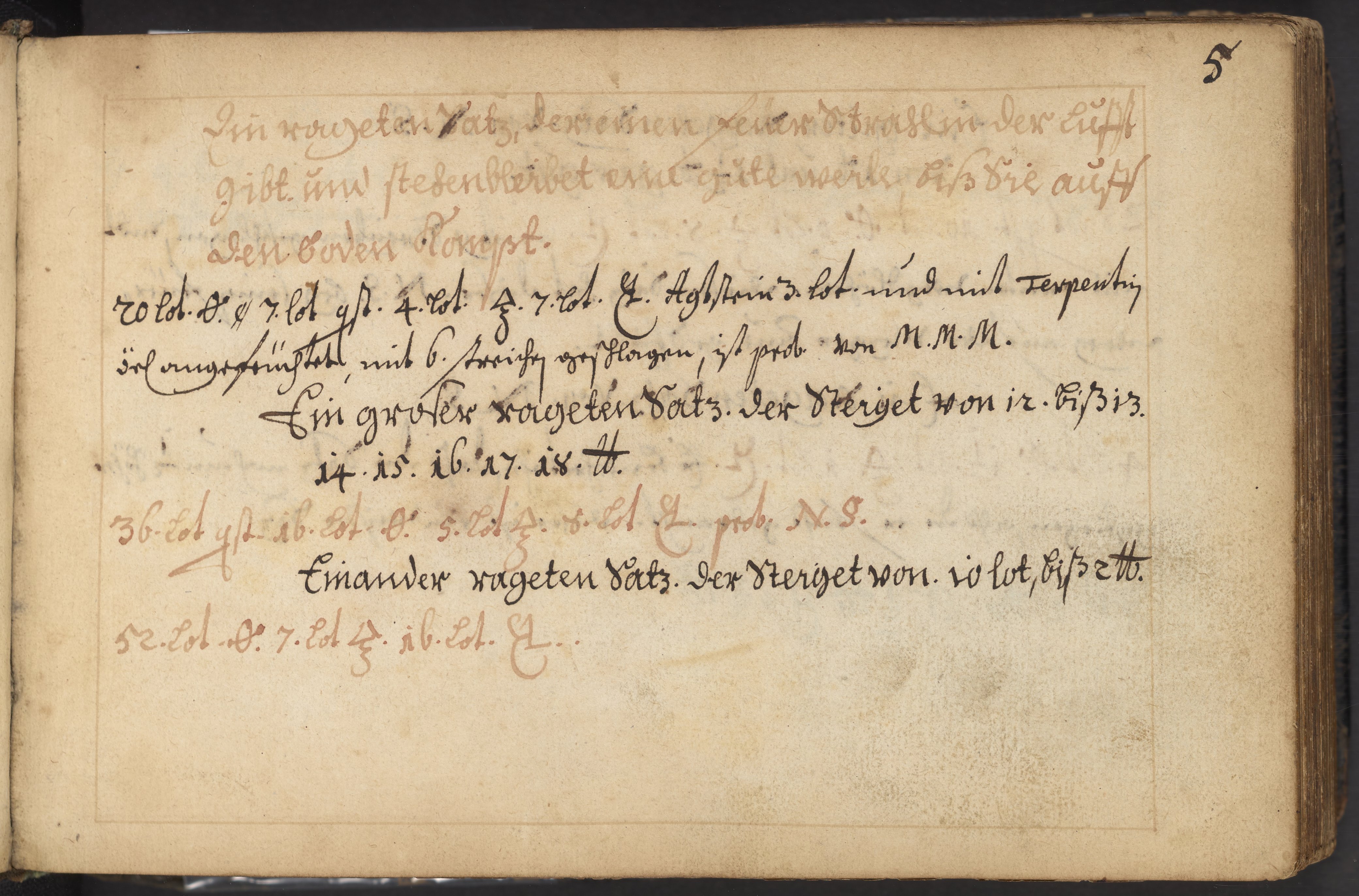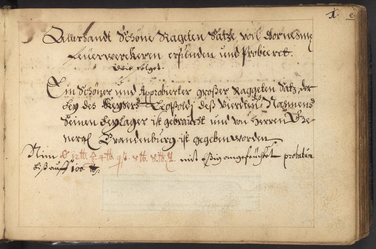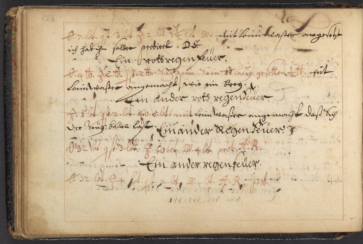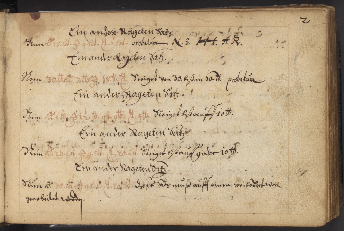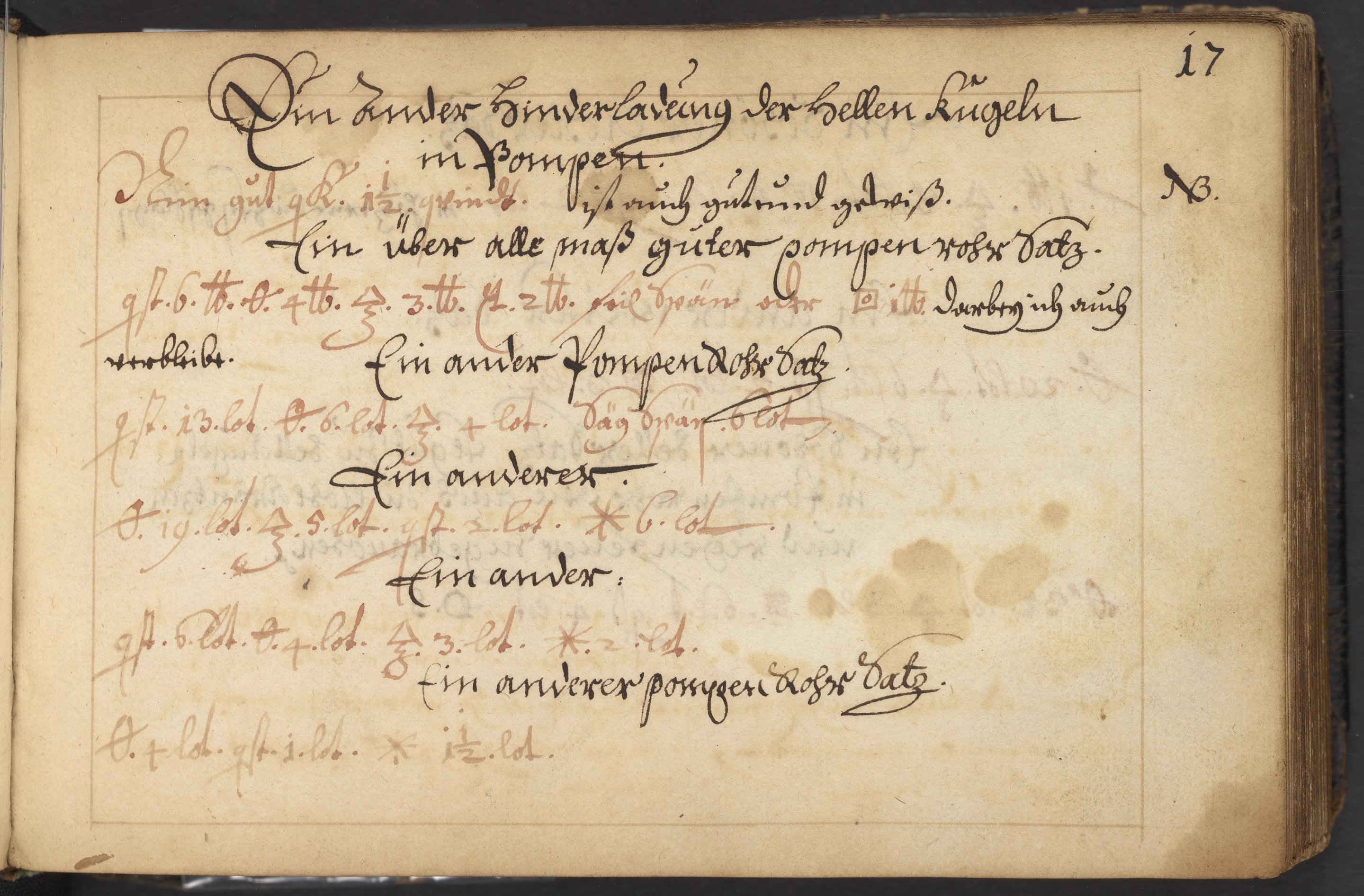 Small JPG1200 x 819px — 251 KBLarge JPG2880 x 1966px — 1.3 MBFull-sized JPG4200 x 2867px — 2.5 MBOriginal fileTIFF — 4200 x 2867px — 34.5 MBA manuscript work from Andreas Räbel, a 17th-century pyrotechnician, containing formulas and recipes for the creation of fireworks, explosives, rockets, detonators, flares, bombs, and other armament. The recipes call for ingredients ranging from metallic and metalloid elements such as antimony, tin, and mercury, to naturally occurring minerals and substances such as orpiment, chalk, coal, tree oil, and resin. The work is handwritten in German, cursive script, and includes colored ink drawings labeled with reference numbers and letters. The work also contains Räbel's description of the wedding of Emperor Leopold von Habsburg (1640-1705) to Margarita Teresa of Spain (1651-1673) on December 12, 1666. Work is digitized in its entirety.