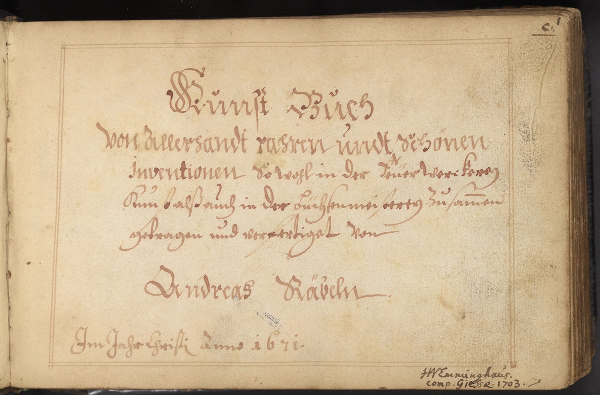 Räbel, Andreas, active 17th century. “Kunst Buch Von Allerhandt Rahren Undt Schönen Inventionen so Wohl in Der Feuerwerckerey Kunst Als Auch in Der Büchsenmeisterey Zusammen,” 1671. MS 20. Science History Institute. Philadelphia. https://digital.sciencehistory.org/works/qcv8b6d.