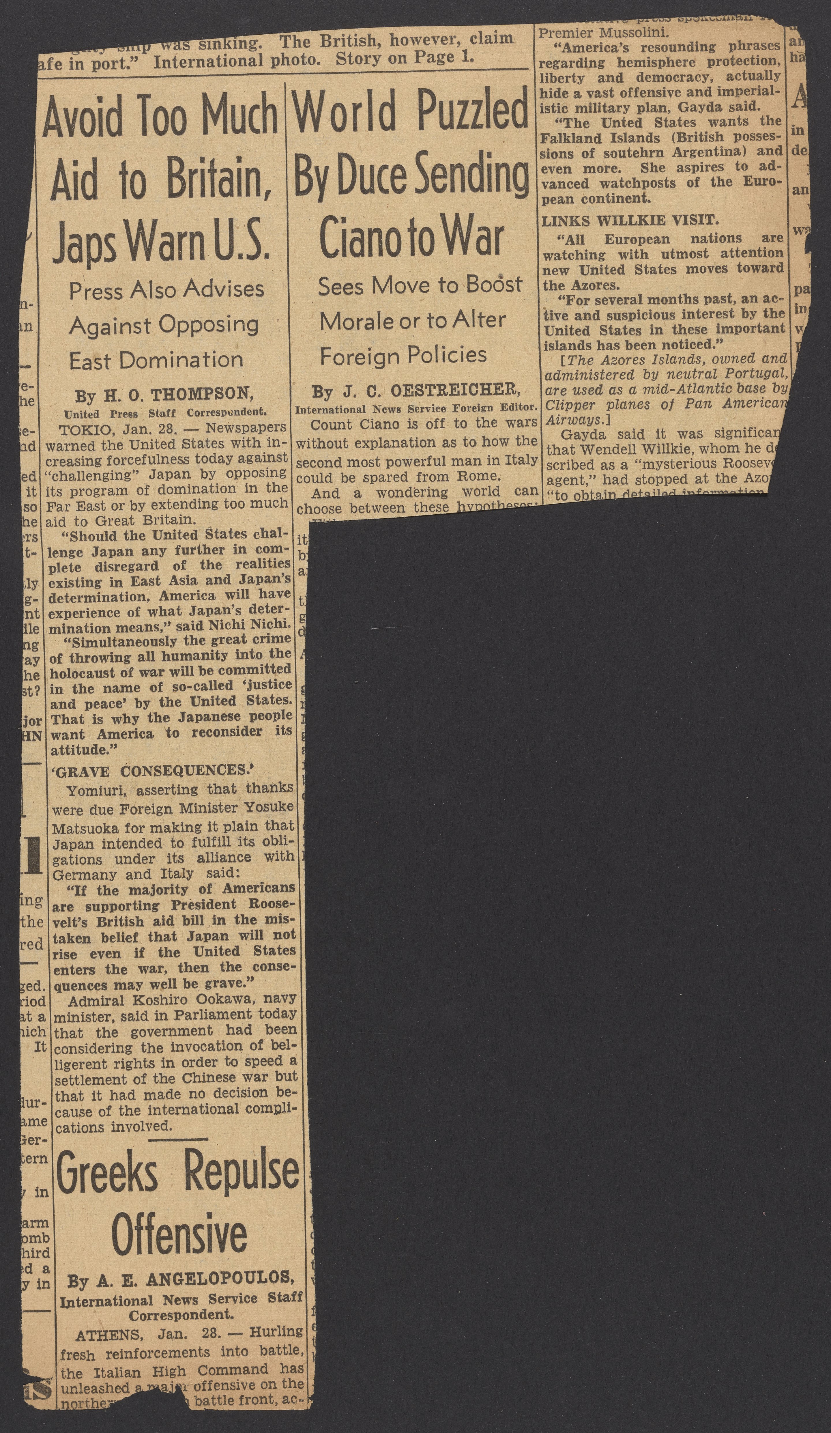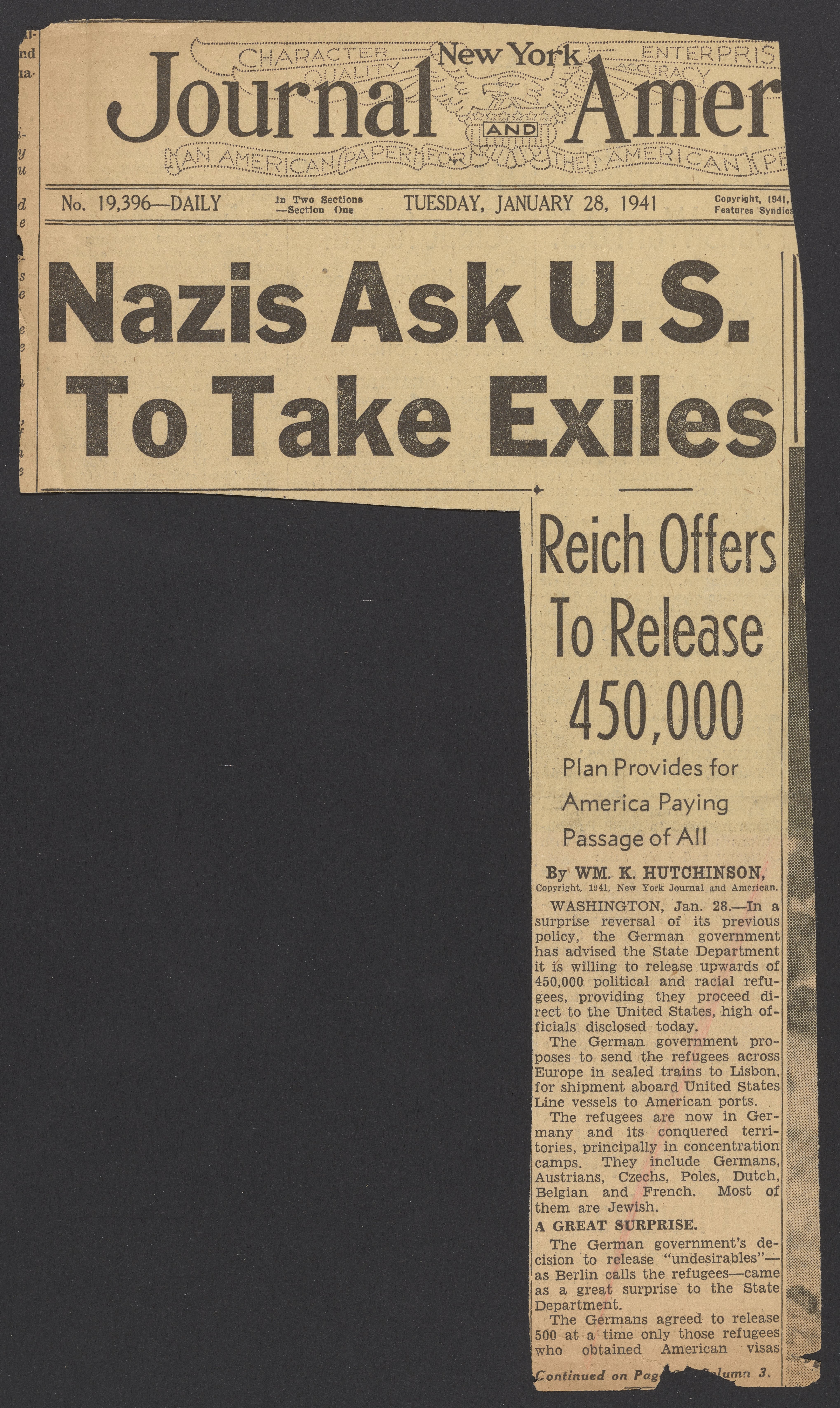 Hutchinson, William Kinsey. “Nazis Ask U.S. To Take Exiles.” Hearst Corporation, January 28, 1941. Papers of Georg and Max Bredig, Box 10, Folder 24. Science History Institute. Philadelphia. https://digital.sciencehistory.org/works/qcy5u9g.