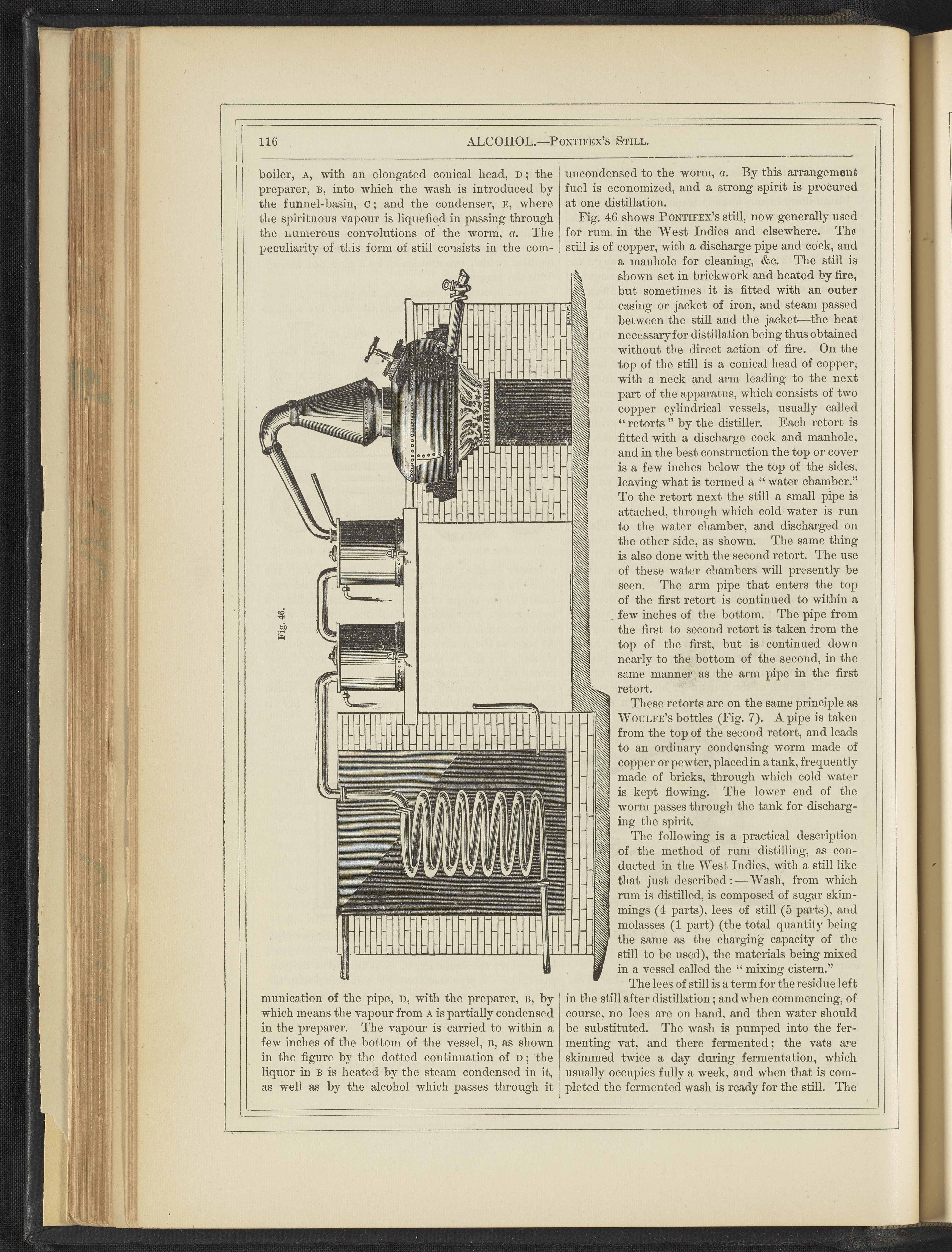 “Pontifex's Still for the Distillation of Alcohol.” In Encyclopædia of Chemistry, Theoretical, Practical, and Analytical, as Applied to the Arts and Manufacturers, Vol. I and II. Philadelphia, Pennsylvania: J.B. Lippincott & Co., 1877. https://digital.sciencehistory.org/works/qf85nb36v.