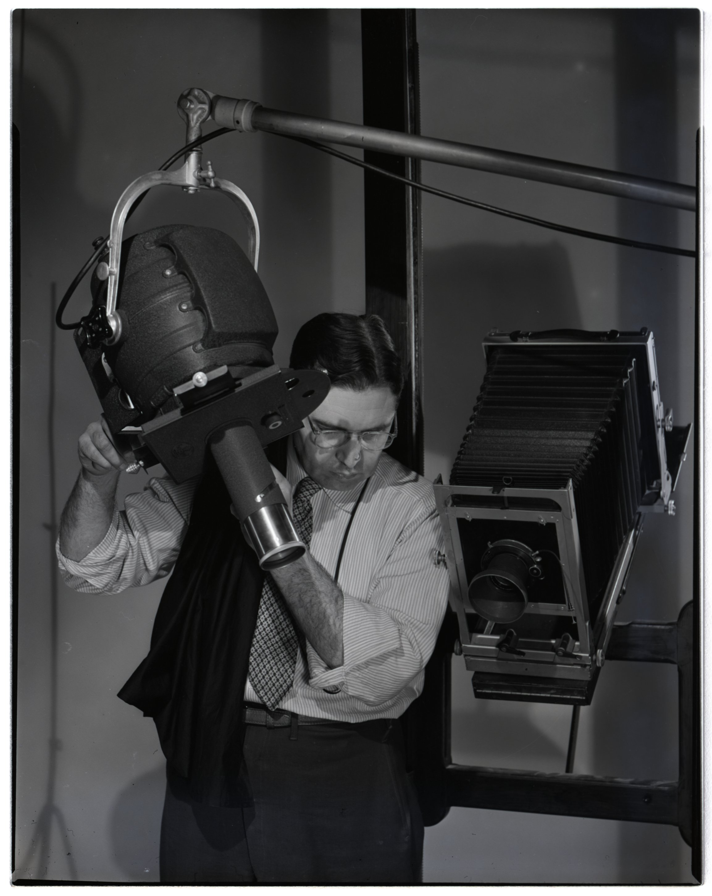General view of photographer and lab director Bill Shetzley positioning a camera for a photo shoot in the Dow Chemical Company's Photographic Laboratory. Established in the 1930's, the Photo Lab took pictures for employee publications like The Brine Well and Dow Diamond, as well as for newspaper and magazine releases sent out by Dow's Editorial Service and Advertising Department.