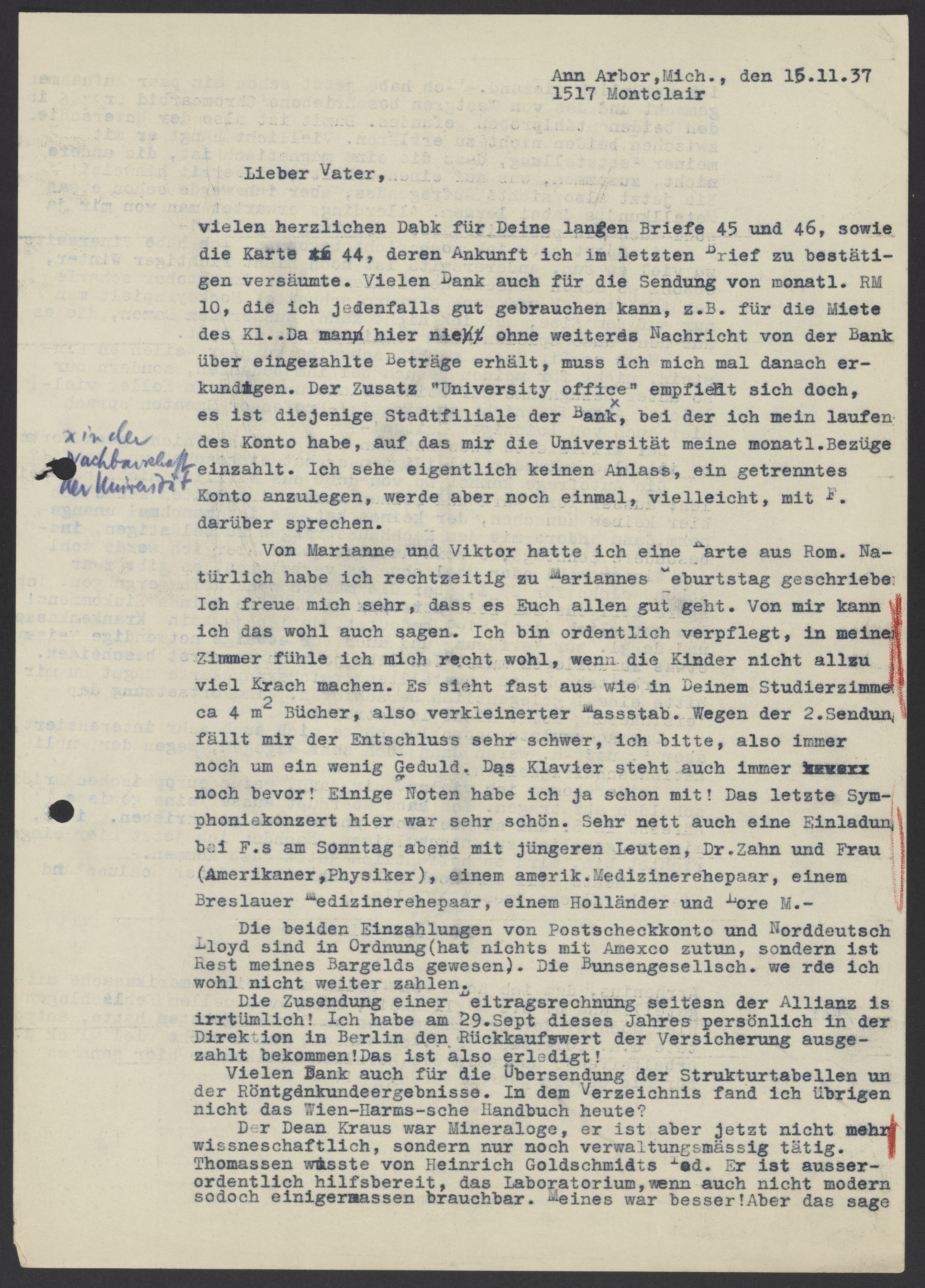 vielen herzlichen Dank für Deine langen Briefe 45 und 46, sowie die Karte 44, deren Ankunft ich im letzten Brief zu bestätigen versäumte. Vielen Dank auch für die Sendung von monatl. RM 10, die ich jedenfalls gut gebrauchen kann, z.B. für die Miete des Kl..Da man hier nie ohne weiteres Nachricht von der Bank über eingezahlte Beträge erhält, muss ich mich mal danach erkundigen. Der Zusatz "University office" empfiehlt sich doch, es ist diejenige Stadtfiliale der Bank, bei der ich mein laufendes Konto habe, auf das mir die Universität meine monatl. Bezüge einzahlt. Ich sehe eigentlich keinen Anlass, ein getrenntes Konto anzulegen, werde aber noch einmal, vielleicht, mit F. darüber sprechen.