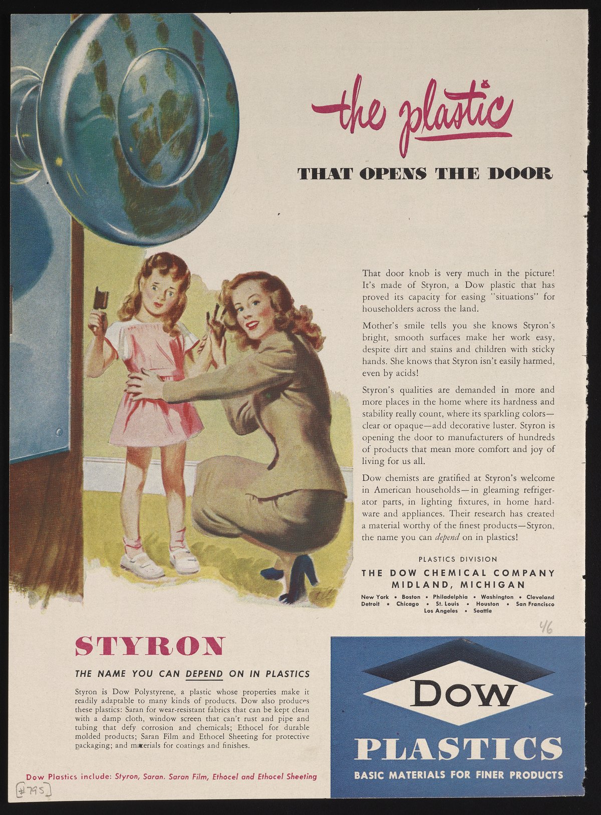 Dow Chemical Company. “The Plastic That Opens the Door,” circa 1946. Advertisements from the Dow Chemical Historical Collection, Box 9. Science History Institute. Philadelphia. https://digital.sciencehistory.org/works/qgccd4k.