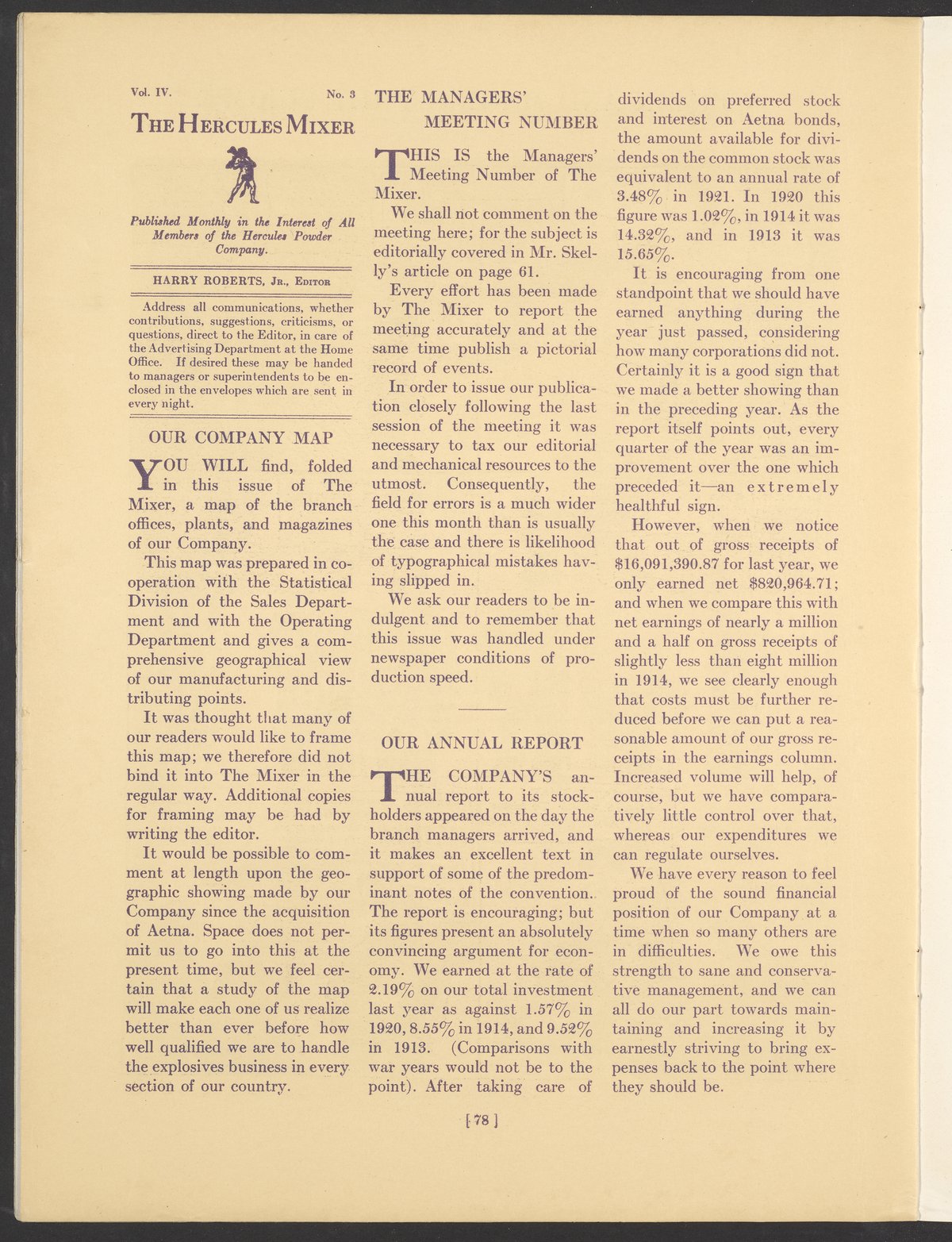 Small JPG1200 x 1587px — 359 KBLarge JPG2880 x 3809px — 2.4 MBFull-sized JPG3795 x 5019px — 3.9 MBOriginal fileTIFF — 3795 x 5019px — 54.6 MBMarch 1922 issue of The Hercules Mixer, the Hercules Powder Company's in-house publication that provided both historical and technical information and also offered a glimpse of employees' day-to-day lives at the company. Includes a map of the Sales Offices, Plants, and Magazines of the Hercules Powder Company.