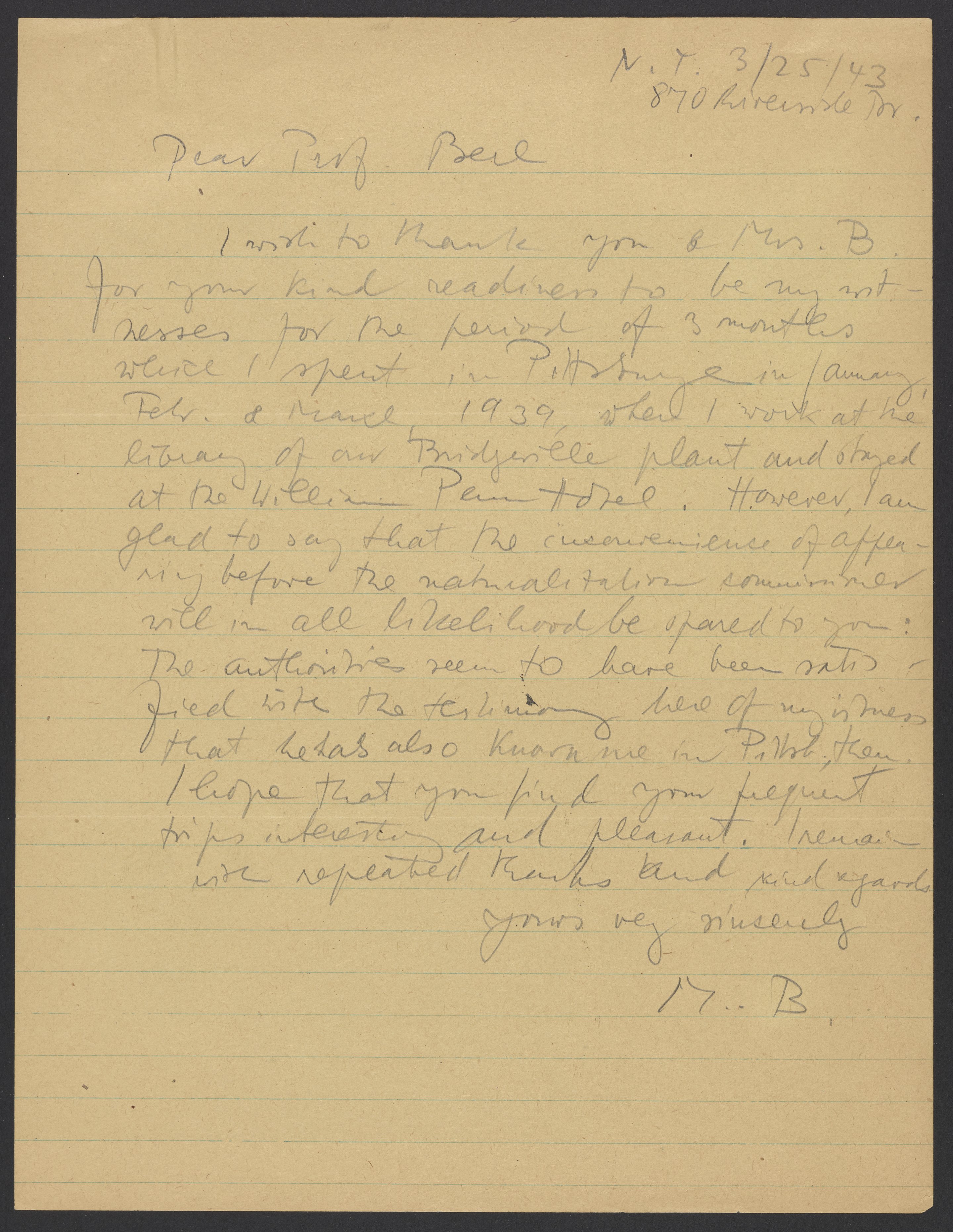 Max Albert Bredig (1902-1977) thanks Ernst Berl (1877-1946) for his being willing to be his witness for his citizenship petition.