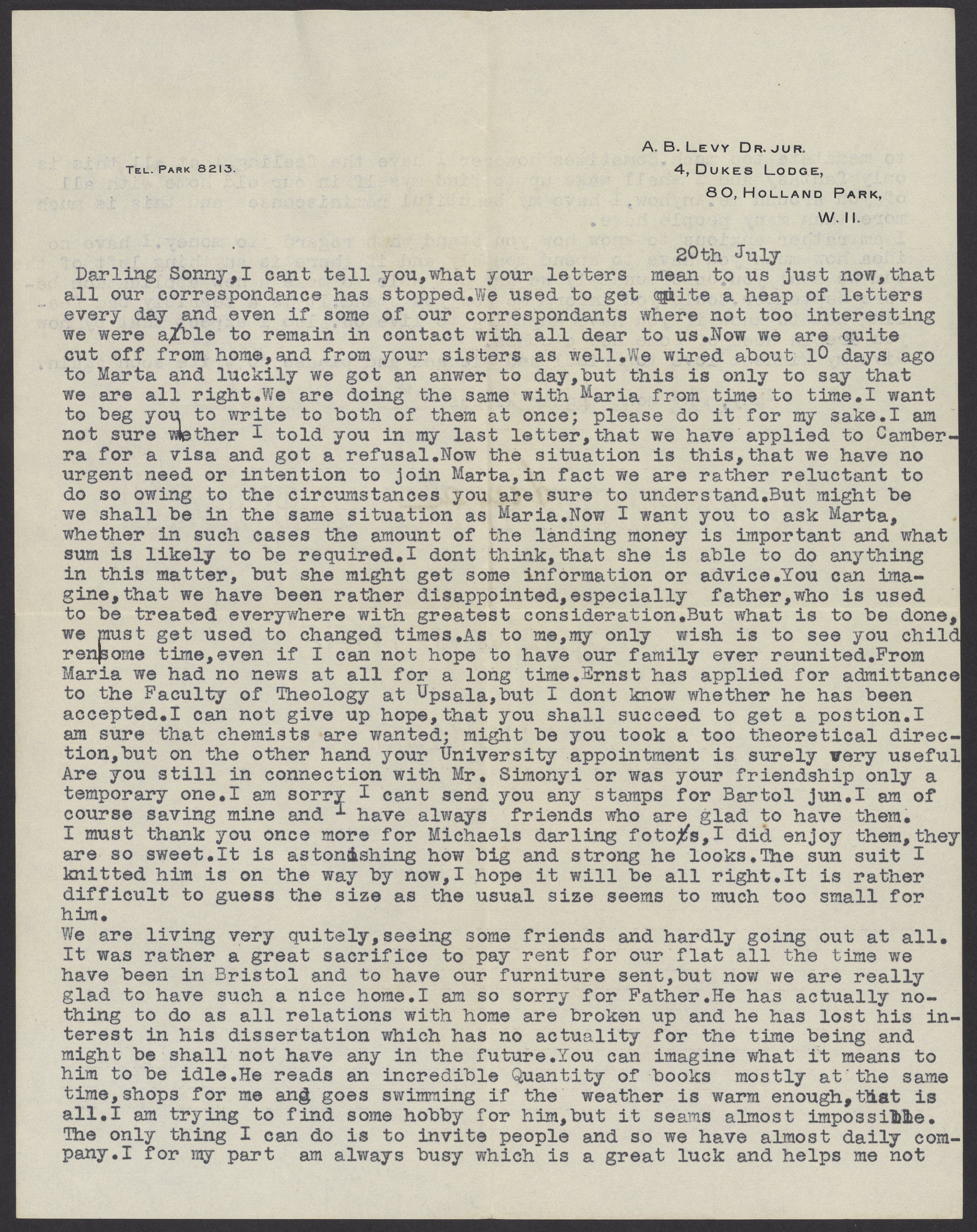 Letter to Gabor B. Levy from Margaret Levy, July 20, 1941