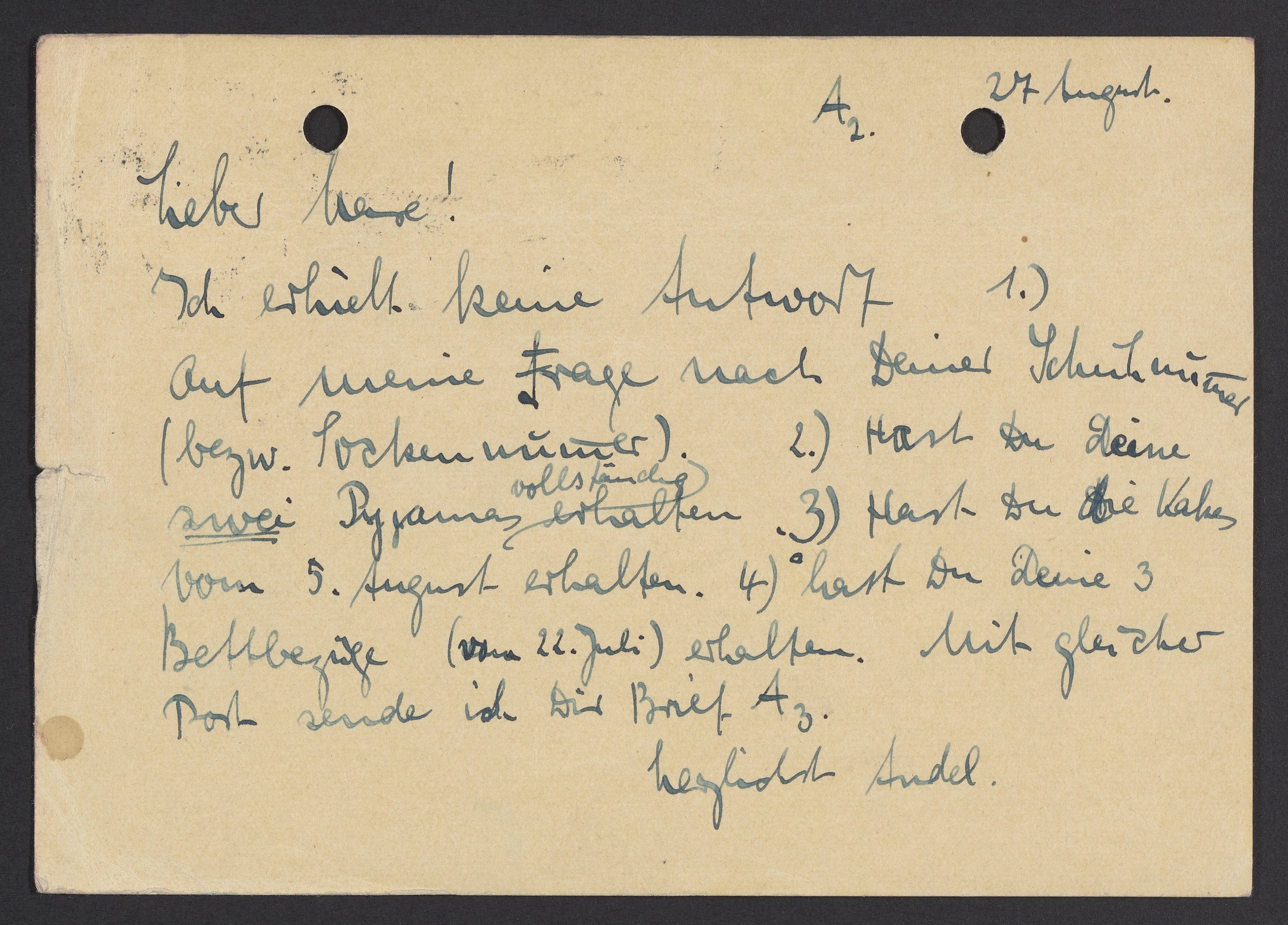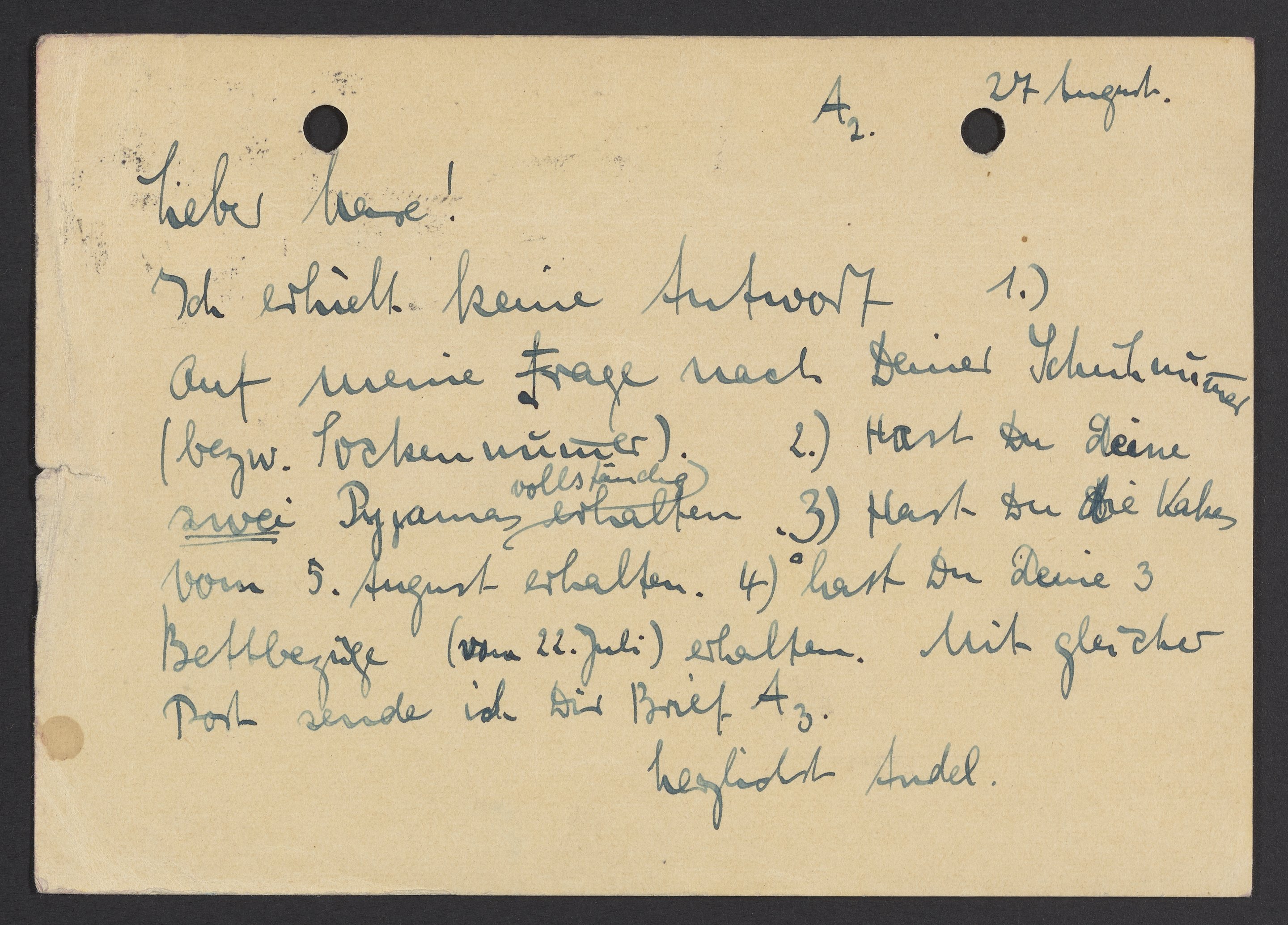 Ich erhielt keine Antwort 1.) auf meine Frage nach Deiner Schuhwische (bzw. Sockenummer) 2.) Hast Du Deine zwei Pyjamas vollständig erhalten. 3) Hast Du die Kakse vom 5. August erhalten. 4) Hast Du Deine 3 Bettbezüge (vom 22. Juli) erhalten. Mit gleicher Post sende ich Dir Brief A3.