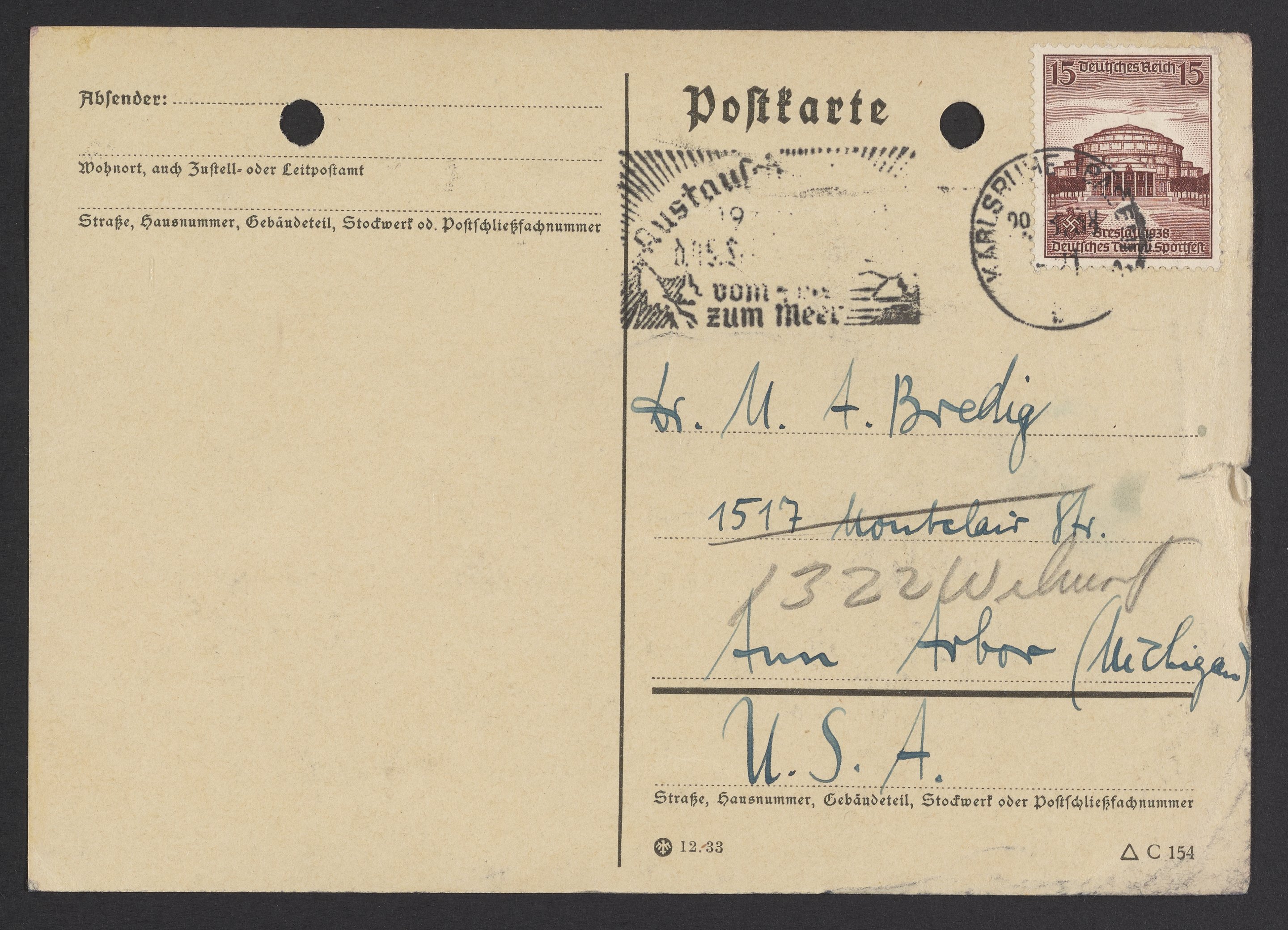 Homburger, Marianne. “Postcard from Marianne Homburger to Max Bredig, August 27, 1938,” August 27, 1938. Papers of Georg and Max Bredig, Box 8, Folder 21. Science History Institute. Philadelphia. https://digital.sciencehistory.org/works/qju866o.