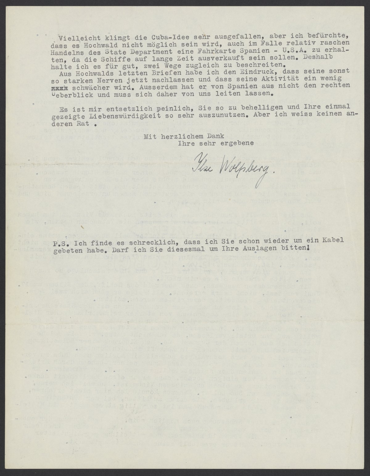 The second possibility would be to have Hochwald sail to Cuba as quickly as possible to avoid the complete destruction of his chances by the outbreak of war in Spain or the United States’ participation in it. He personally wrote a few weeks ago that he was thinking about this possibility. As far as I know, the prerequisite for a Cuban visa is a deposit of $500 dollars. I couldn’t find out more here. Could I ask you to call the responsible Cuban consulate? I’m completely cut off in the Midwest.