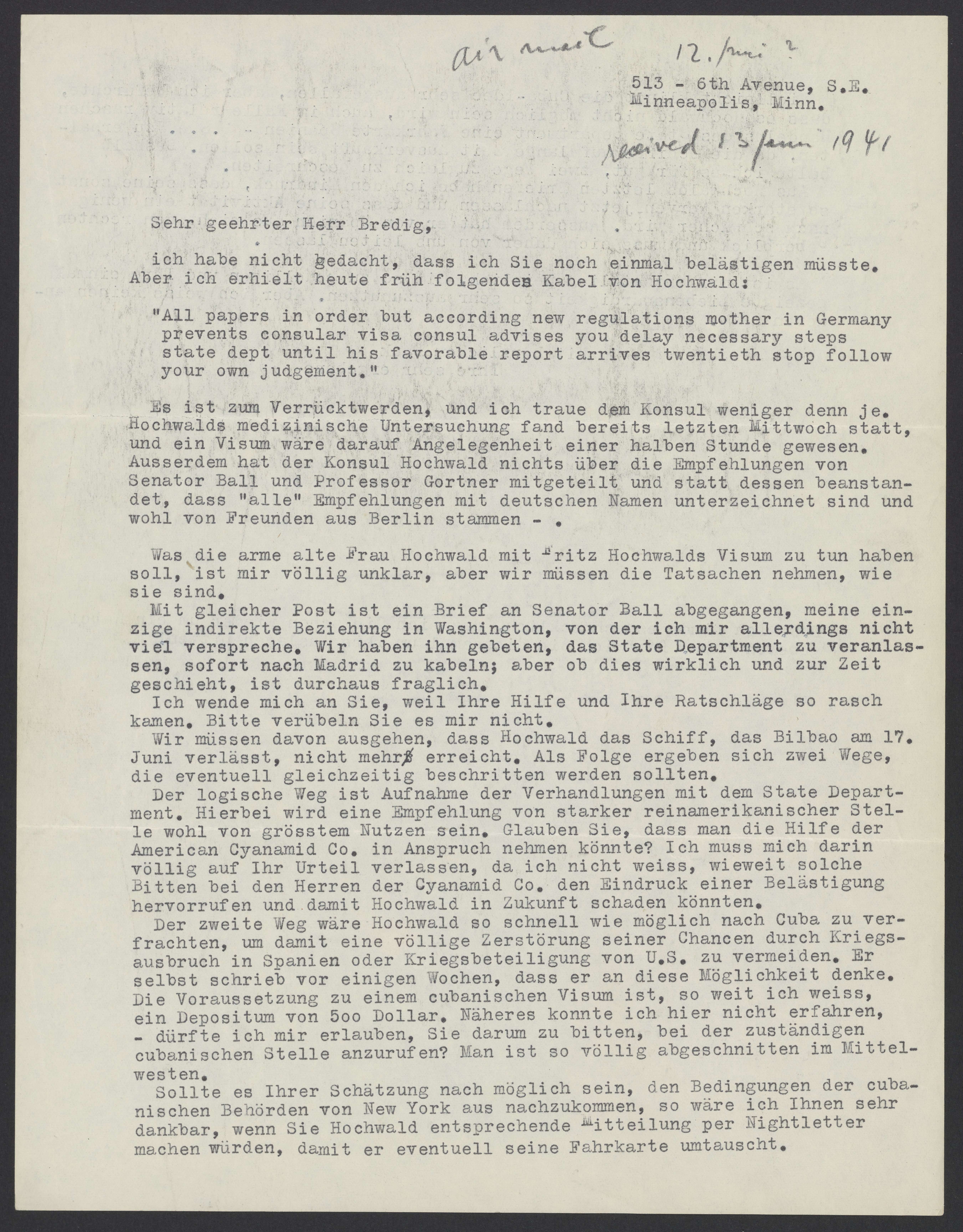 Es ist zum Verrücktwerden, und ich traue dem Konsul weniger denn je Hochwalds medizinische Untersuchung fand bereits letzten Mittwoch statt, und ein Visum wäre darauf Angelegenheit einer halben Stunde gewesen. Ausserdem hat der Konsul Hochwald nichts über die Empfehlungen von Senator Ball und Professor Gortner mitgeteilt und statt dessen beanstandet, dass “alle” Empfehlungen mit deutschen Namen unterzeichnet sind und wohl von Freunden aus Berlin stammen - .