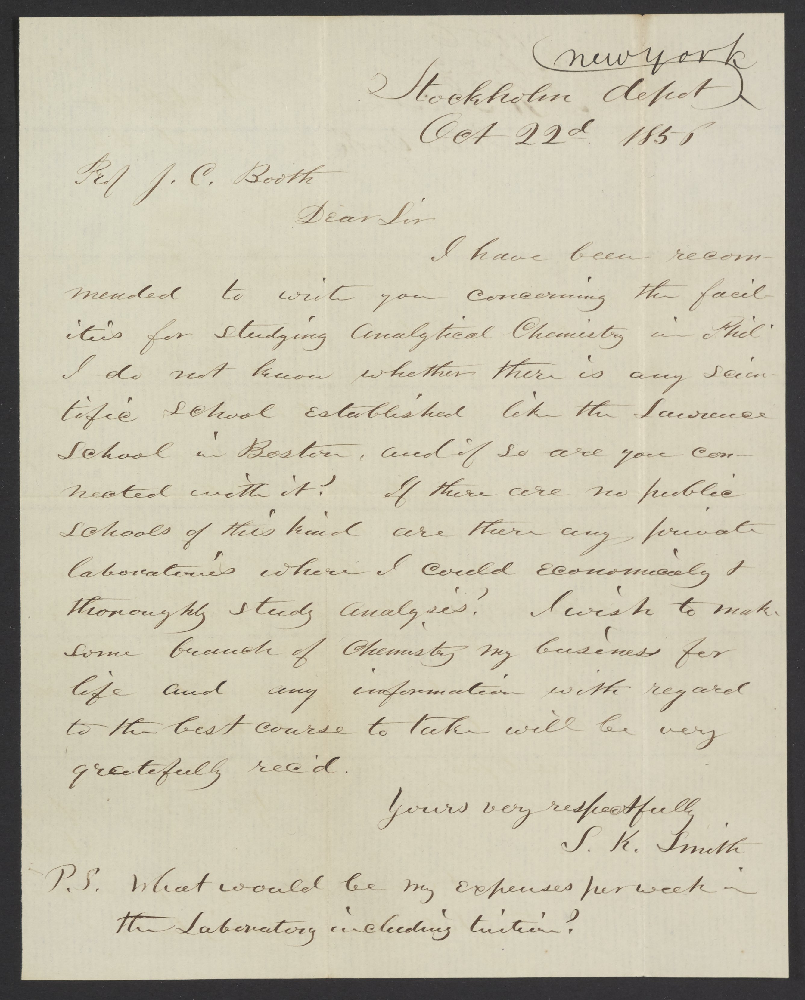 Letter from S.K. Smith to James Curtis Booth, October 22, 1856