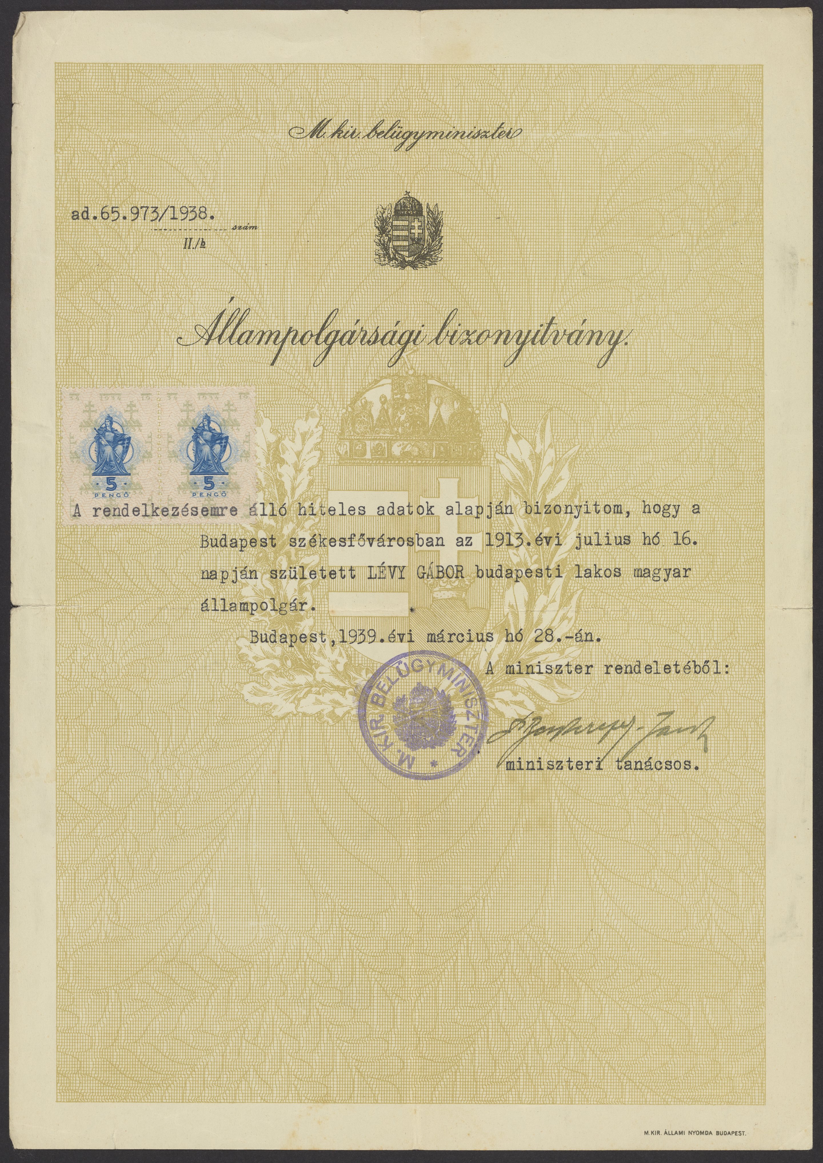 Gabor B. Levy's Hungarian citizenship certificate