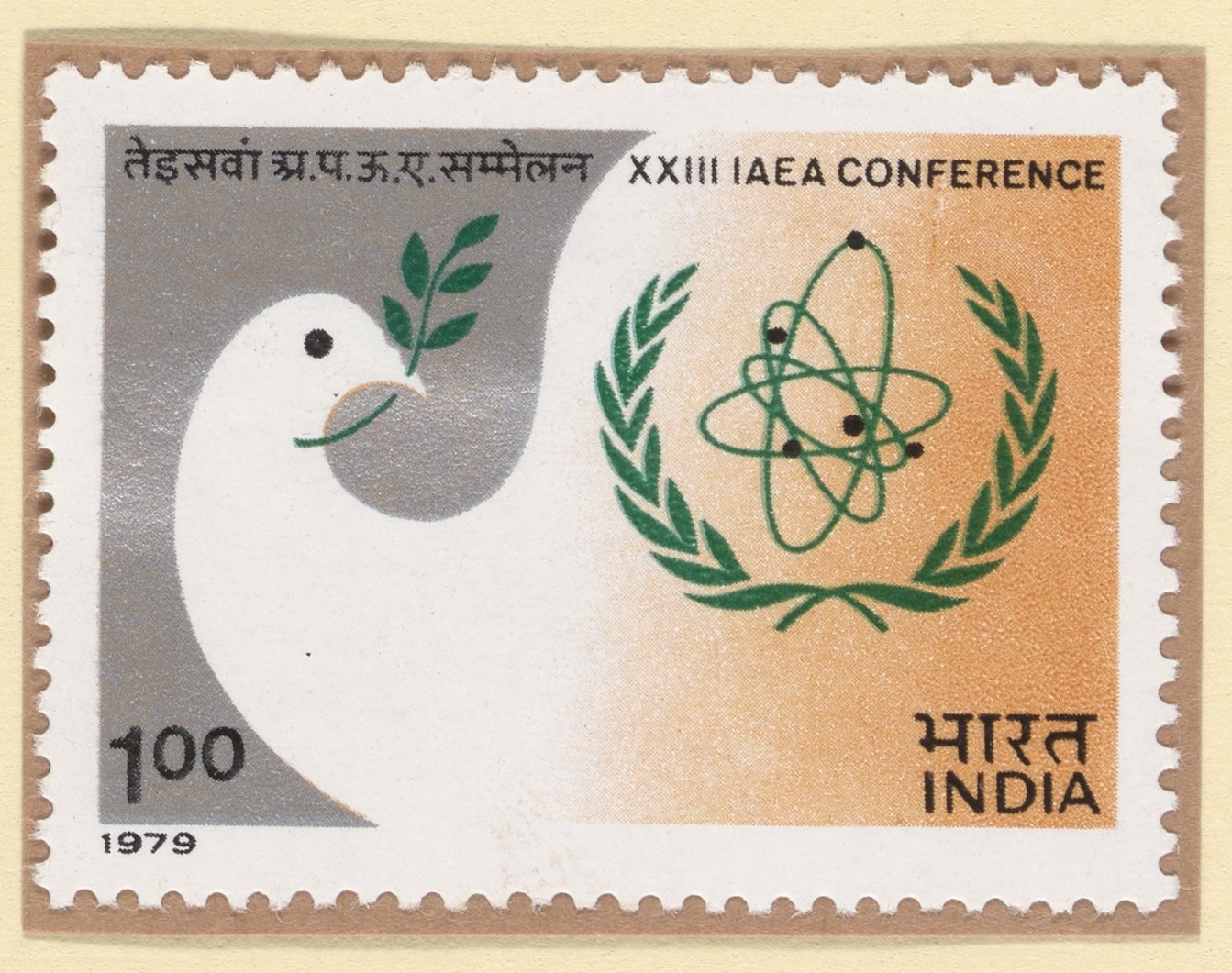 India. Posts and Telegraphs Department. “Postage Stamp Commemorating the 23rd International Atomic Energy Agency Conference,” December 1979. Witco Stamp Collection, Box 4. Science History Institute. Philadelphia. https://digital.sciencehistory.org/works/qnjjdox.