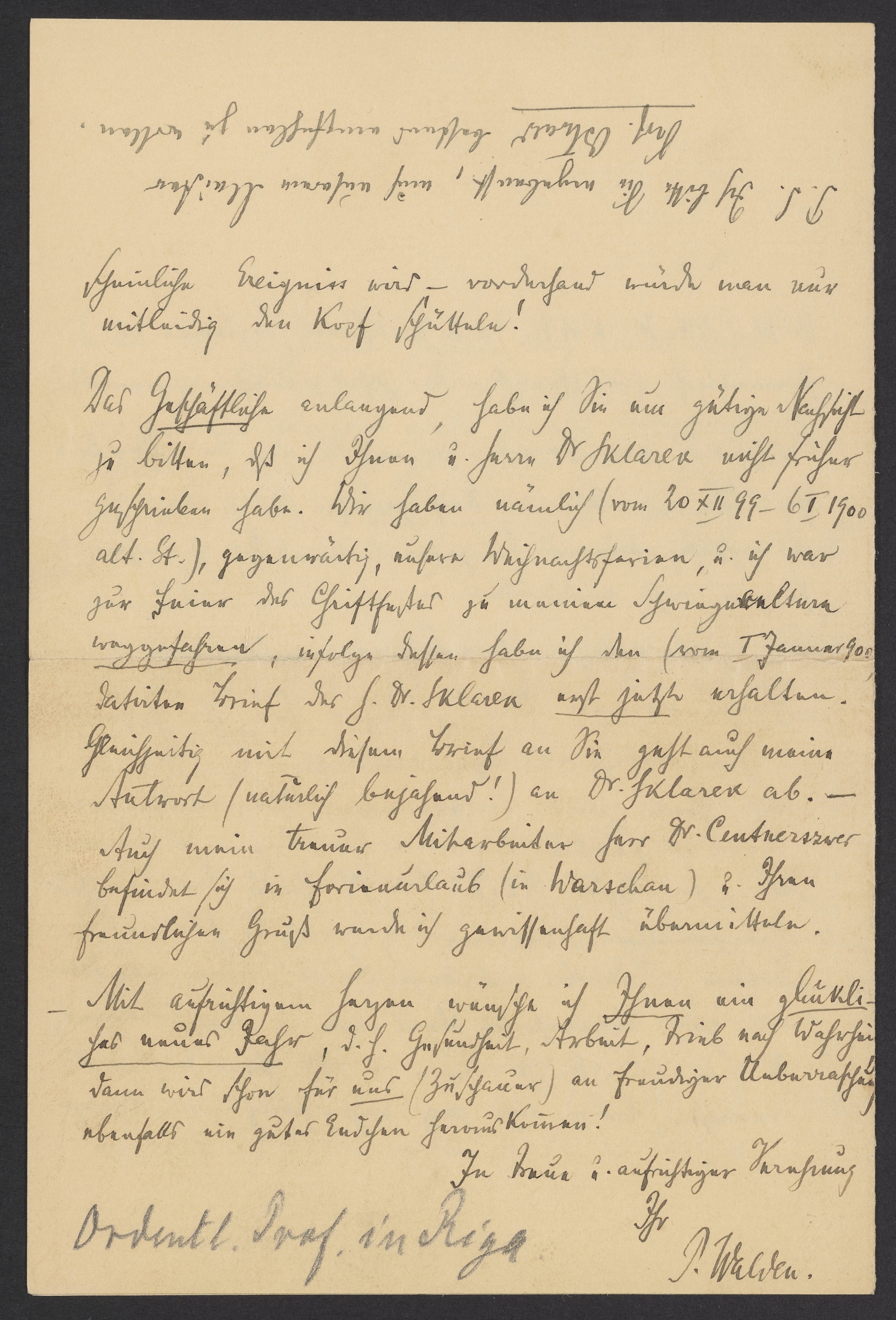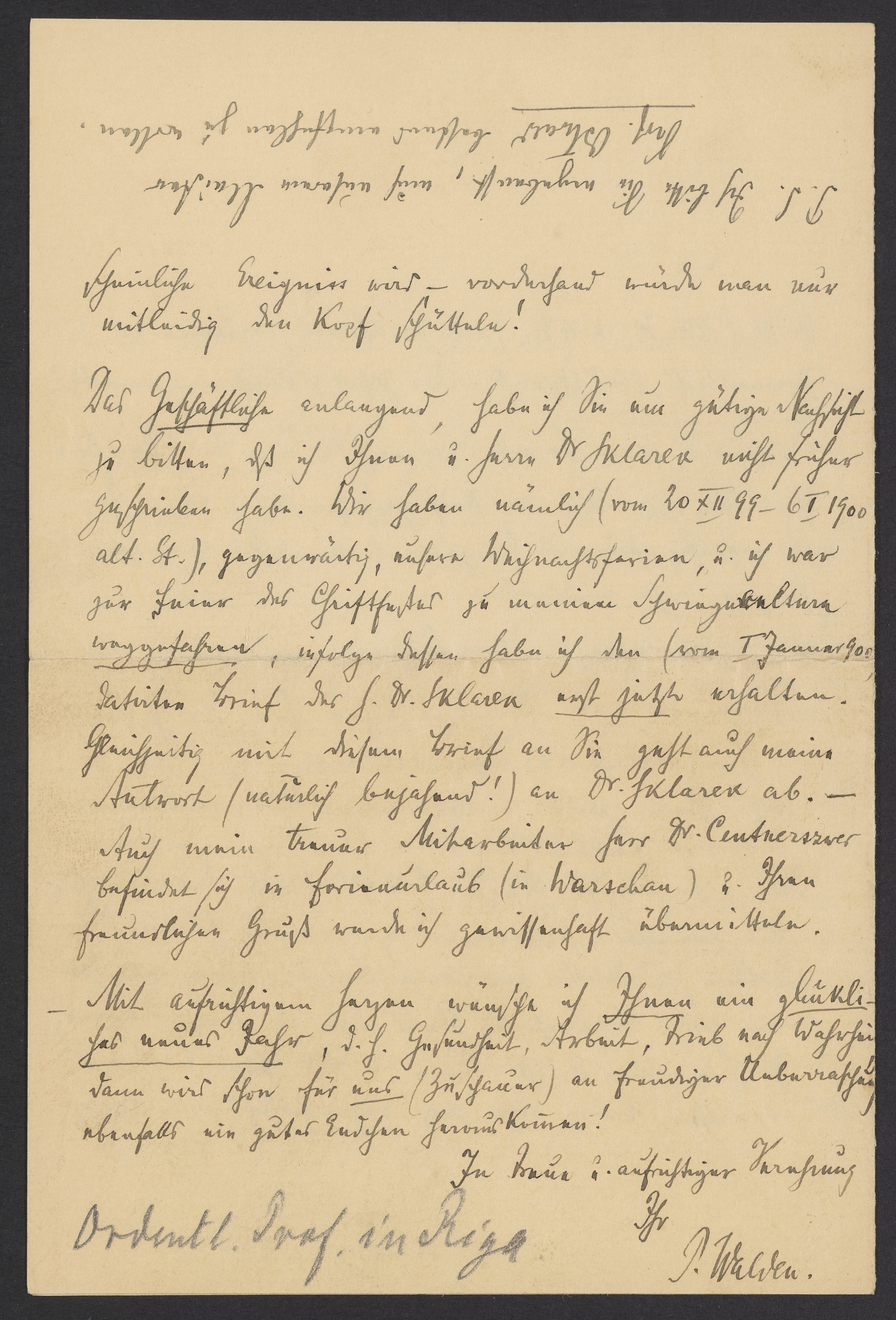 Das Geschäftliche anbelangend, habe ich Sie um gütige Nachsicht zu bitten, daß ich Ihnen u. Herrn Dr. Sklaren nicht früher geschrieben habe. Wir haben nämlich (vom 20 XII [18]99 – 6 I 1900 alt. St.), gegenwärtig, unsere Weihnachtsferien, u. ich war zur Feier des Christfestes zu meinen Schwiegereltern weggefahren, infolge dessen habe ich den (vom I Januar 1900) datierten Brief des H. Dr. Sklaren erst jetzt erhalten. Gleichzeitig mit diesem Brief an Sie geht auch meine Antwort (natürlich bejahend!) an Dr. Sklaren ab. – Auch mein treuer Mitarbeiter Herr Dr. Centnertzwer befindet sich in Ferienurlaub (in Warschau) u. Ihren freundlichen Gruß werde ich gewissenhaft übermitteln.