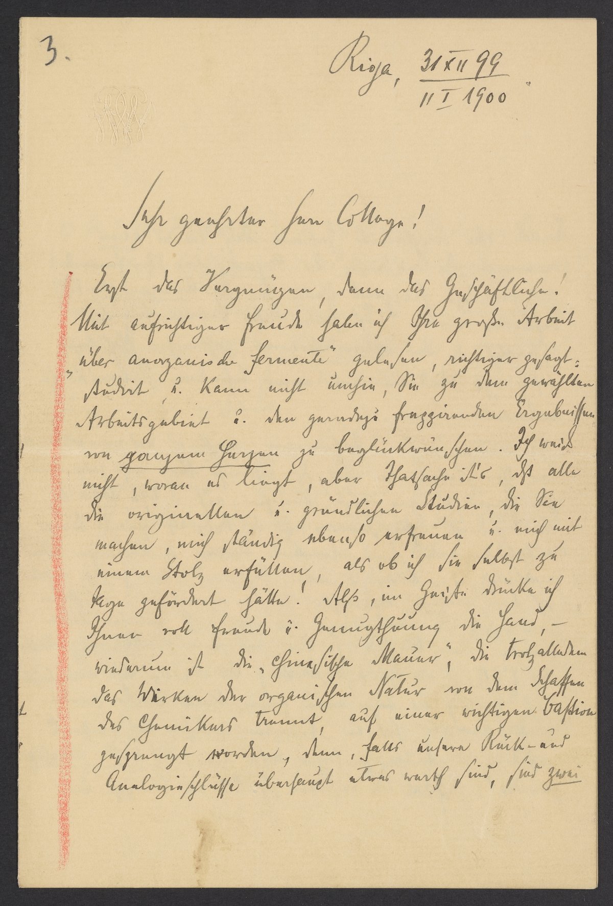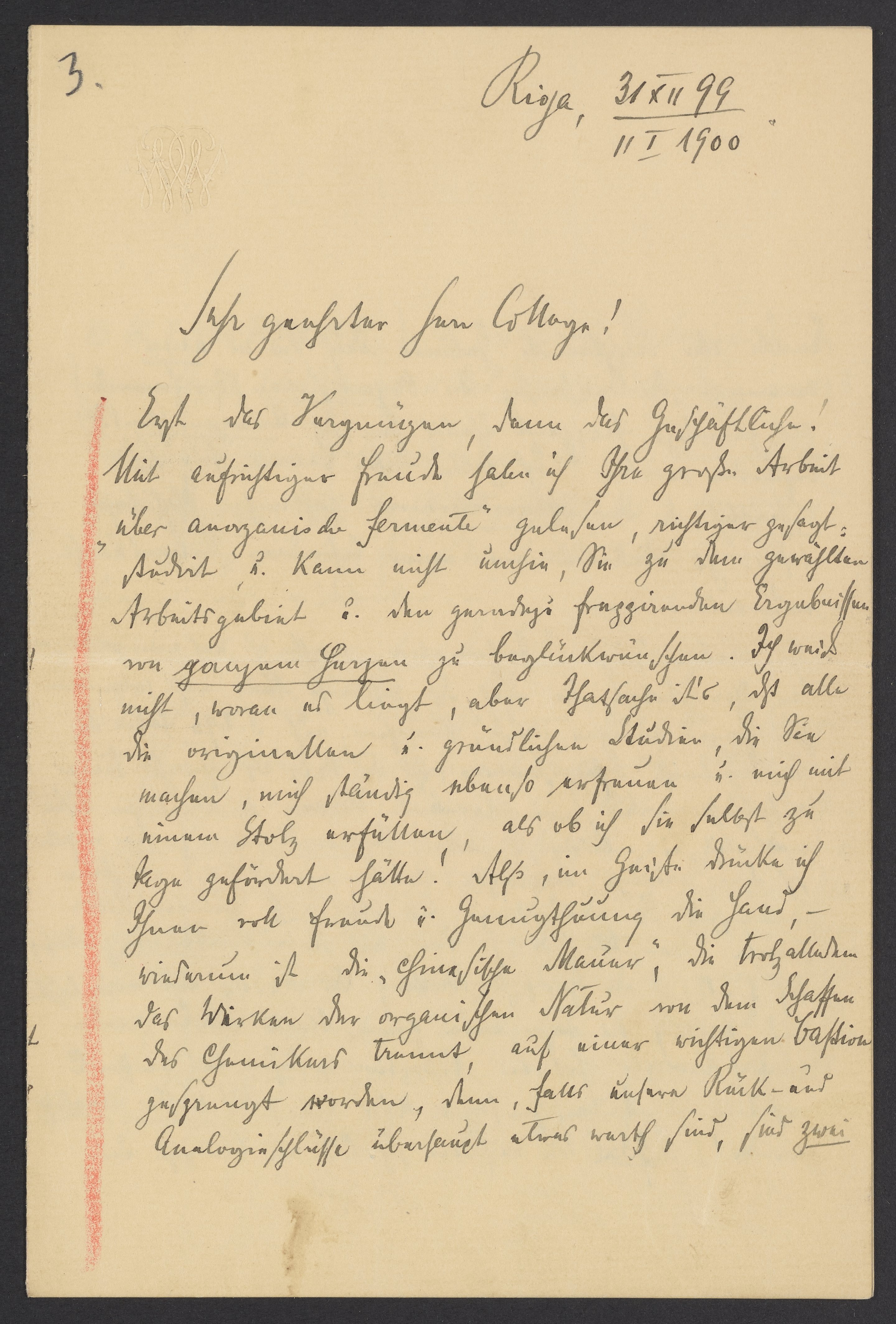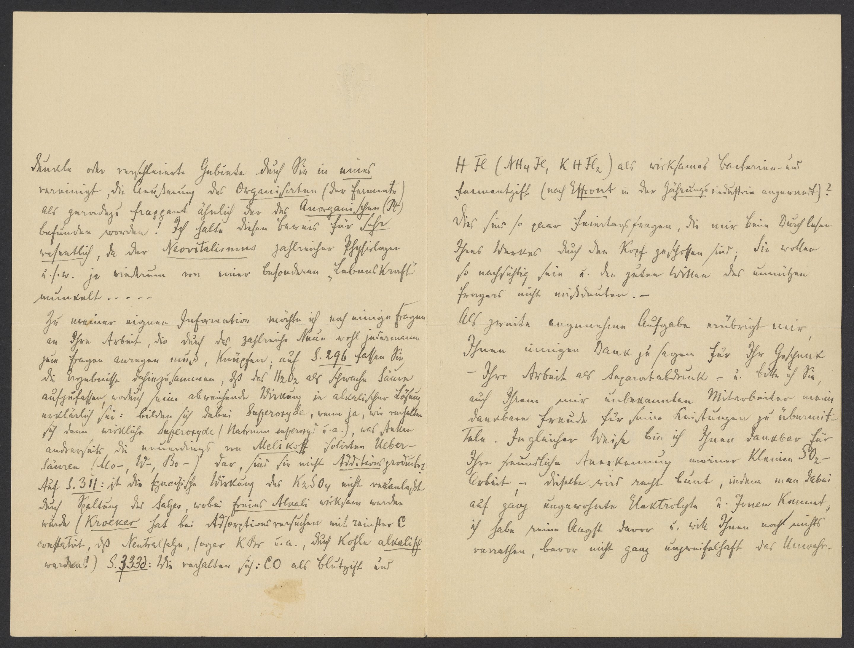 Erst das Vergnügen, dann das Geschäftliche! Mit aufrichtiger Freude habe ich Ihre große Arbeit „über anorganische Fermente“ gelesen, richtiger gesagt: studiert, u. kann nicht umhin, Sie zu dem gewählten Arbeitsgebiet u. den geradezu frappierenden Ergebnissen von ganzem Herzen zu beglückwünschen. Ich weiß nicht, woran es liegt, aber Thatsache ist es, daß alle die originellen u. gründlichen Studien, die Sie machen, mich ständig ebenso erfreuen u. mich mit einem Stolz erfüllen, als ob ich sie selbst zu Tage gefördert hätte! Also, im Geiste drücke ich Ihnen voll Freude u. Genugthuung die Hand, – wiederum ist die „chinesische Mauer“, die trotz alledem das Wirken der organischen Natur von dem Schaffen des Chemikers trennt, auf einer wichtigen Bastion gesprengt worden, denn, falls unsere Rück- und Analogieschlüsse überhaupt etwas werth sind, sind zwei