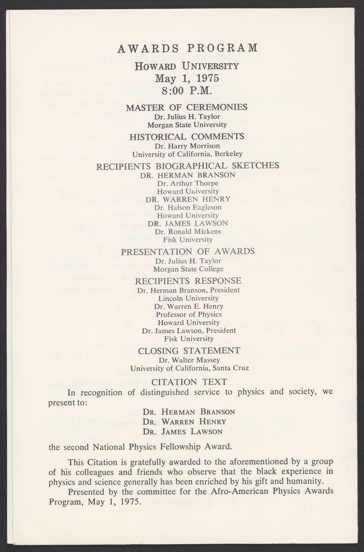 Small JPG1200 x 1813px — 360 KBLarge JPG2880 x 4351px — 2.3 MBFull-sized JPG3527 x 5329px — 3.5 MBOriginal fileTIFF — 3527 x 5329px — 53.8 MBProgram for the second Awards Ceremony for Outstanding Black Physicists, held at Howard University on May 1, 1975. The award ceremony honored Herman Branson (1914-1995), Warren E. Henry (1909-2001), and James R. Lawson (1915-1996). The event included a "Scientific Program," with lectures by Walter E. Massey (1938-), William M. Jackson (1936-), William A. Lester, Jr. (1937-), Ernest Coleman (1943-1990), James E. Young, and Warren E. Henry.