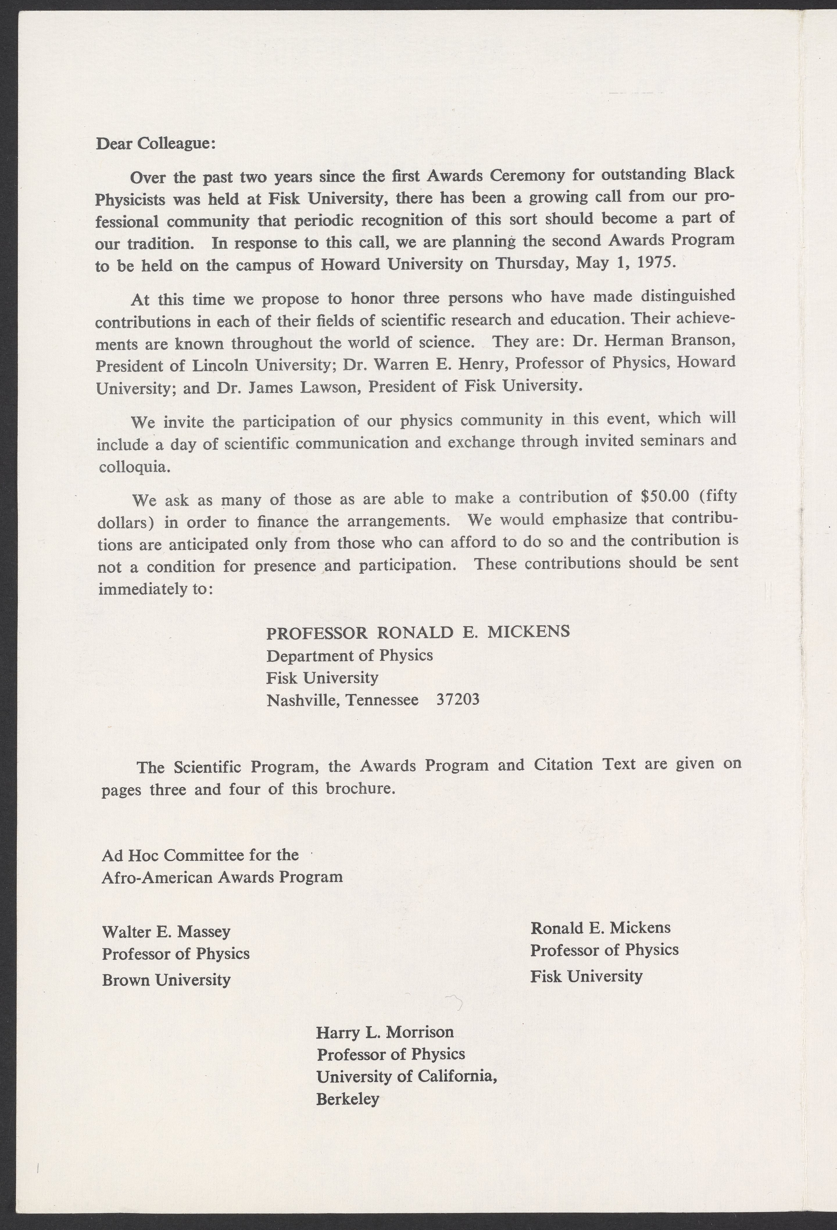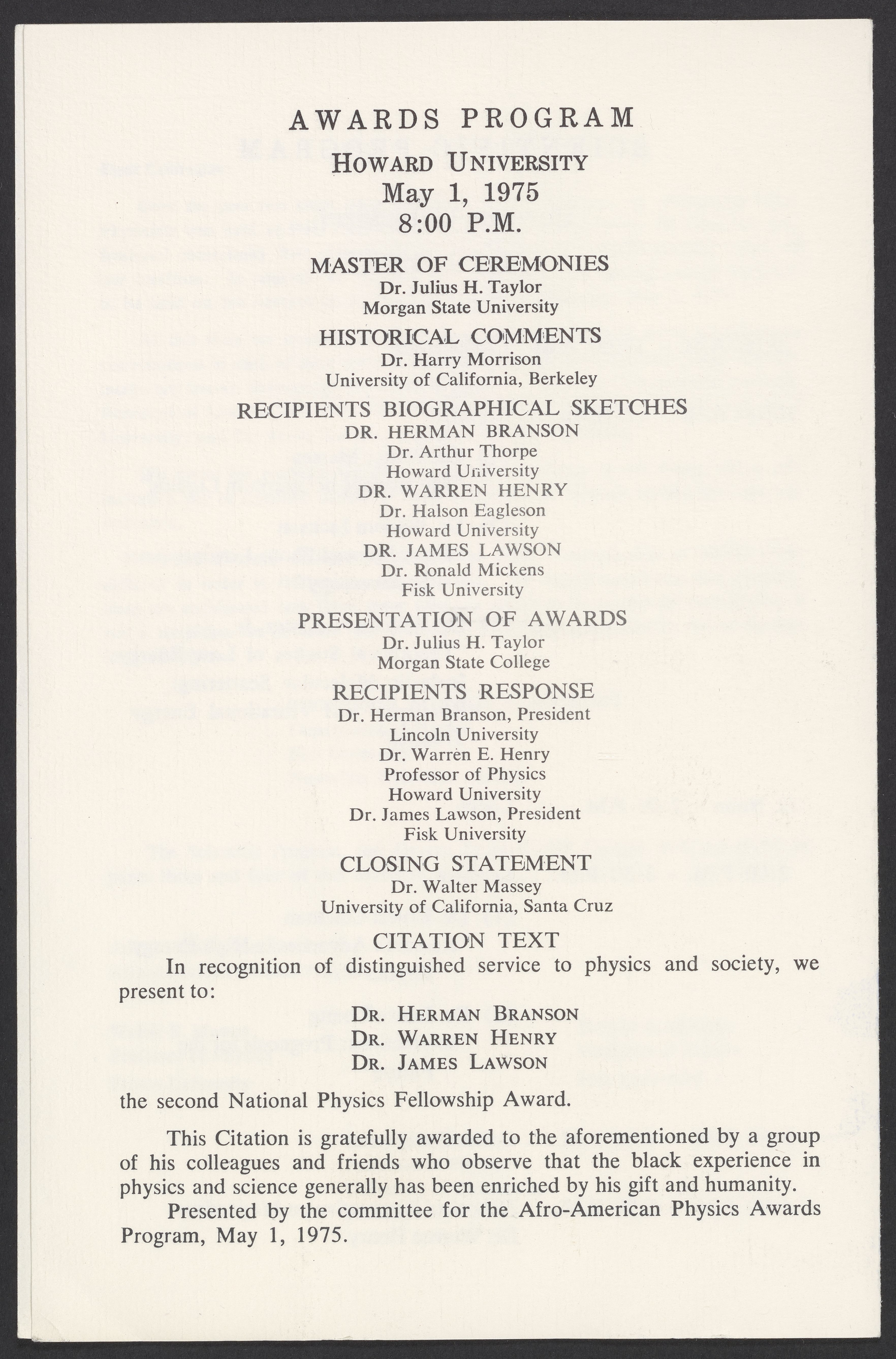 Committee for the Afro-American Physics Awards. “Second Awards Ceremony for Outstanding Black Physicists,” May 1, 1975. William A. Lester, Jr. Papers, Box 5, Folder 7. Science History Institute. Philadelphia. https://digital.sciencehistory.org/works/qqgp1ob.