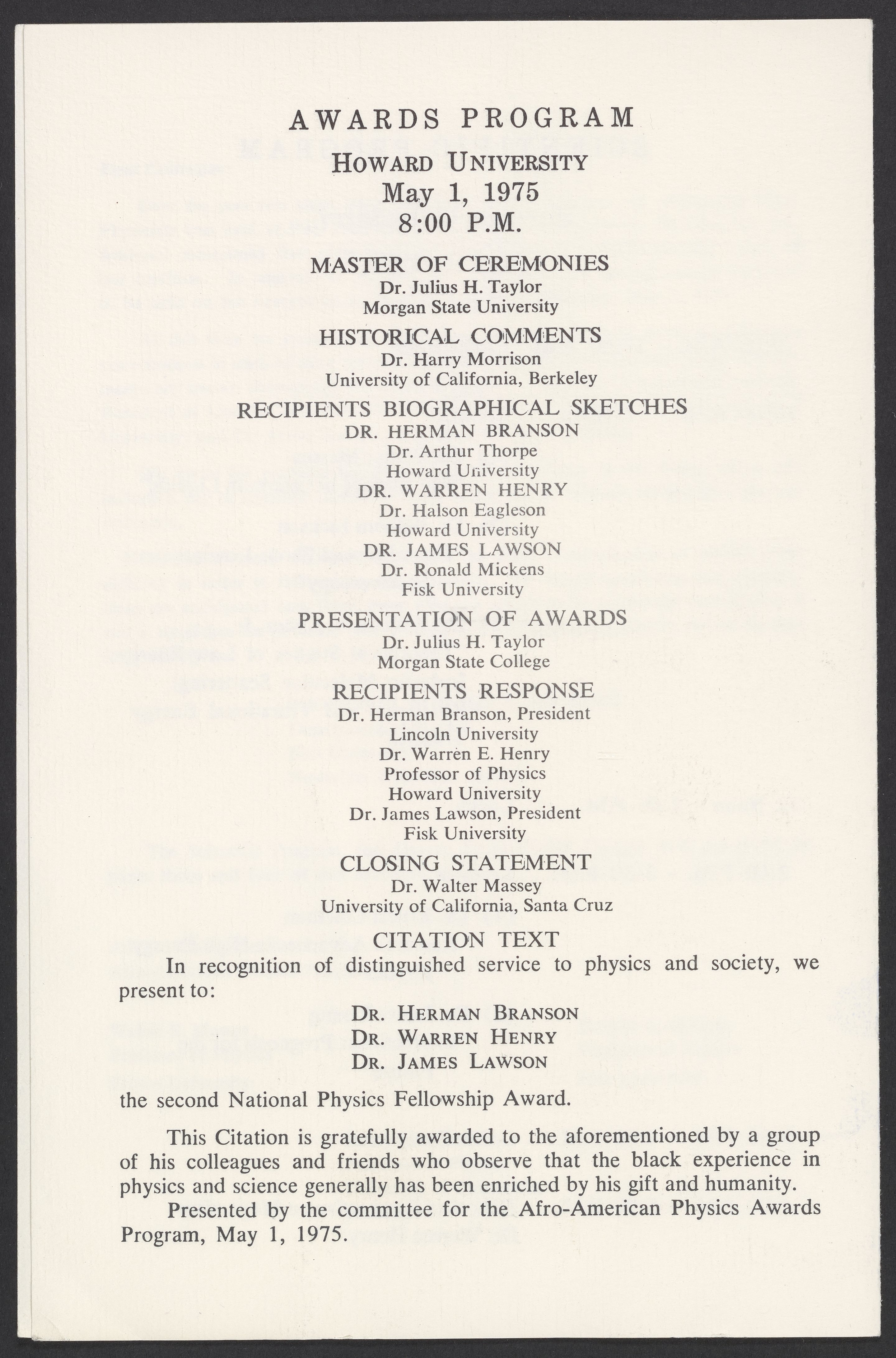Small JPG1200 x 1813px — 360 KBLarge JPG2880 x 4351px — 2.3 MBFull-sized JPG3527 x 5329px — 3.5 MBOriginal fileTIFF — 3527 x 5329px — 53.8 MBProgram for the second Awards Ceremony for Outstanding Black Physicists, held at Howard University on May 1, 1975. The award ceremony honored Herman Branson (1914-1995), Warren E. Henry (1909-2001), and James R. Lawson (1915-1996). The event included a "Scientific Program," with lectures by Walter E. Massey (1938-), William M. Jackson (1936-), William A. Lester, Jr. (1937-), Ernest Coleman (1943-1990), James E. Young, and Warren E. Henry.