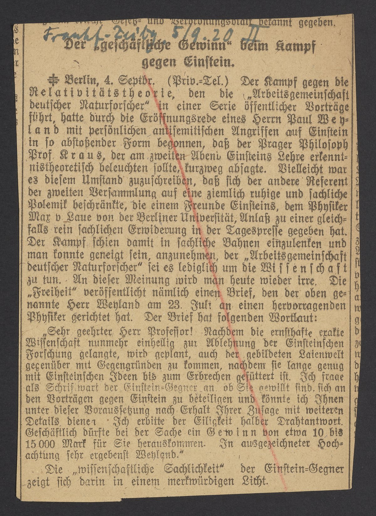 “Der Geschaftliche Gewinn Beim Kampf Gegen Einstein,” September 5, 1920. Papers of Georg and Max Bredig, Box 5, Folder 2. Science History Institute. Philadelphia. https://digital.sciencehistory.org/works/qqn7i99.