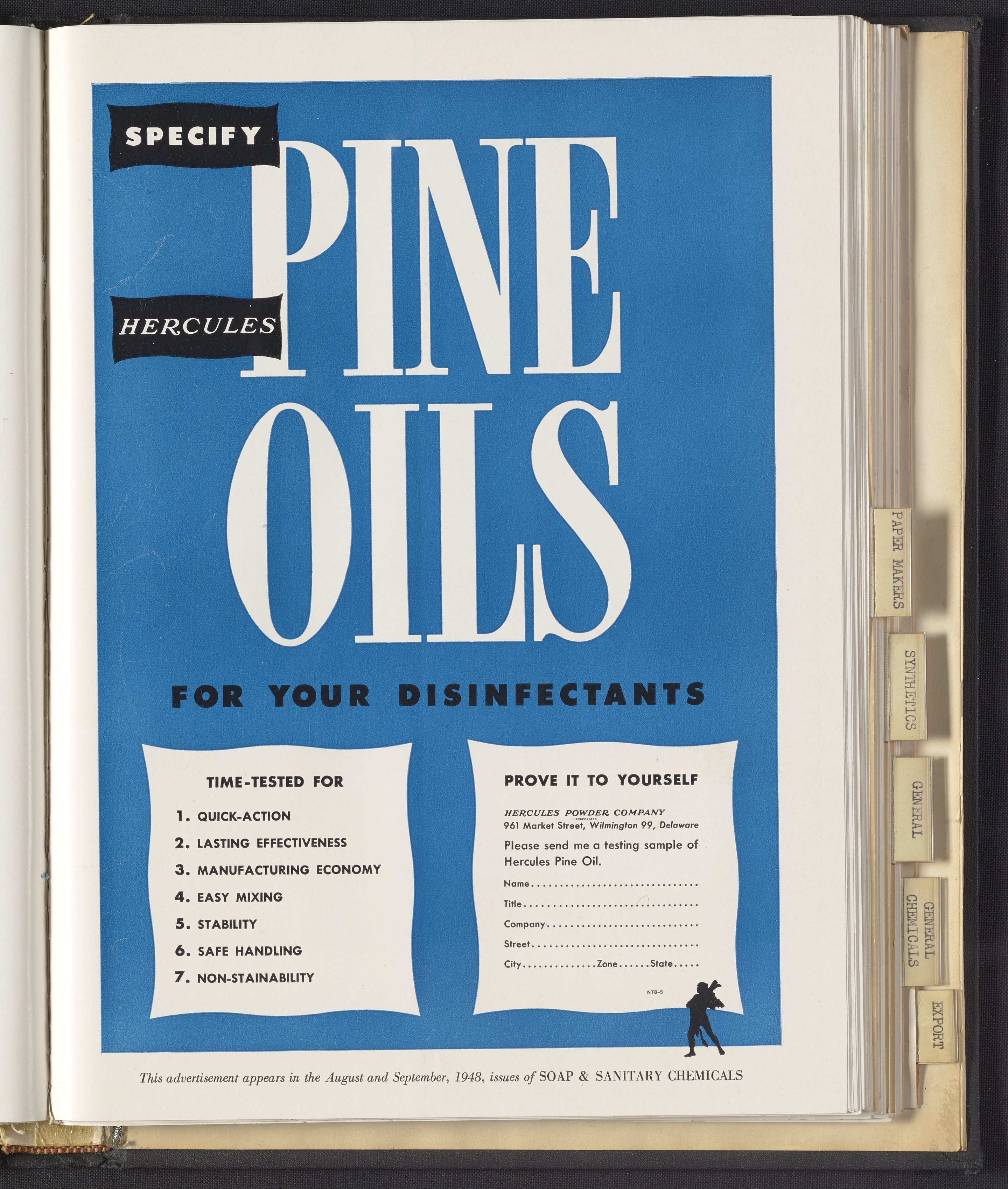 Hercules Incorporated. “Specify Hercules Pine Oils for Your Disinfectants.” 1948 Hercules Advertisements, 1948. Records of Hercules Incorporated, Volume 1948. Science History Institute. Philadelphia. https://digital.sciencehistory.org/works/qr46r157m.