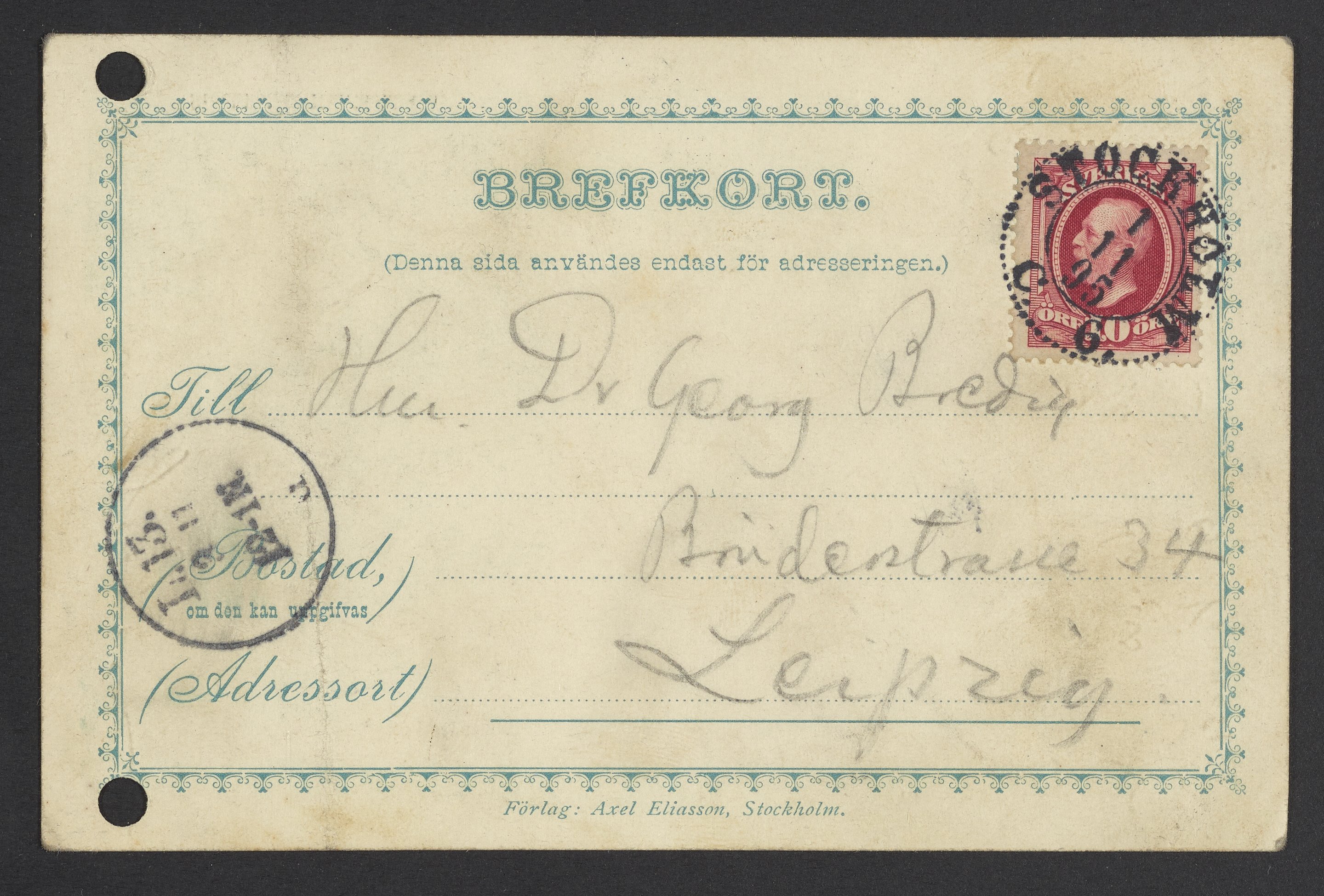 “Postcard Sent to Georg Bredig of the Katarina Elevator,” 1895. Papers of Georg and Max Bredig, Box 22. Science History Institute. Philadelphia. https://digital.sciencehistory.org/works/qsxbzsj.