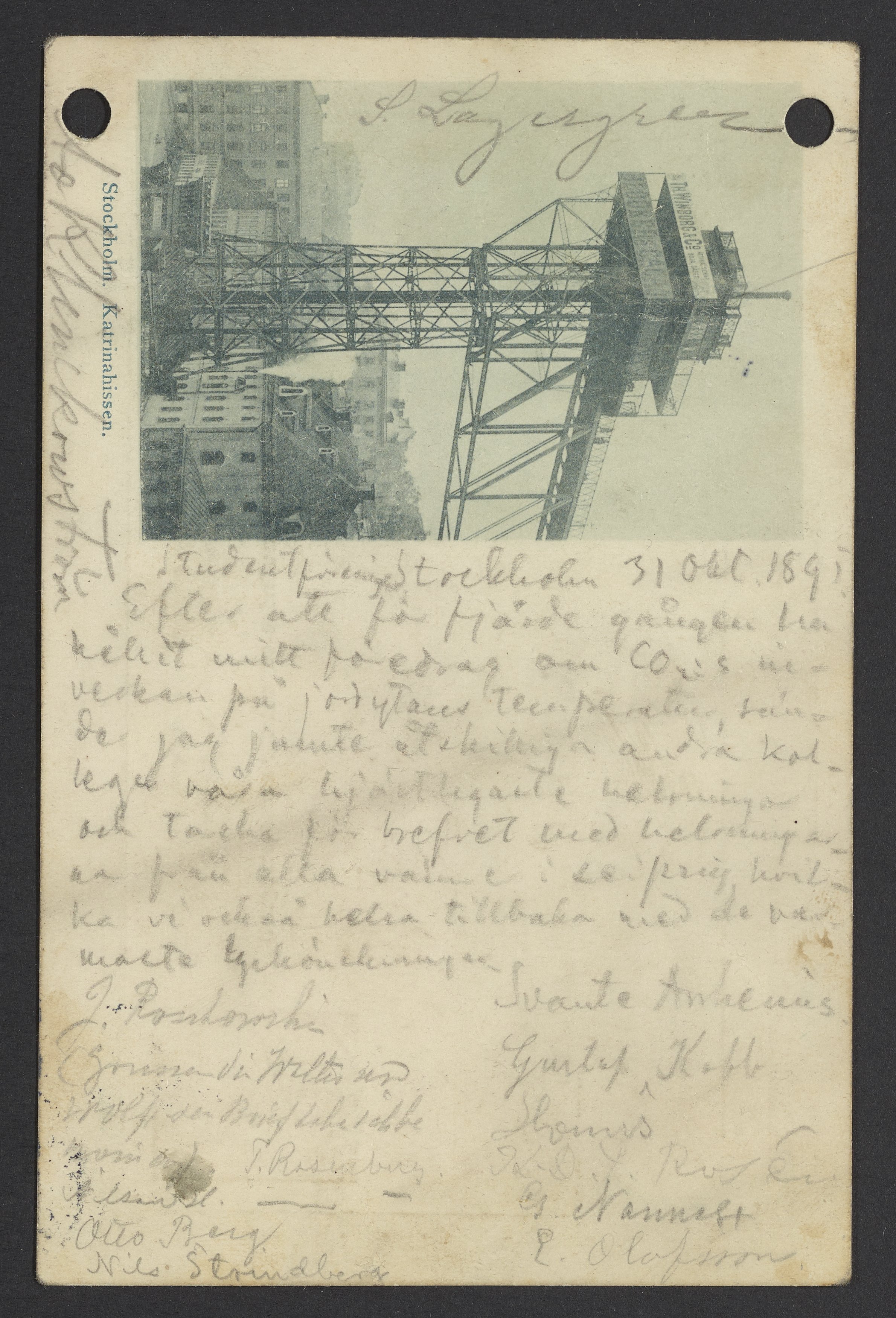 Small JPG1200 x 812px — 181 KBLarge JPG2880 x 1949px — 975 KBFull-sized JPG3514 x 2378px — 1.4 MBOriginal fileTIFF — 3514 x 2378px — 24.0 MBPostcard of the Katarina Elevator in Stockholm, Sweden. The postcard, sent to Georg Bredig (1868-1944), is signed by well-known scientists such as Svante Arrhenius (1859-1927), Astronomer Gustav Kobb, Otto Berg (1873 -1939), and Nils Strindberg (1872-1897).