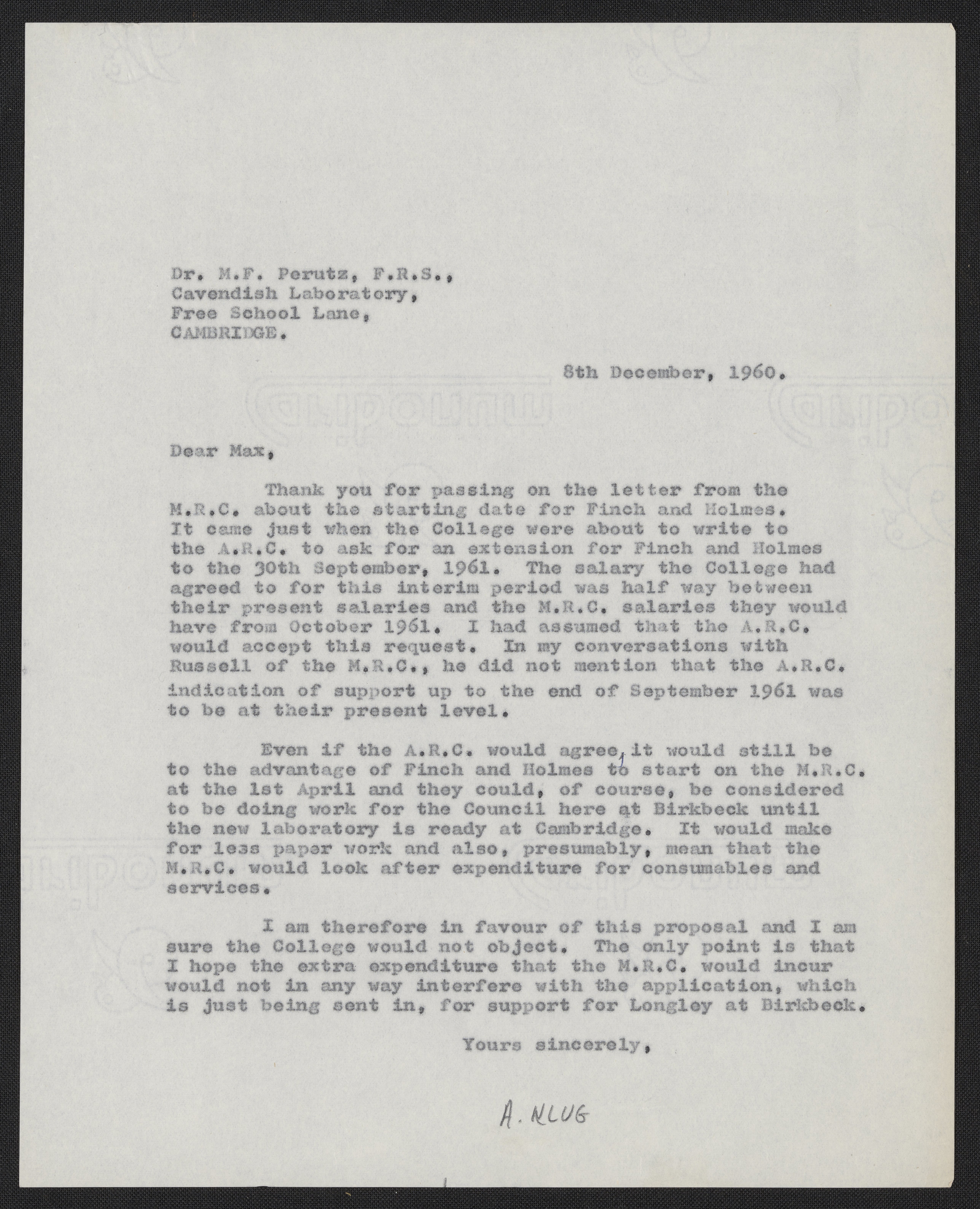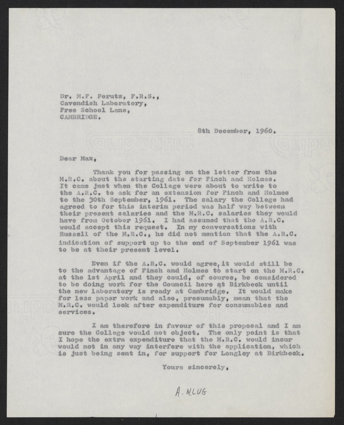 Letter from Aaron Klug to Max Perutz, December 8, 1960