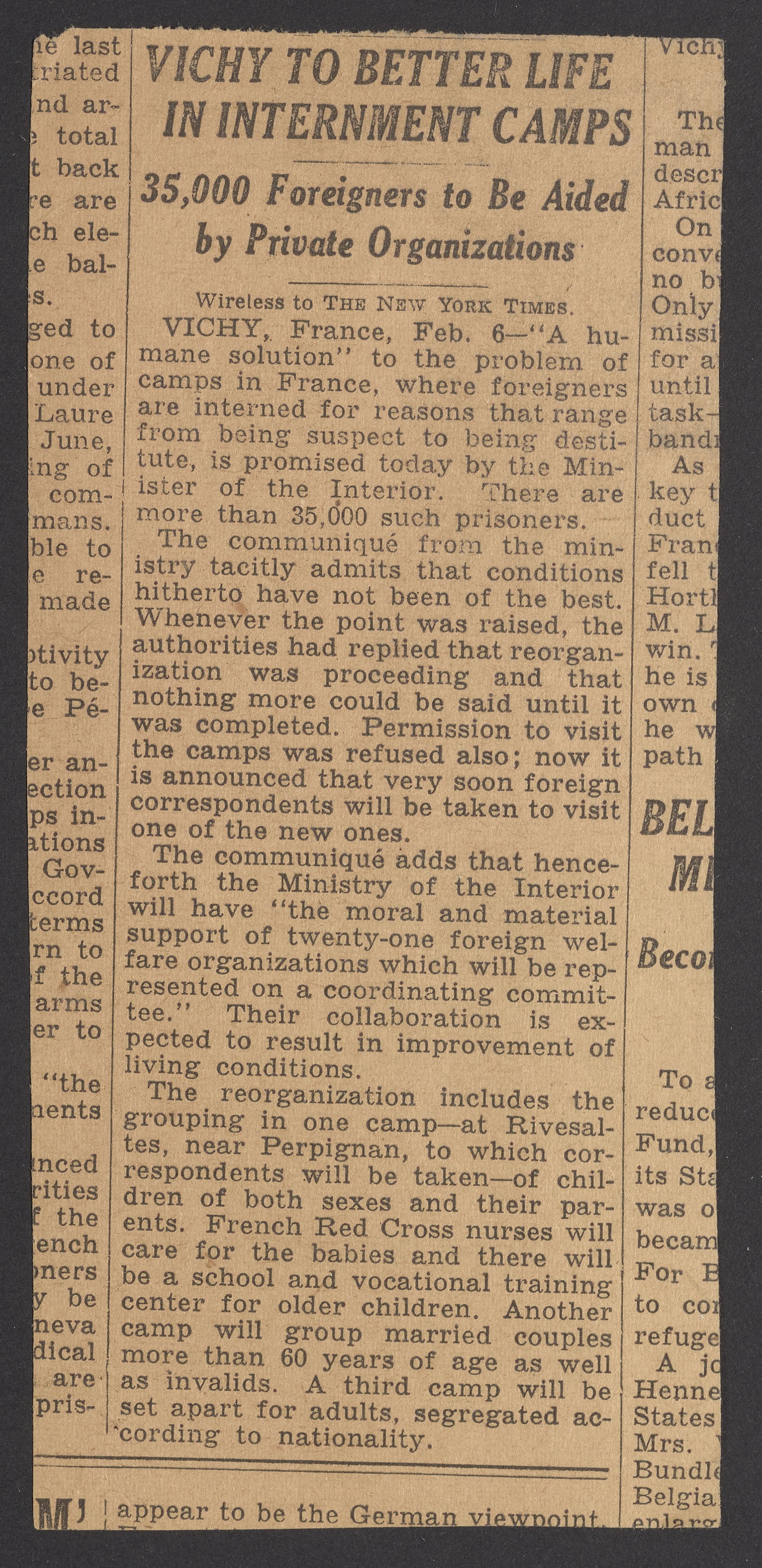 “Vichy to Better Life in Internment Camps.” New York, New York: New York times, February 7, 1941. Papers of Georg and Max Bredig, Box 10, Folder 24. Science History Institute. Philadelphia. https://digital.sciencehistory.org/works/qu5d9p2.